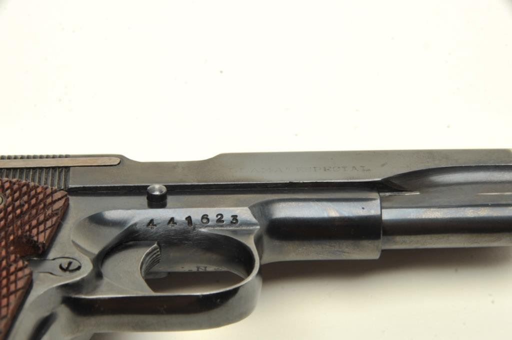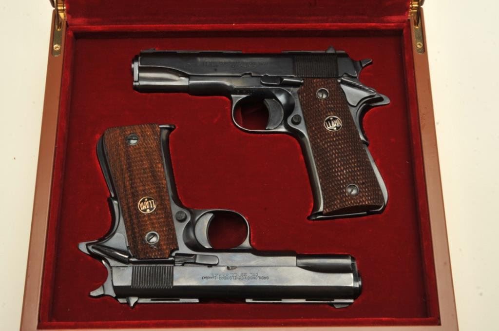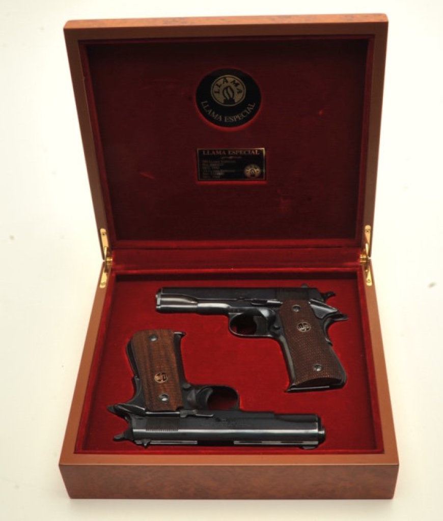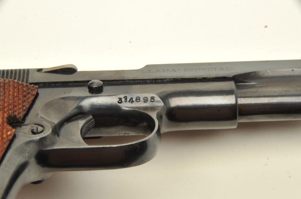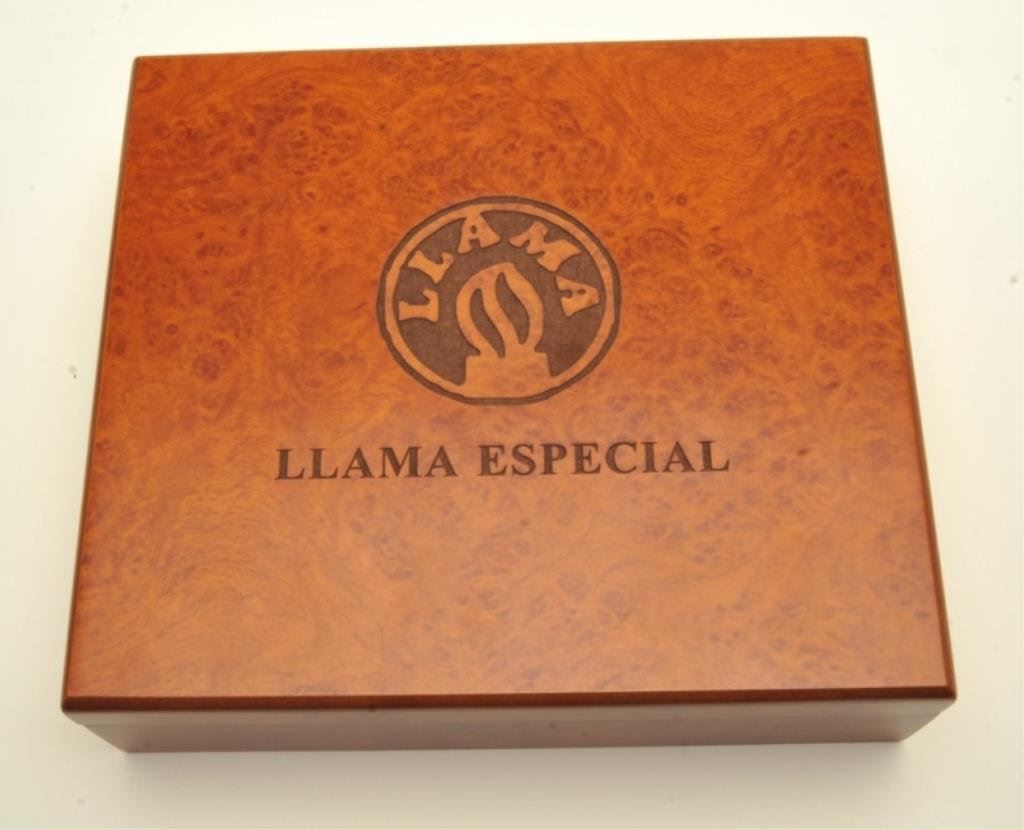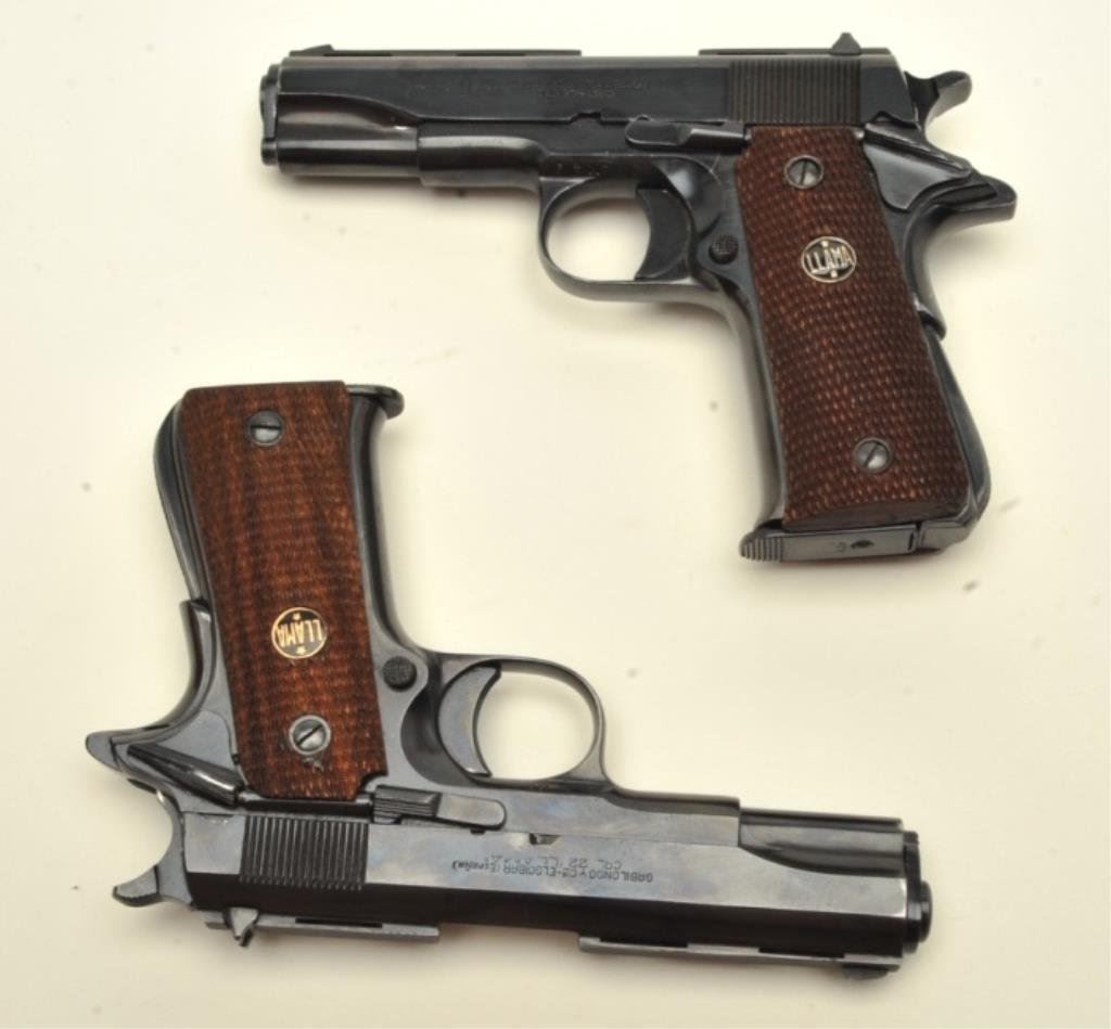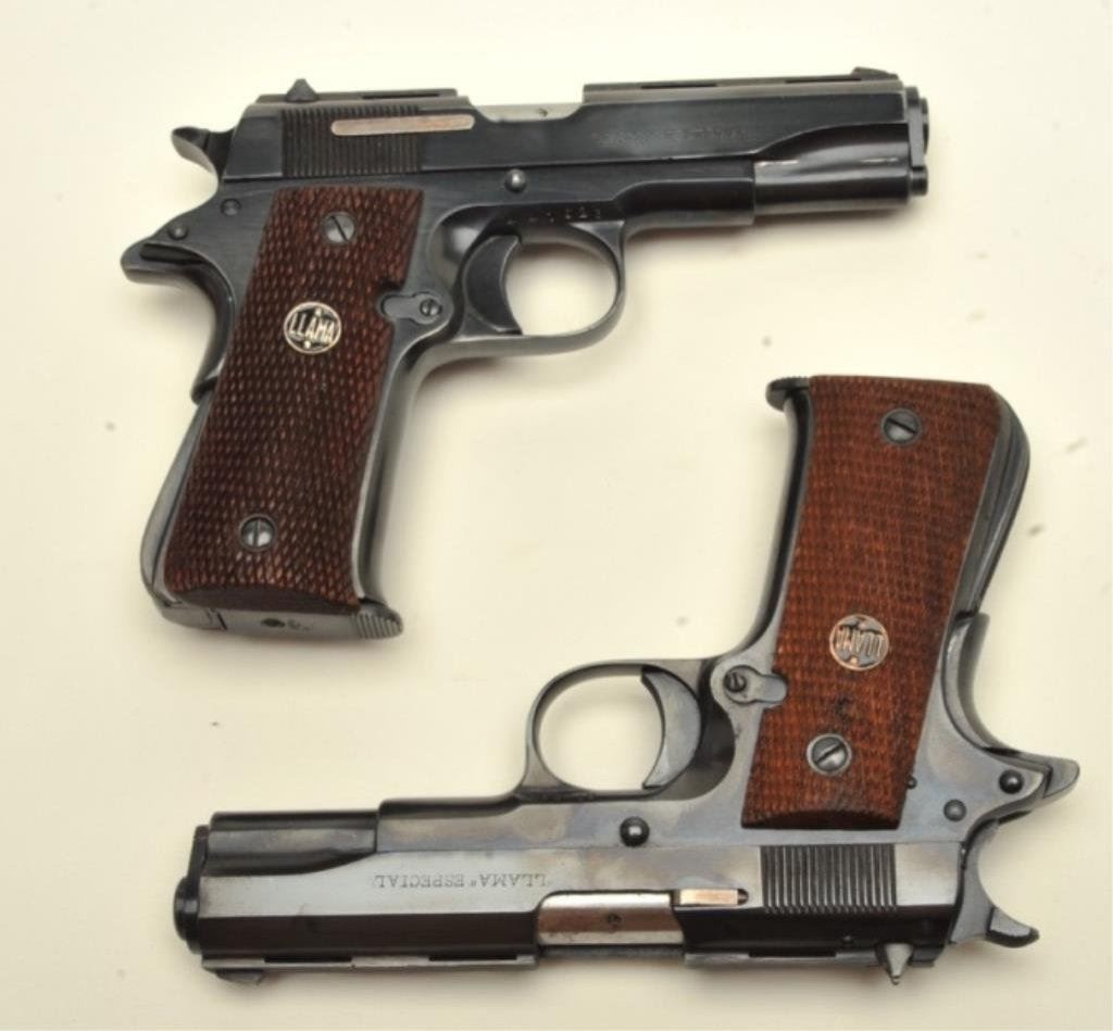 Llama Especial Model semi-automatic pistols, one is .380 caliber, 3.75” barrel, blued finish, checkered wood medallion grips, S/N 441623, in excellent overall condition with very slight high point wear; the other is .22 caliber, 3.75” barrel, blued finish, checkered wood medallion grips, S/N 314895, and is also in excellent condition with very slight high point wear. (Modern/PPT). Est.: $600-$1,200.