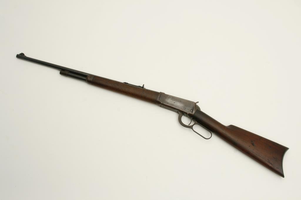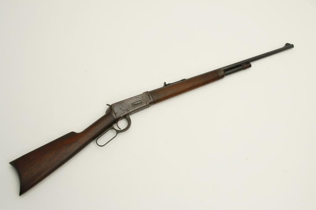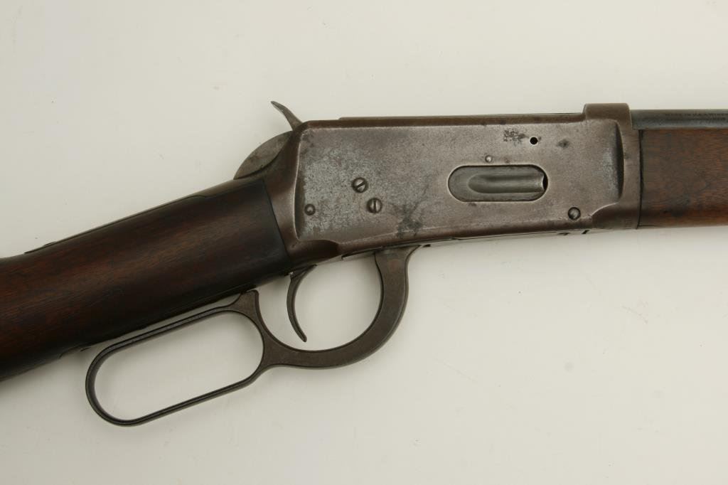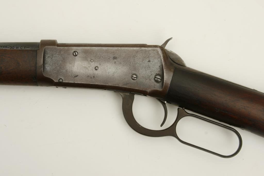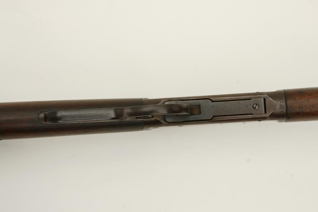 caliber, serial #131104. The rifle is in good to nearly very good overall condition with a 22” barrel featuring a ramp front and buckhorn rear sights. The barrel and half magazine tube retain the majority of their original blued finish while the receiver shows approximately 20-30% of its thinning blued finish with the remainder going to a brown patina. The smooth wood stocks show considerable use with small mars and compressions. The butt stock ends with a smooth, metal crescent butt plate. The bore is good, the action crisp and markings are sharp. (C+R) Est.: $600-$1,200.