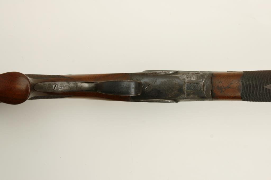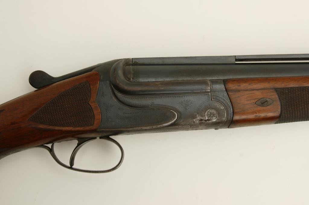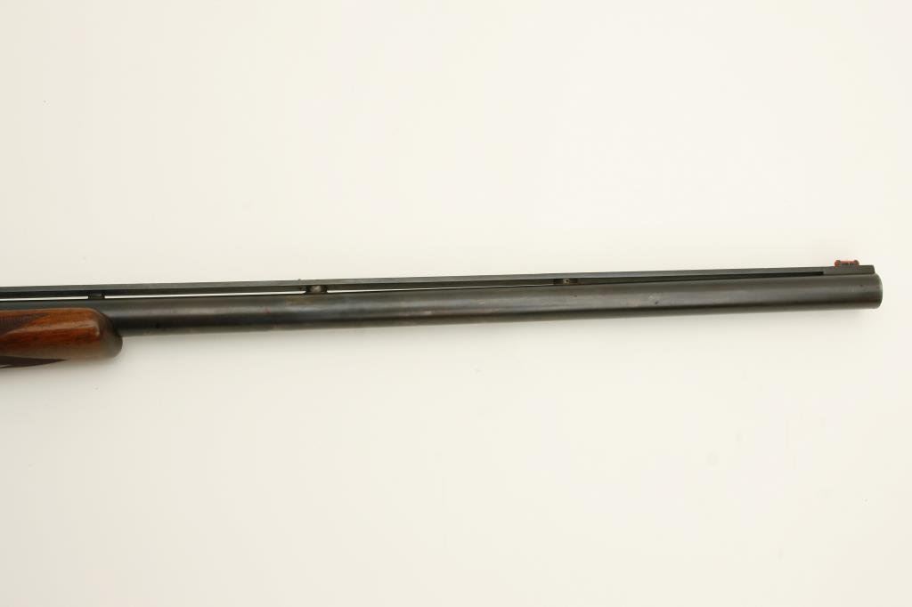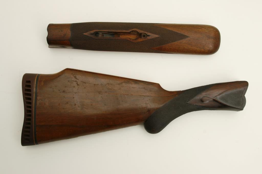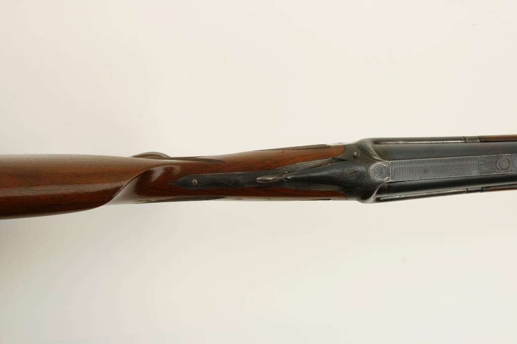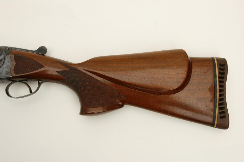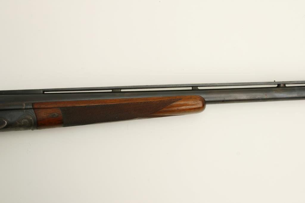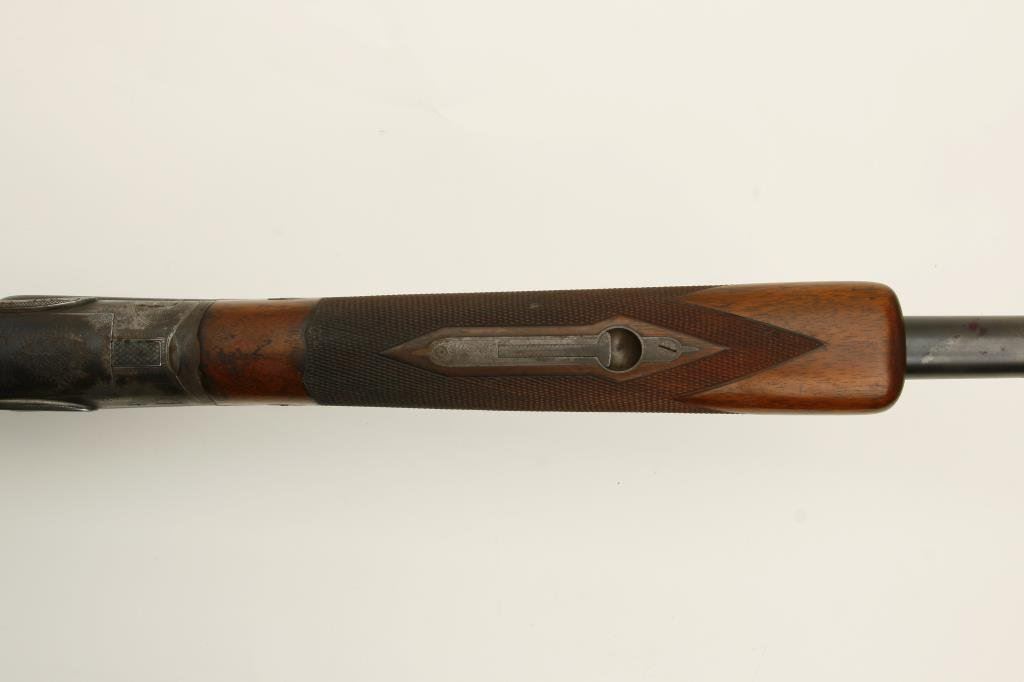 30” ventilated rib barrel, blued finish, checkered wood stocks with red hard rubber butt pad, S/N 2022, in overall good condition showing considerable blue finish remaining, old repair to one of the ventilated rib supports, clean bore, good action, markings and wood; accompanied by an extra checkered wood butt stock that shows an old repair and checkered wood forend. (C&R). Est.: $750-$1,500.