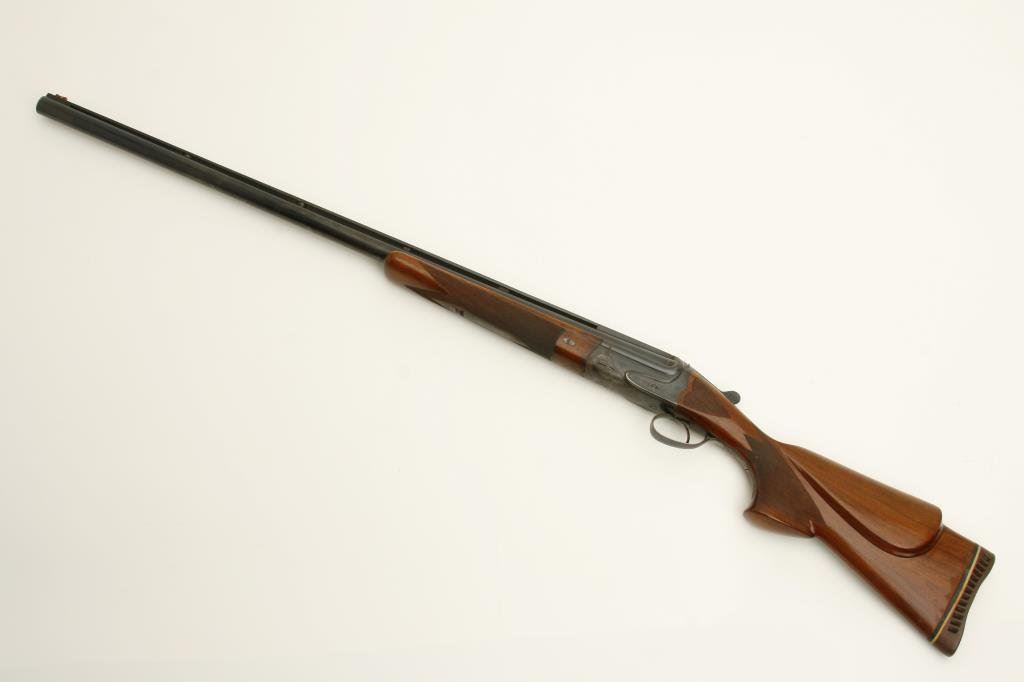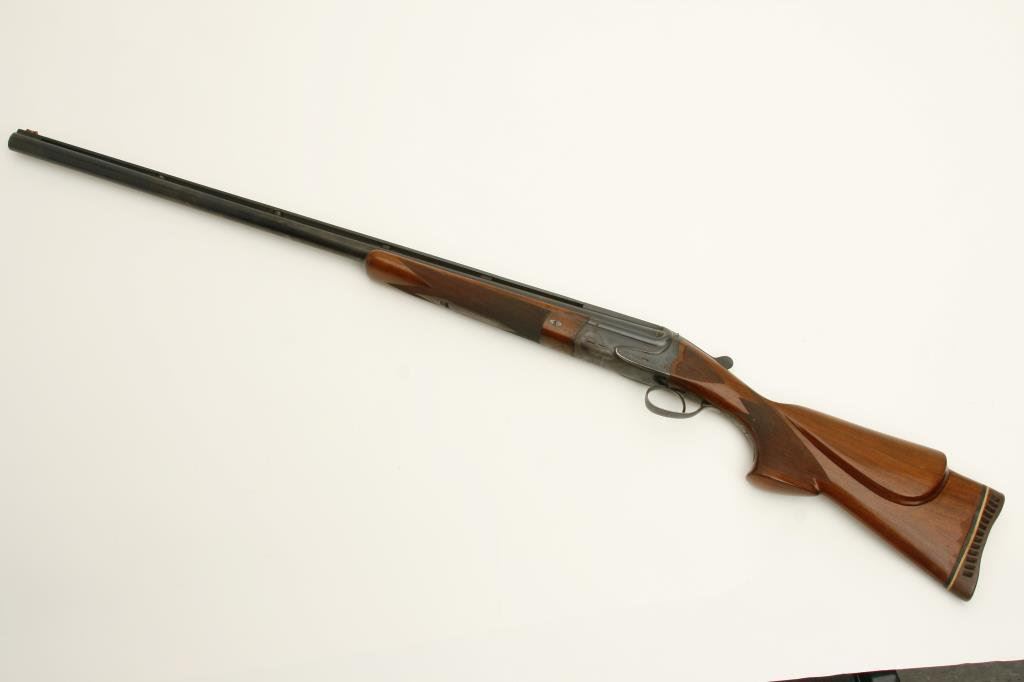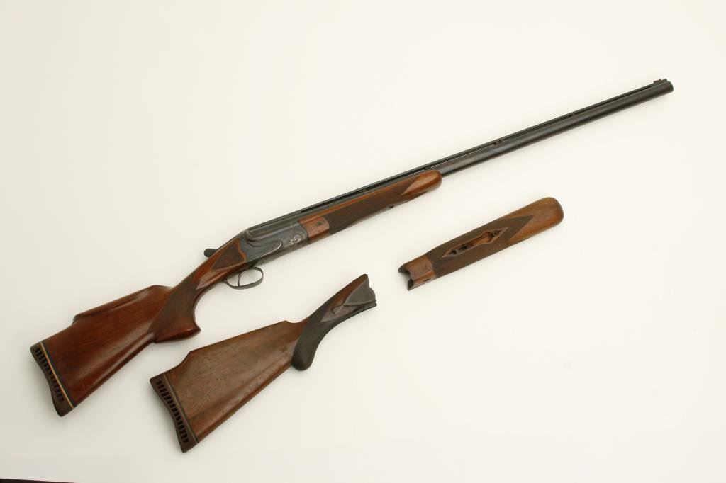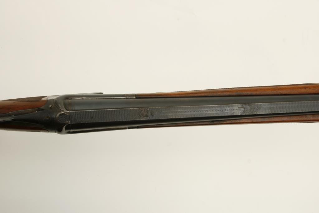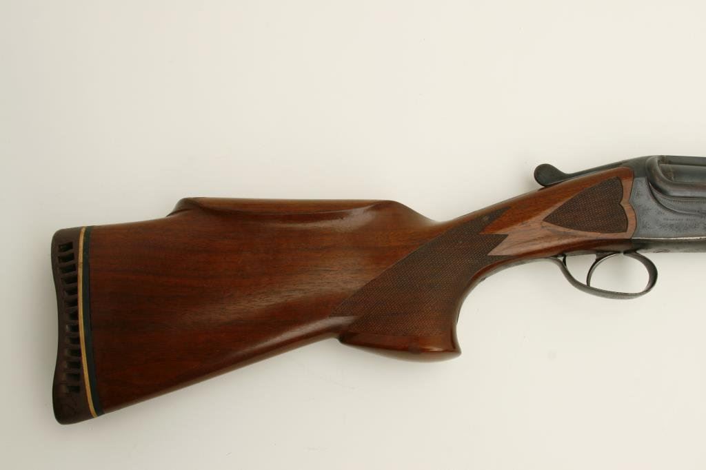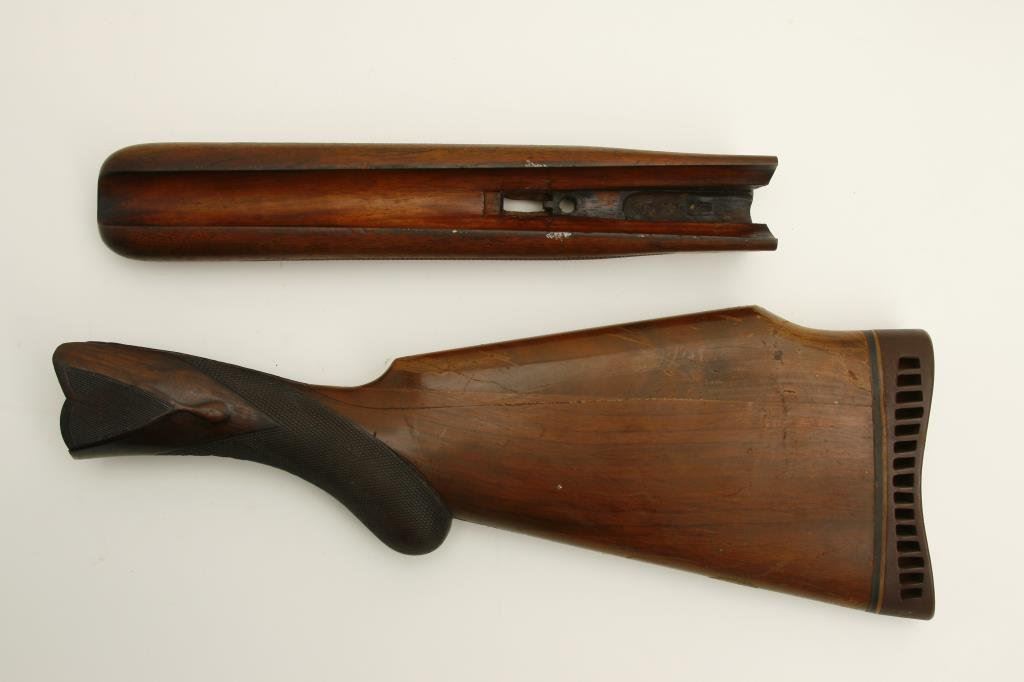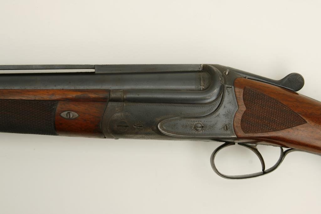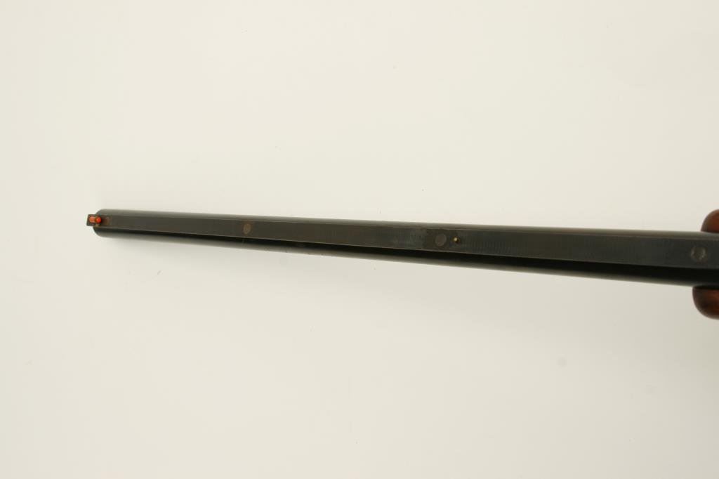 30” ventilated rib barrel, blued finish, checkered wood stocks with red hard rubber butt pad, S/N 2022, in overall good condition showing considerable blue finish remaining, old repair to one of the ventilated rib supports, clean bore, good action, markings and wood; accompanied by an extra checkered wood butt stock that shows an old repair and checkered wood forend. (C&R). Est.: $750-$1,500.