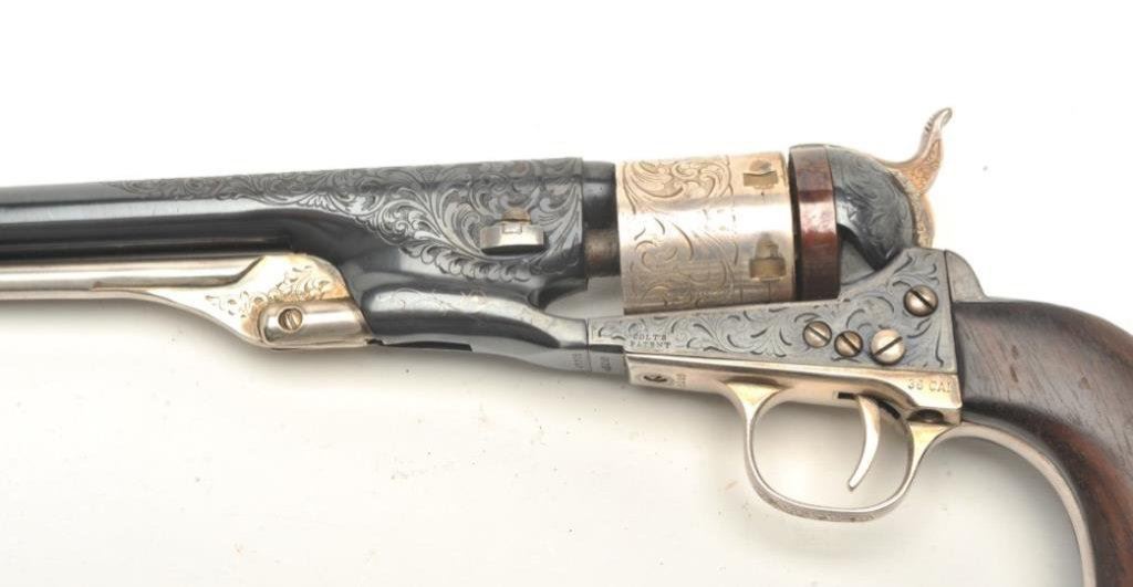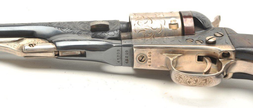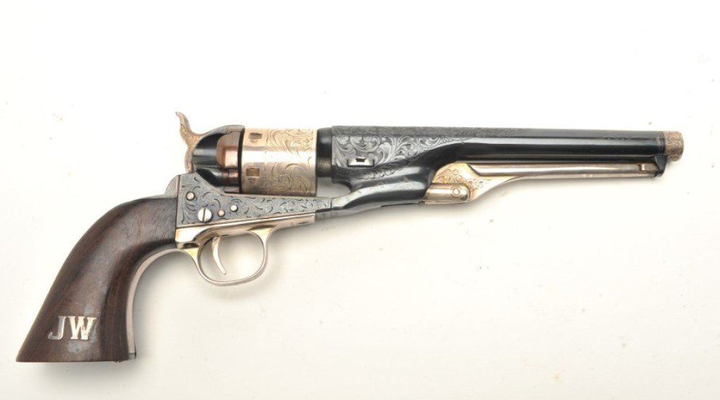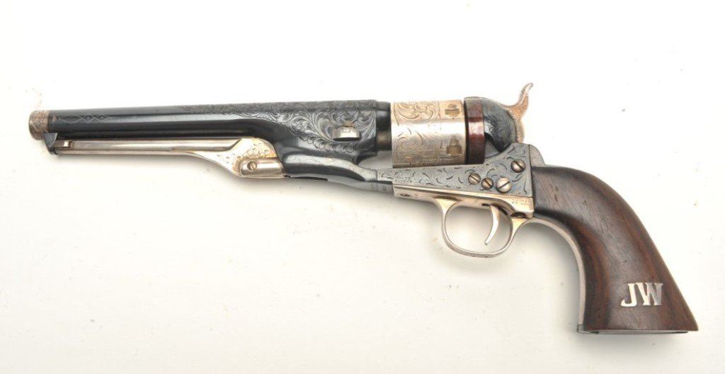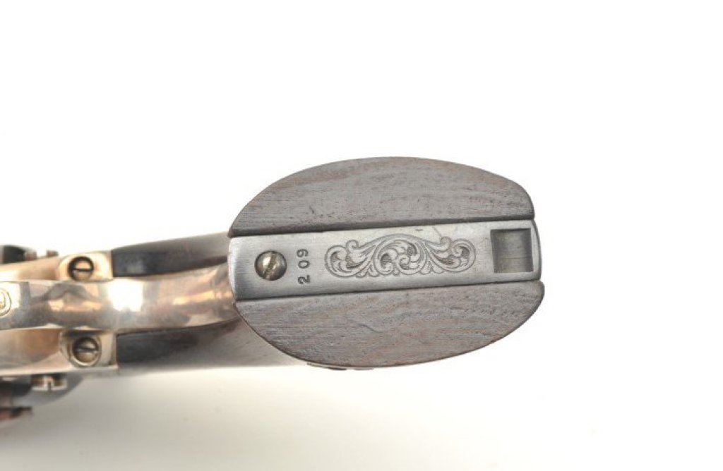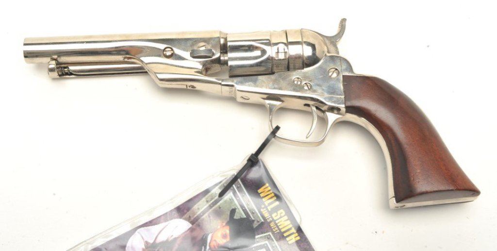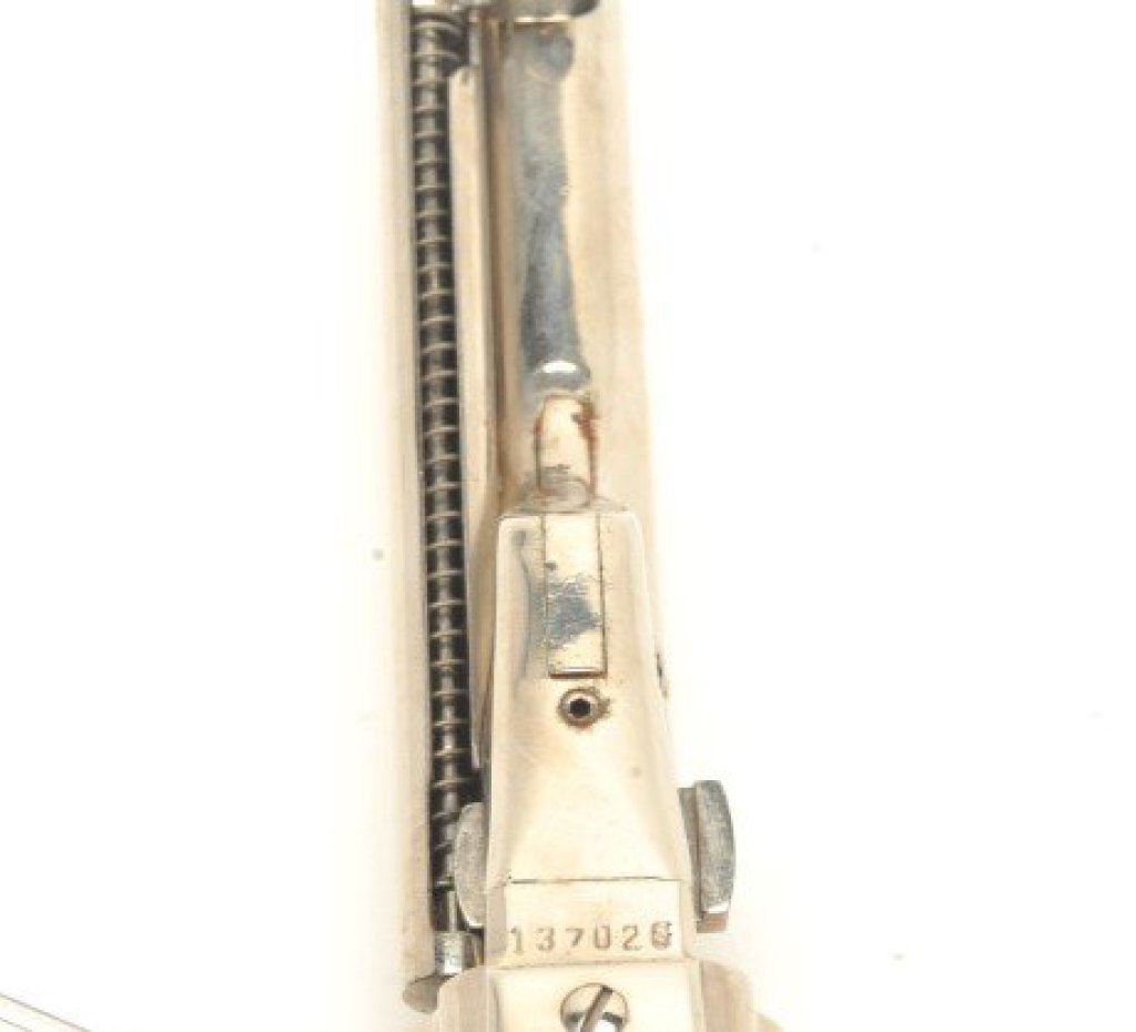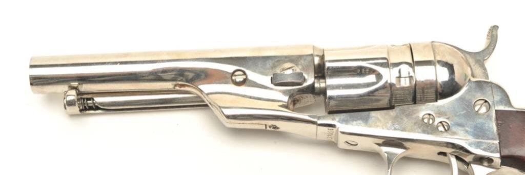 4 ¾” barrel showing nickel finish and wood grips. Used by Will Smith in “Wild,Wild,West” with photo of him and the pistol. See “The World Famous Stembridge Armory Collection, June 5, 2007” where it is illustrated. Est.: $1000-$2000