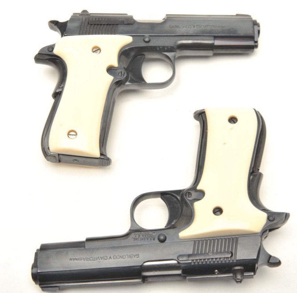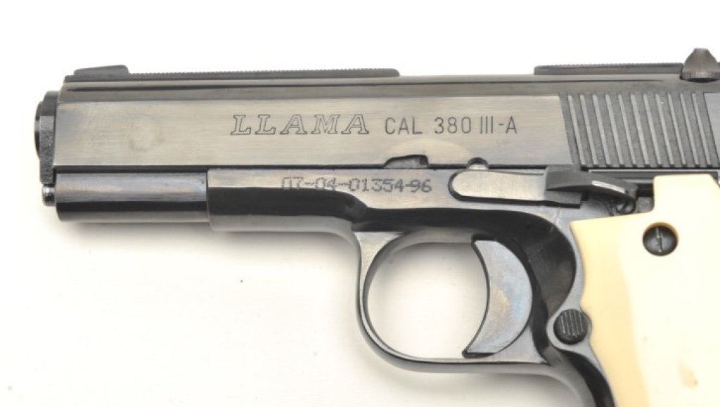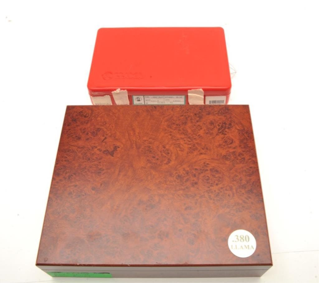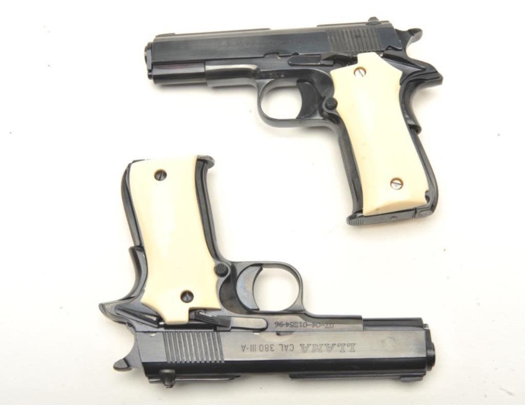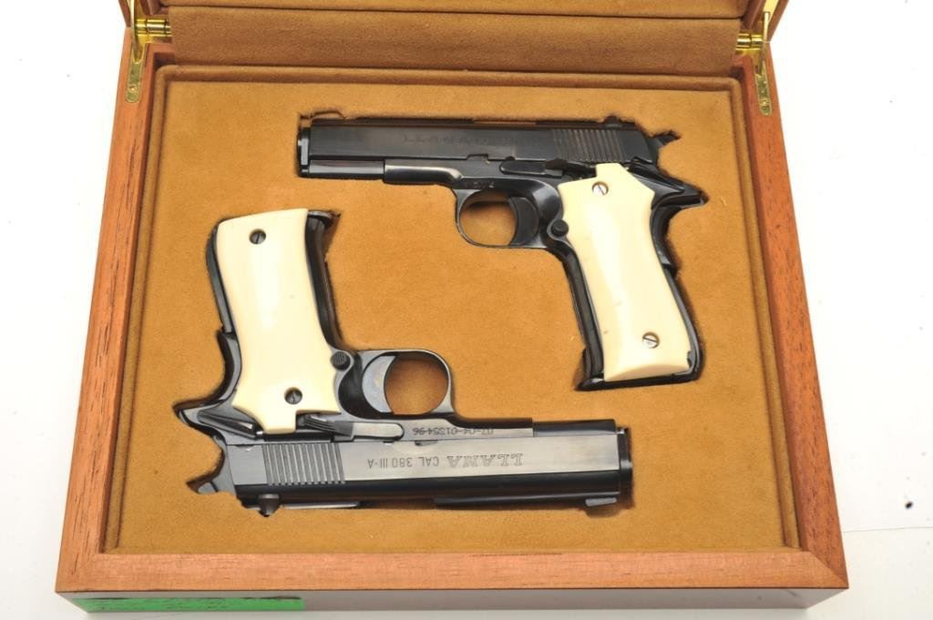 of Llama Model III-A semi-automatic pistols, .380 caliber, 3.75” barrels, blued finish, simulated ivory grips, S/N C28757 and import-marked S/N 07-04-01354-96, both in overall excellent condition; accompanied by one factory hard case. (Modern/PPT). Est.: $750-$1,500.