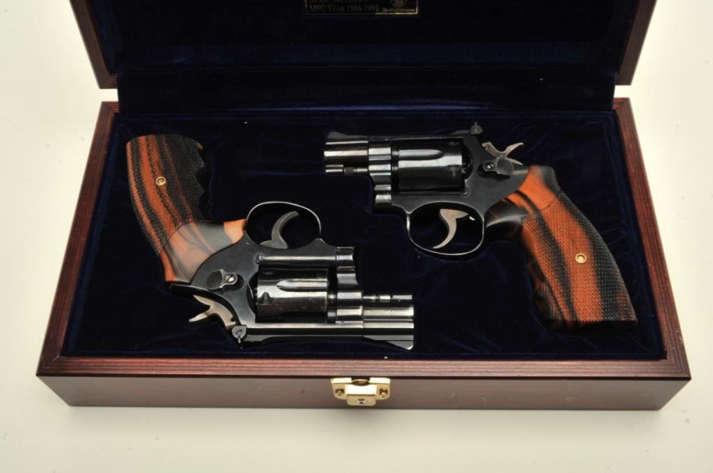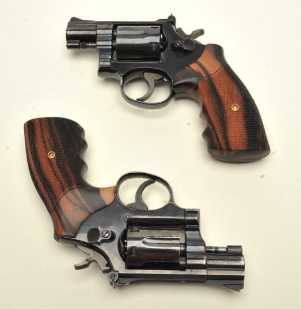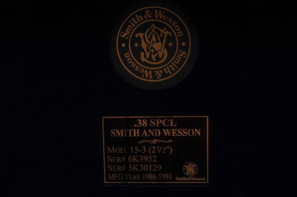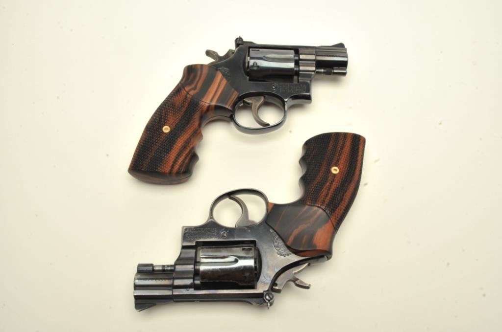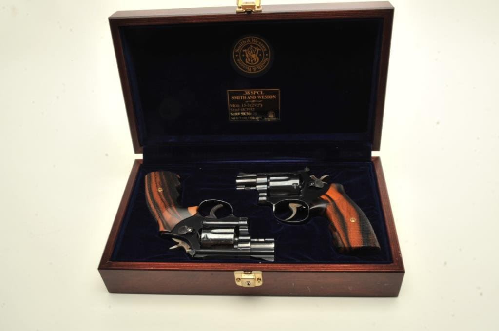 Smith & Wesson Model 15-3 DA revolvers, .38 Special caliber, desirable 2” barrels, blued finish, custom checkered deluxe wood grips; S/N 5K30129 is in overall excellent condition showing little use; S/N 6K3954 is in fine overall condition with the majority of its original blue, some holster and high point wear with some scattered scratches around the cylinder. (Modern/PPT). Est.: $1,000-$2,000.