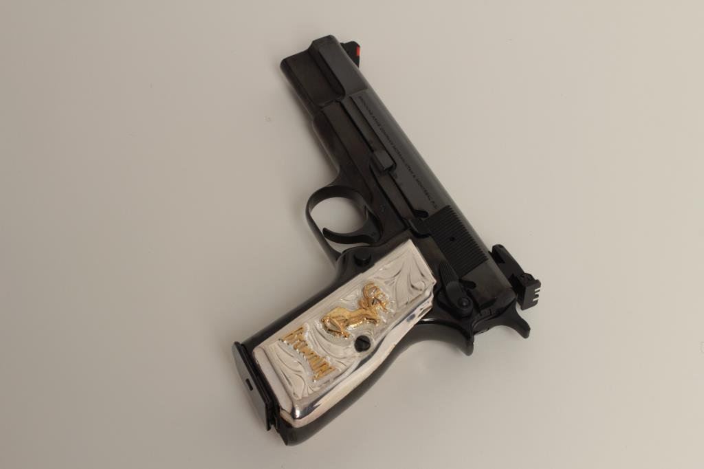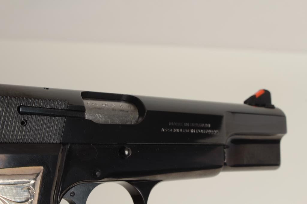 pistol, .40 caliber, S/N 513MY52663, black finish, adjustable sights, gold and silver custom grips, 10 round magazine, Sport Model (discontinued); ambidextrous safety; in overall excellent condition showing fine bore, crisp action, sharp markings and beautiful custom grips. Also accompanied by factory grey hard case (Modern/PPT). Est.: $1,000-$2,000.