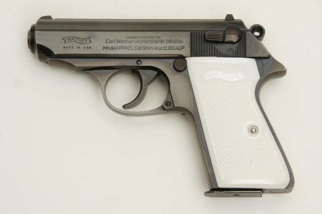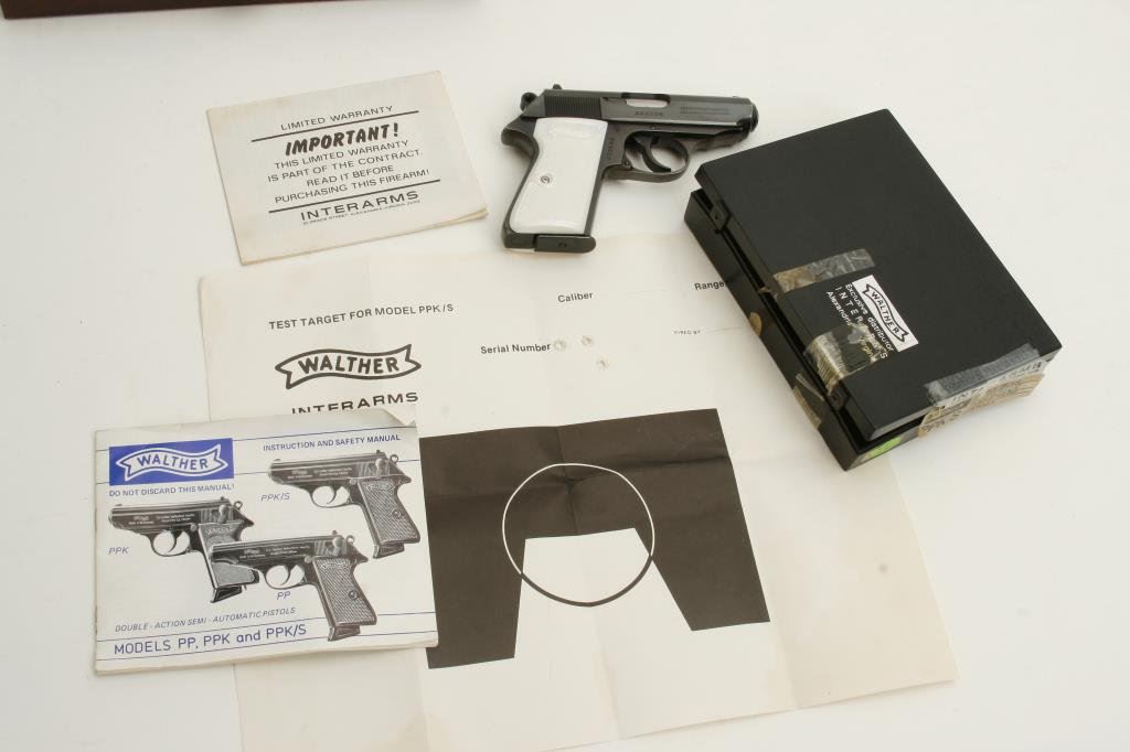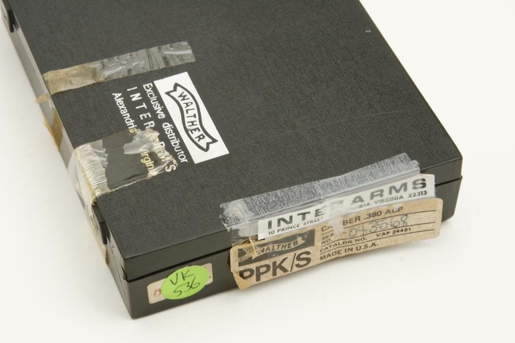 Model PPK/S DA semi-automatic pistols, .380 caliber, 3.25” barrels, S/Ns 043568 & 015718, blued finish, checkered grips, in overall near new condition. Accompanied by a factory hard case for S/N 043568. (Modern/PPT). Est.: $1,000-$2,000.