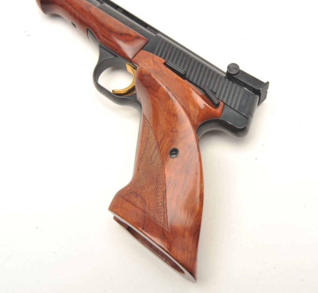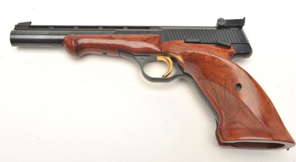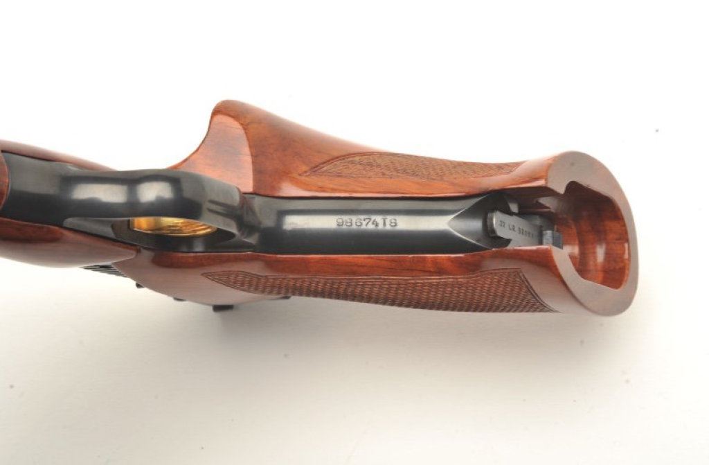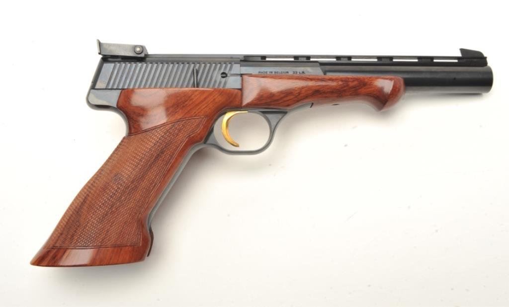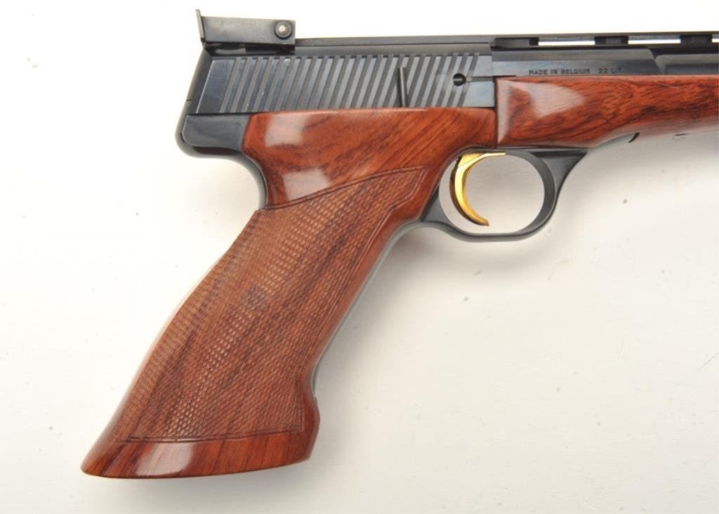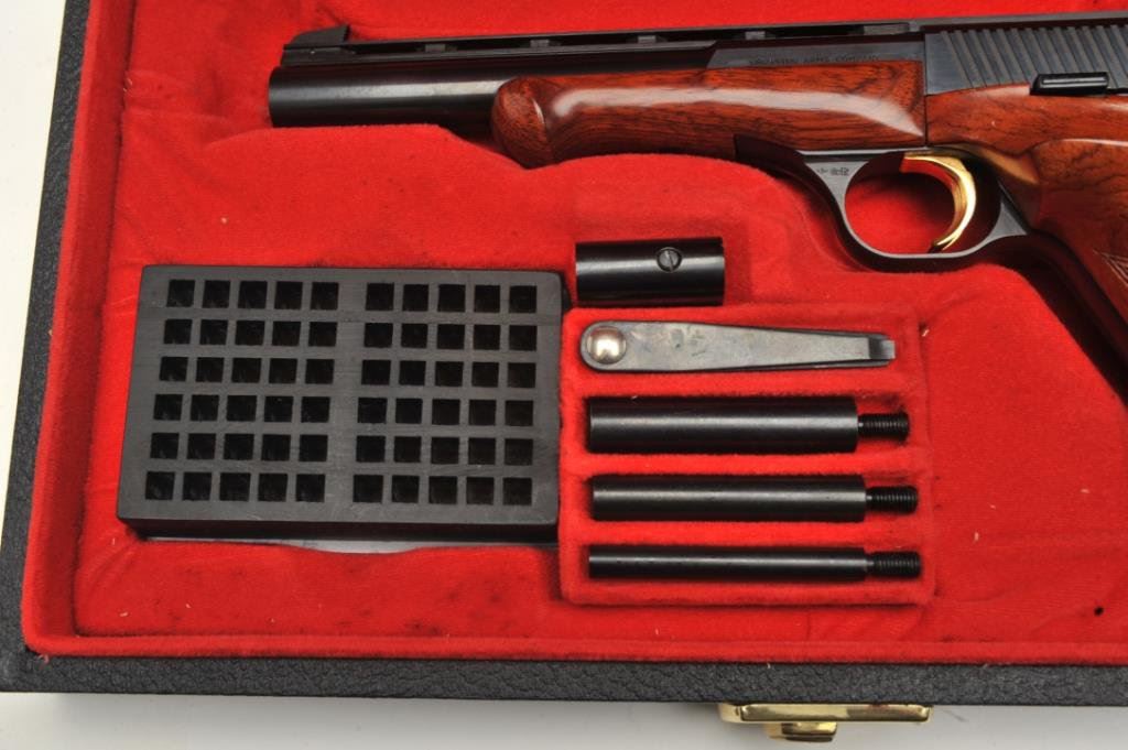 6.75” barrel, blued finish, gold trigger, checkered wood target grips, S/N 98674T8, with set of barrel weights, screwdriver and takedown tool; near mint condition overall. Consignor reports this Browning was purchased from the nephew of John Phillip Law (1937-2008) who inherited it from Law’s estate. Law was a well-known American actor who starred in many motion pictures including “spaghetti Westerns” and science fiction movies like “Barbarella”. (Modern/PPT). Est.: $1,000-$2,000.