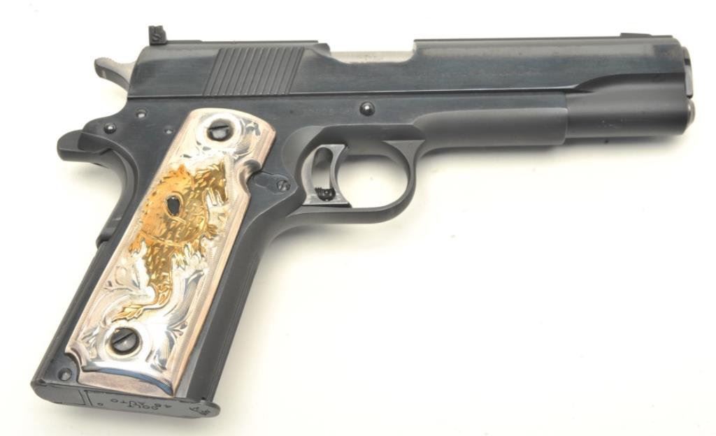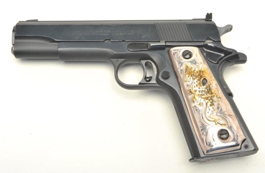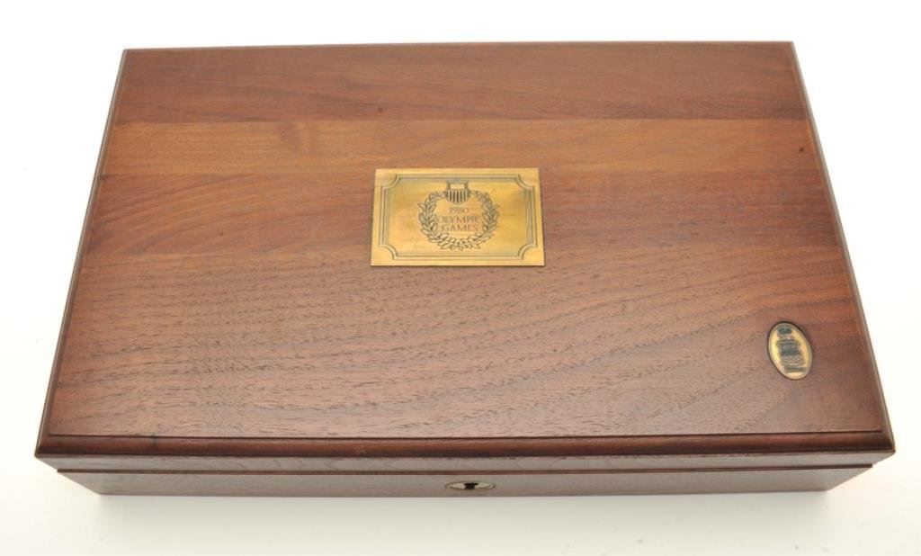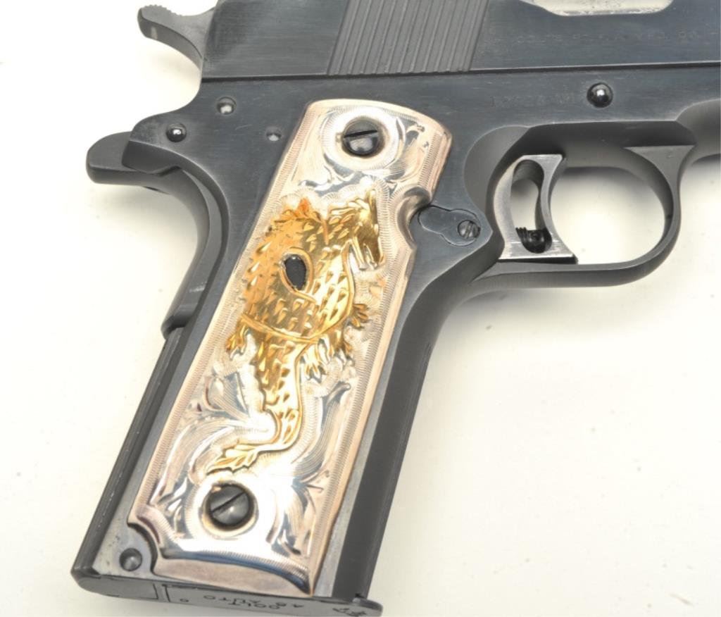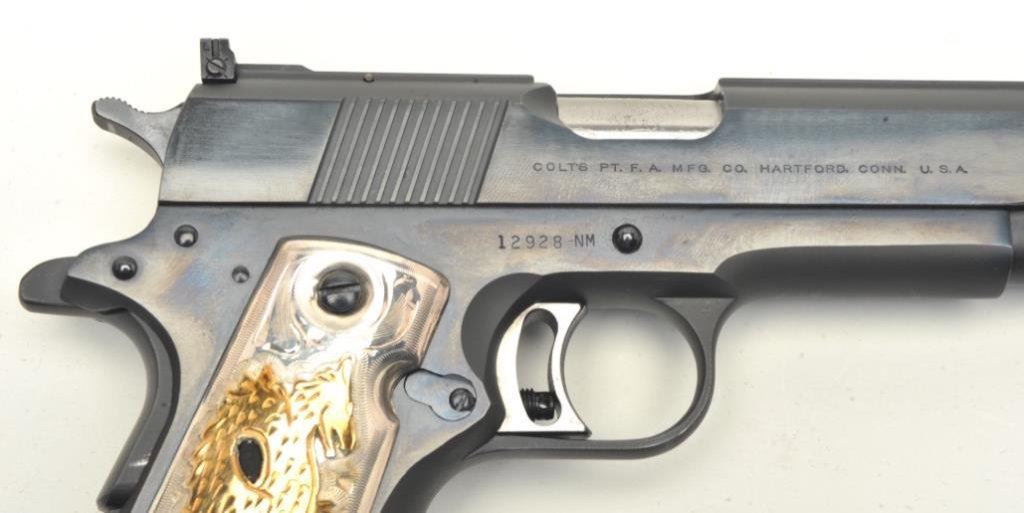 .45 caliber, 5” barrel, blued finish, custom silver and gold dragon emblem grips, S/N 12928-NM, in excellent overall condition showing minimal use or handling; case is of Colt manufacture and there is an inlaid brass plaque on the lid “1980 Olympic Games”. (Modern/PPT). Est.: $1,250-$2,500.