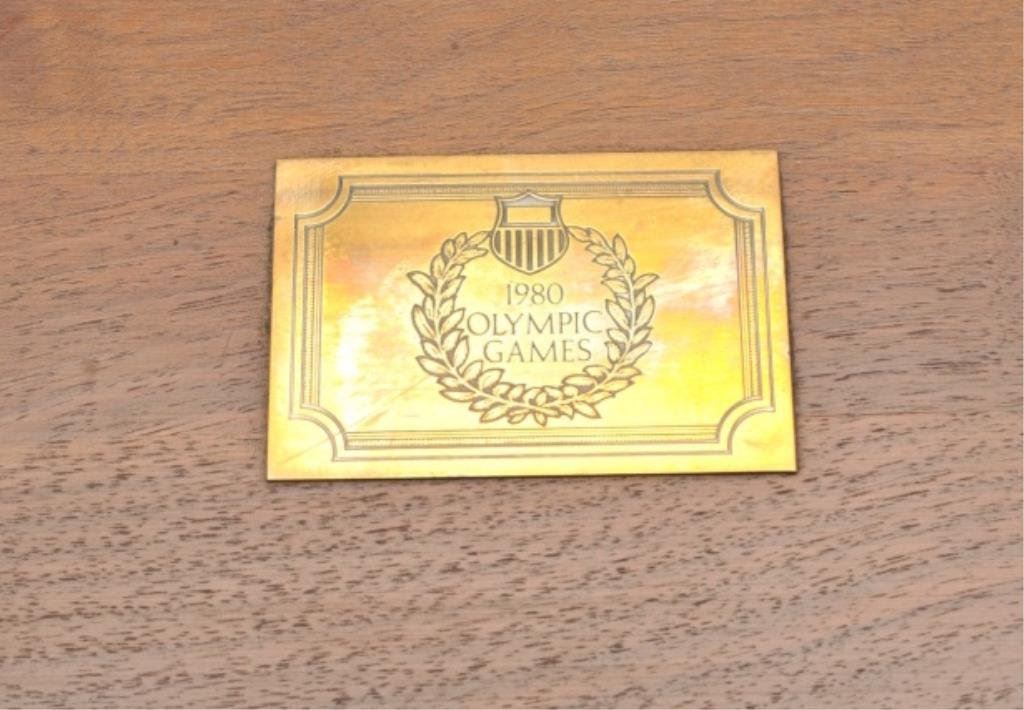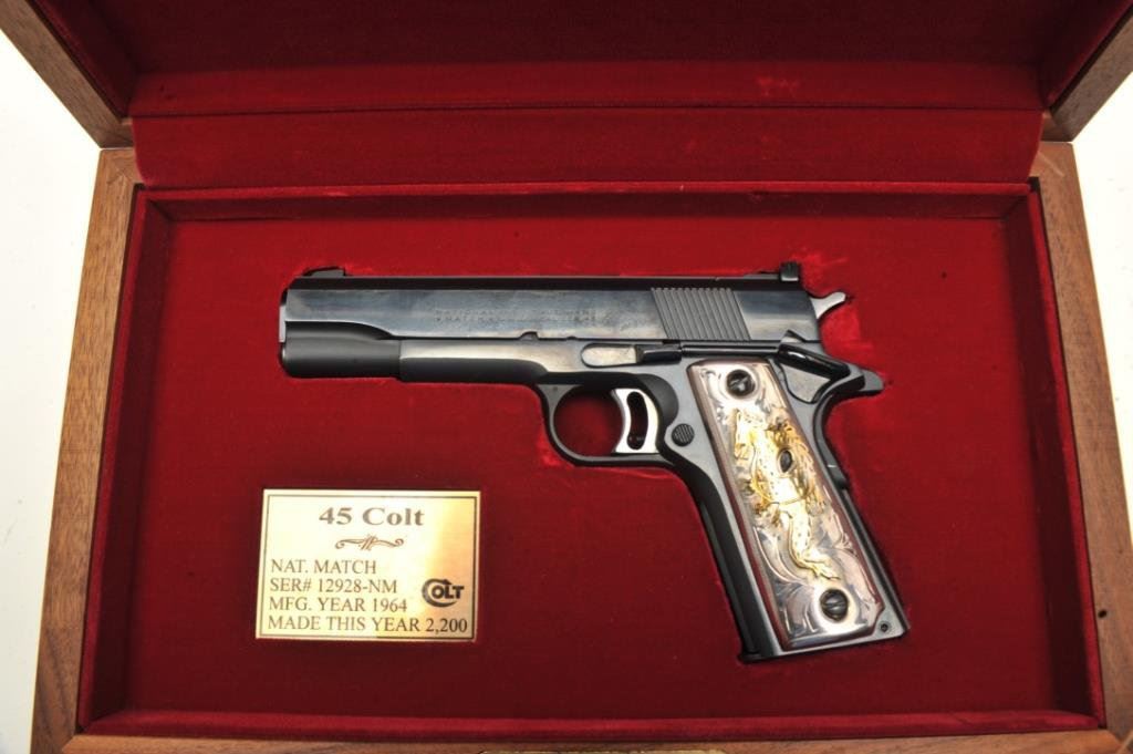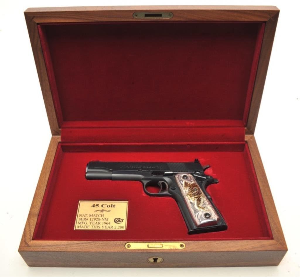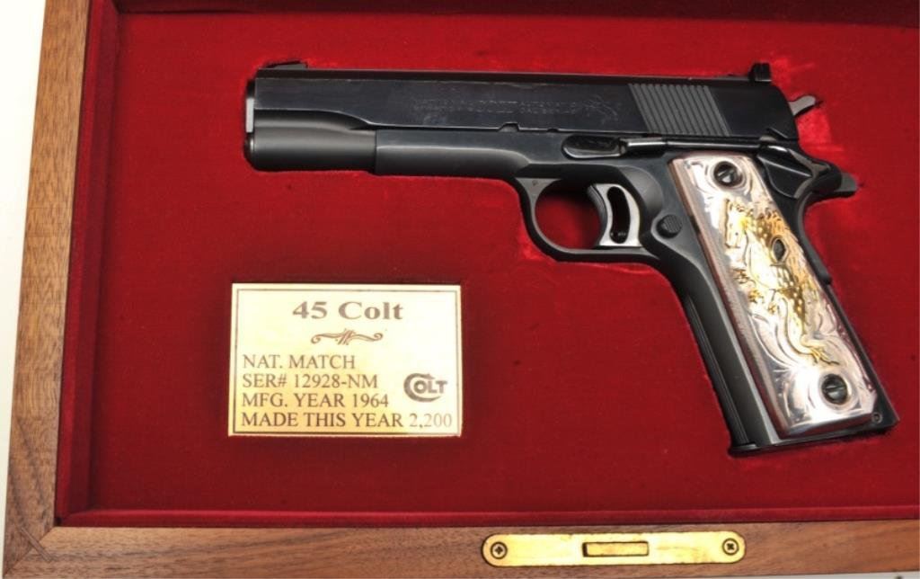 .45 caliber, 5” barrel, blued finish, custom silver and gold dragon emblem grips, S/N 12928-NM, in excellent overall condition showing minimal use or handling; case is of Colt manufacture and there is an inlaid brass plaque on the lid “1980 Olympic Games”. (Modern/PPT). Est.: $1,250-$2,500.