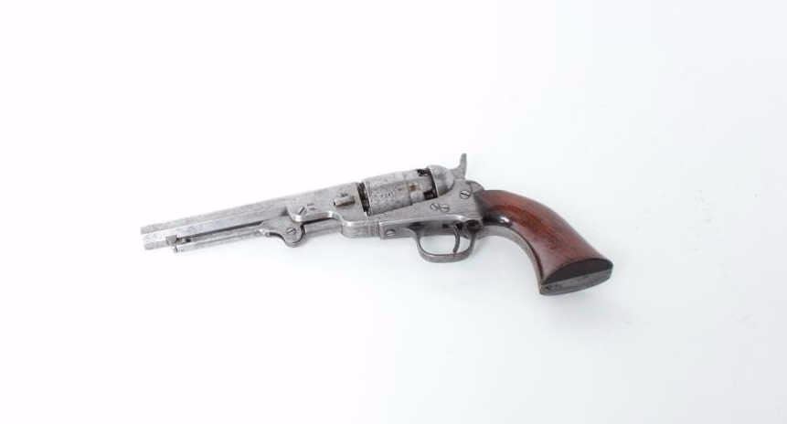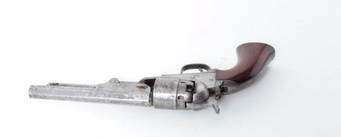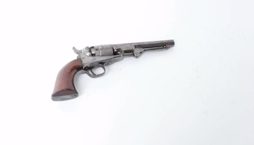 British proofed, .36 caliber, 5.5” octagon barrel, grey patina, wood grips, S/N 37241, in overall good to very good condition with matching visible numbers (rammer un-numbered), traces of original cylinder scene, crisp action, very good grips. (Antique). Est.: $2,000-$4,000.