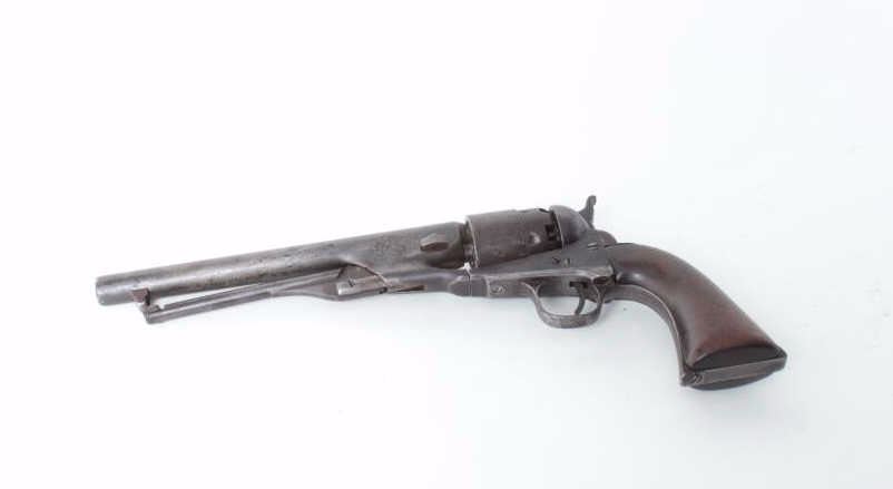 with New York barrel address, .44 caliber, 8ā barrel, S/N 153297, āLā beneath number on frame and trigger guard; no proofs indicating return from London Office for sale on American Market during the Civil War; dark patina on metal surfaces with some scattered areas of erosion and old dings from carry, use and storage; good action and grips. (Antique). Est.: $1,750-$3,500.