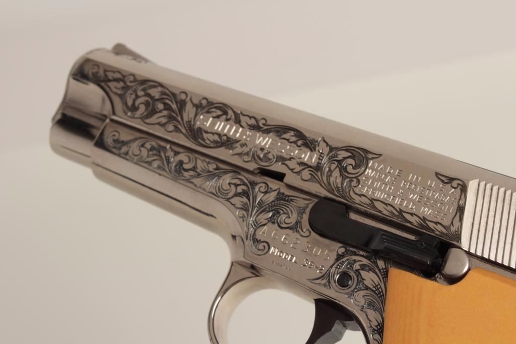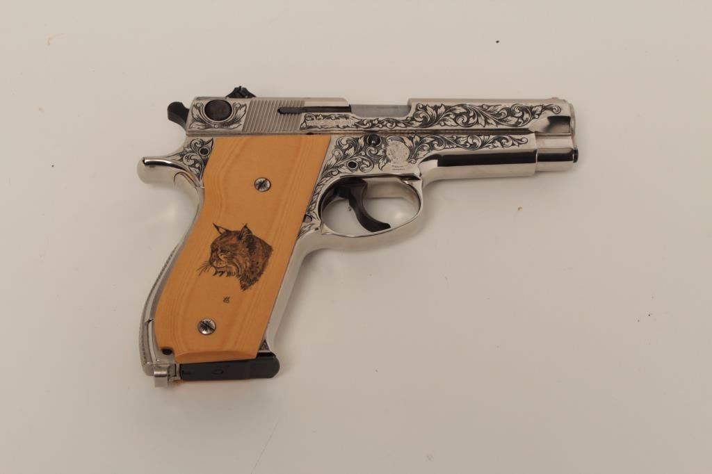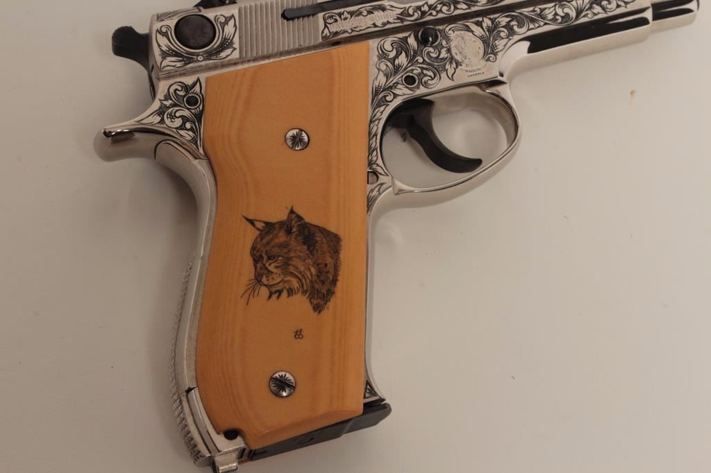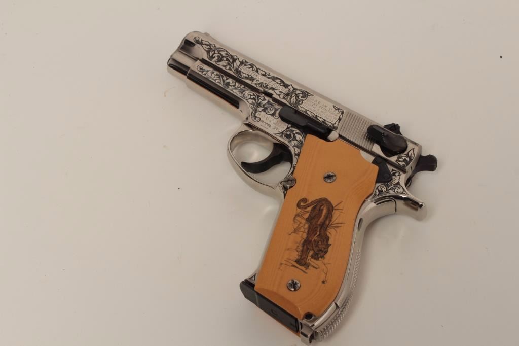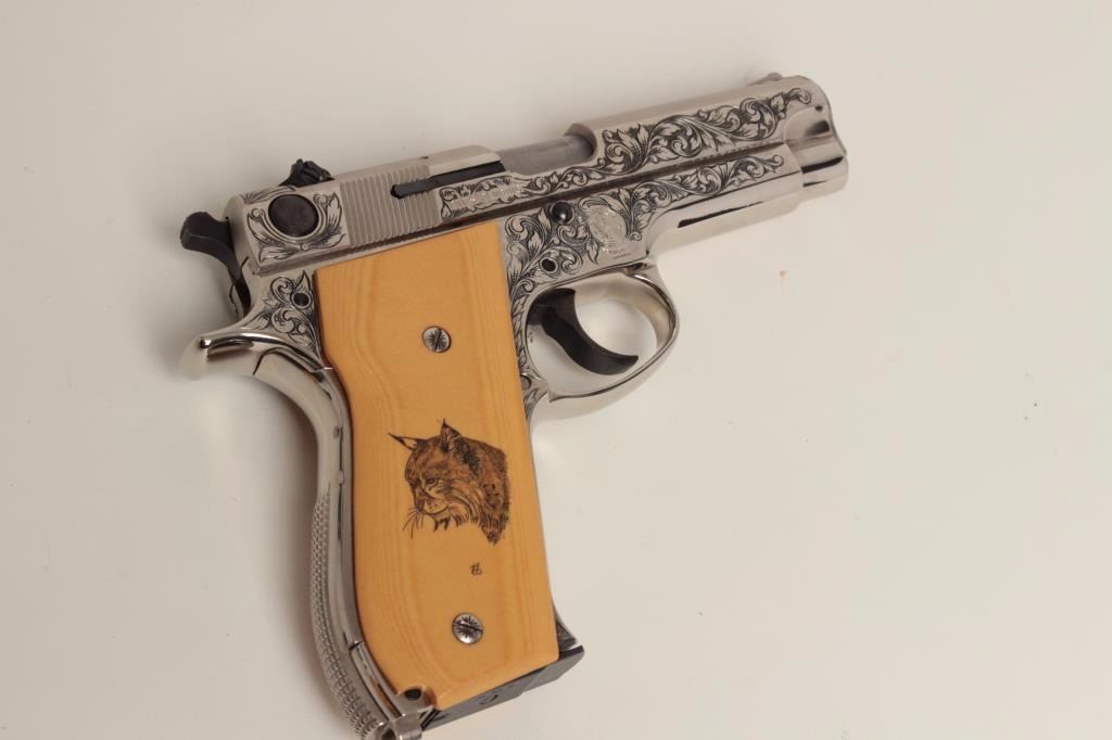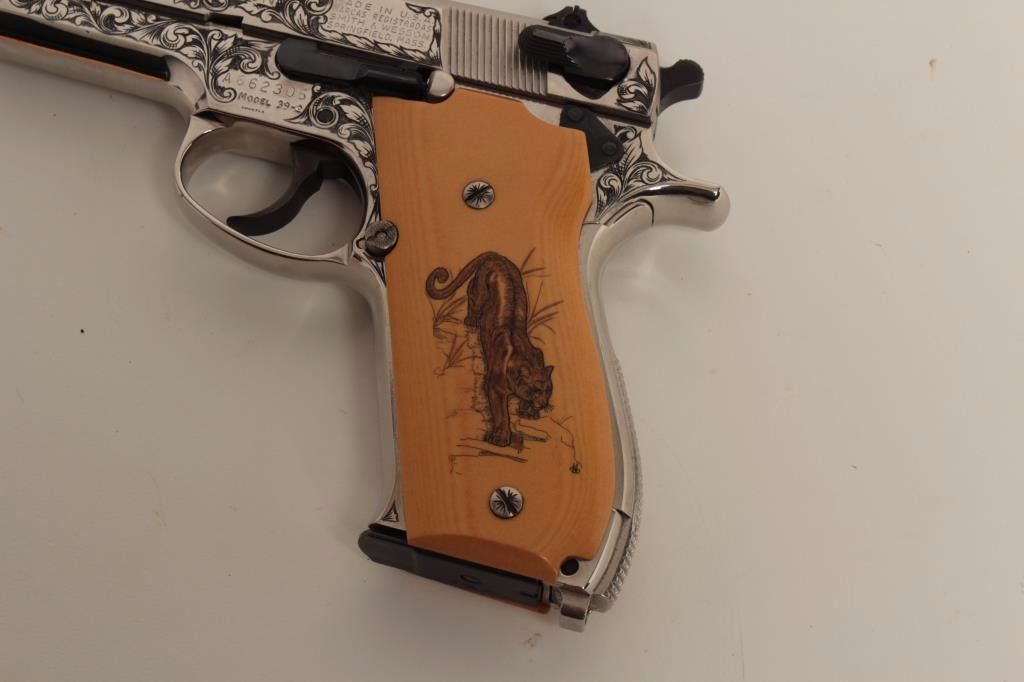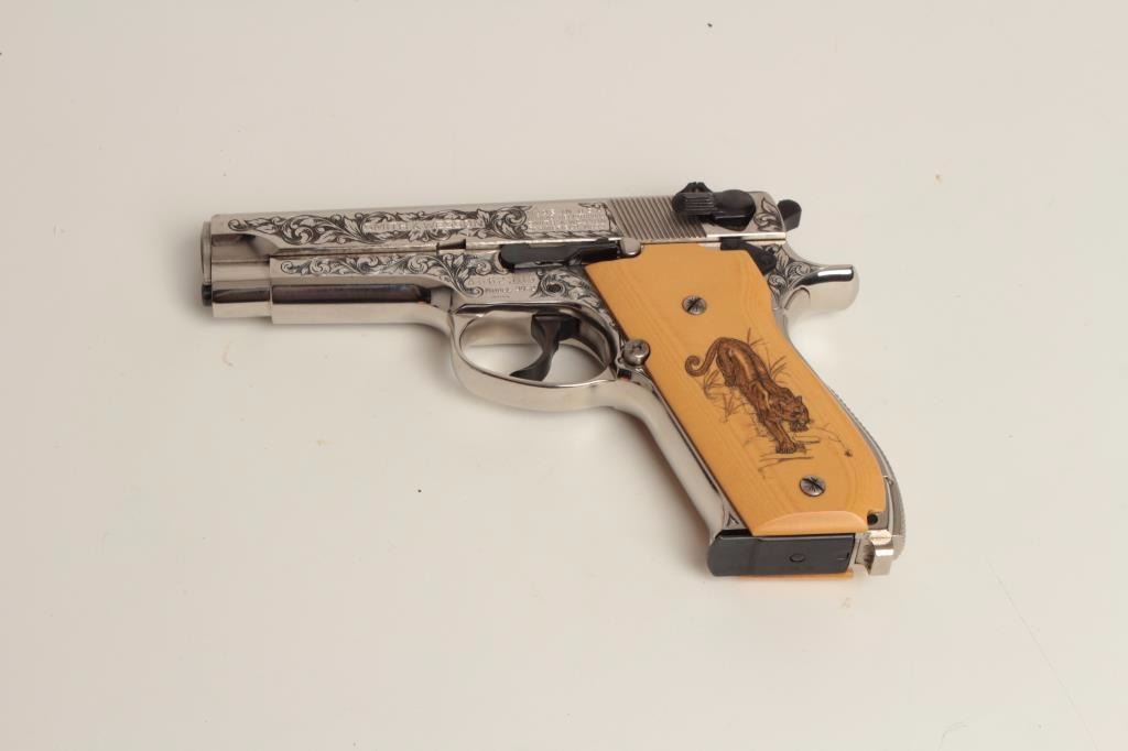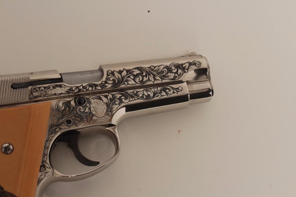 S/N A662305. Finely custom scroll engraved with polished and matt nickel finish, fire blued small parts and trim. Double scrimshawed mycarta (simulated ivory grips) signed “B.B.” in each corner showing mountain lion and lynx. In fine to excellent as restored condition. A beauty made for a southern California collector decades ago on custom order. (Modern/PPT) Est.: $1250-$2500
