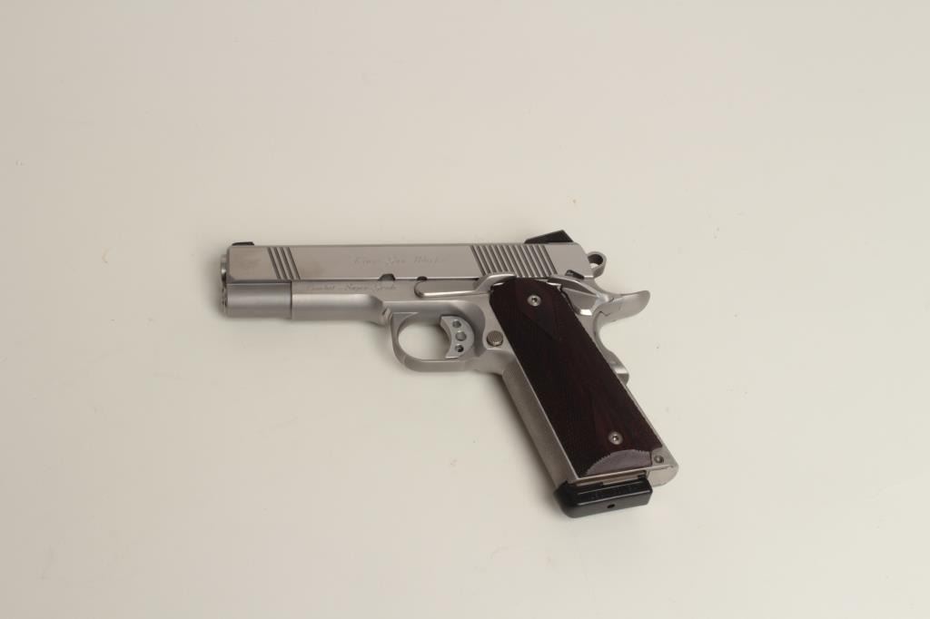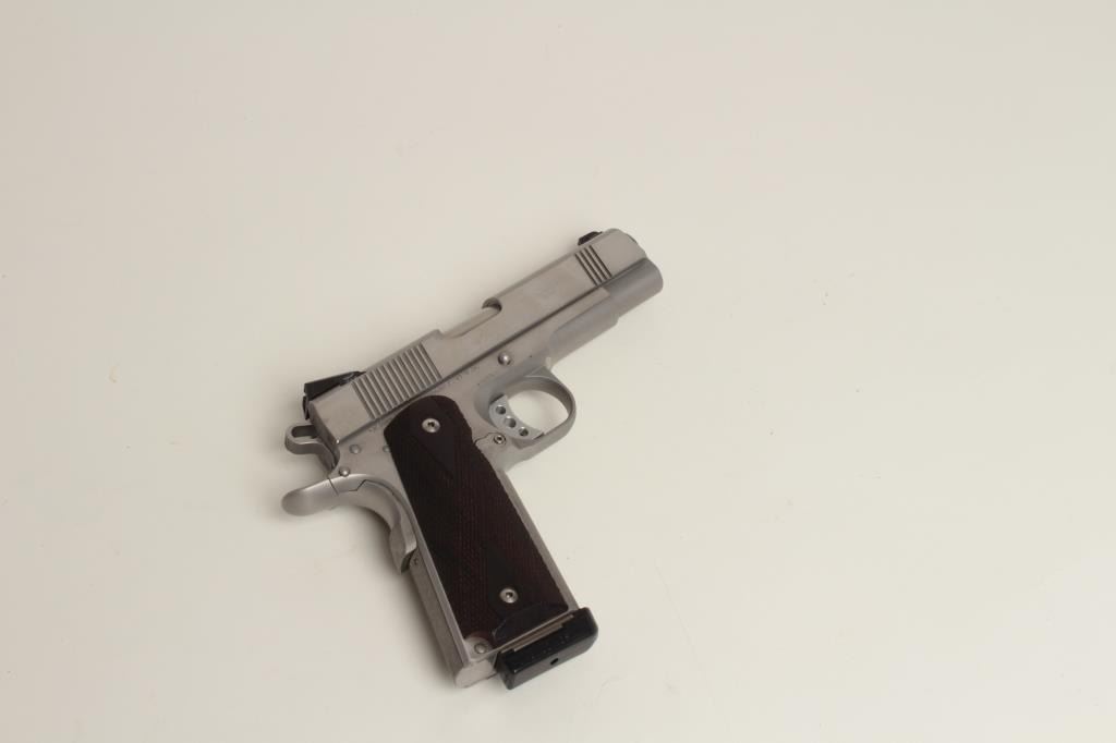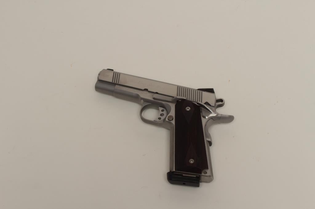 pistol, .45 caliber, 4.25” barrel, stainless steel, custom work hammer and trigger, Wilson Combat magazine, S/N 28182, in excellent to near new condition, checkered wood grips; replacement cost: $4,000 +. (Modern/PPT). Est.: $1,500-$3,000.