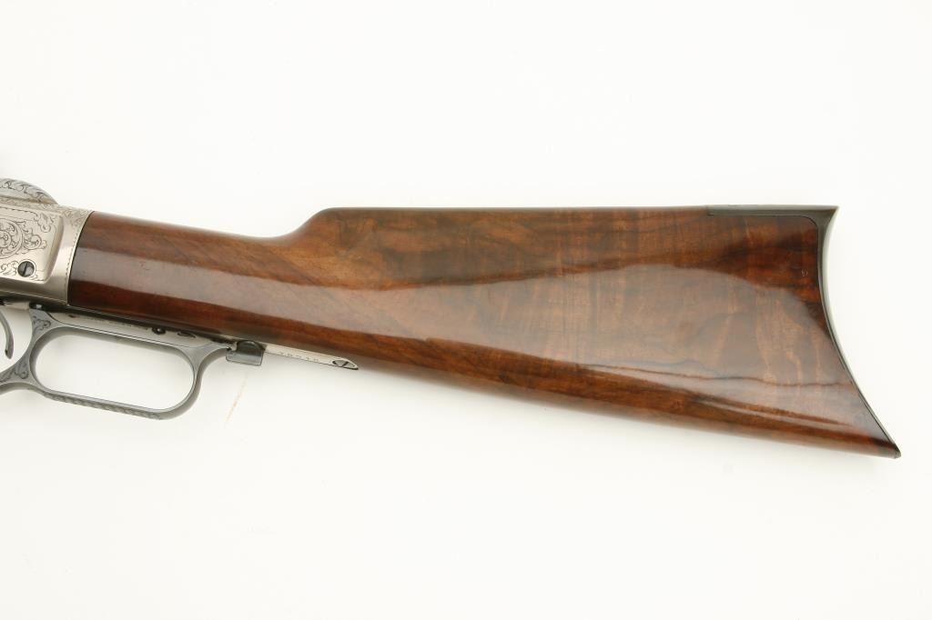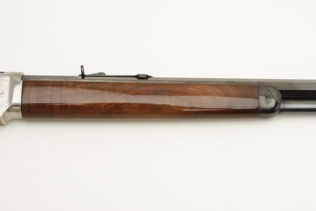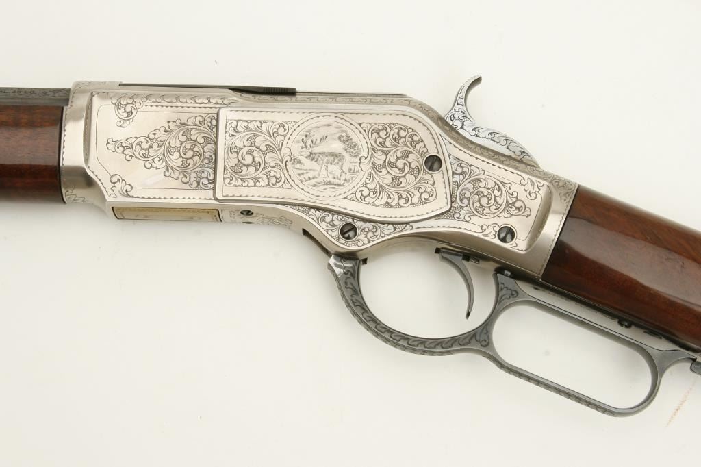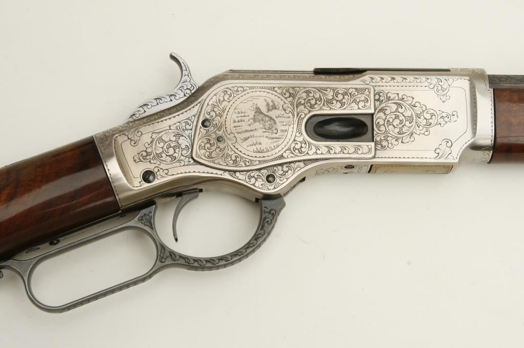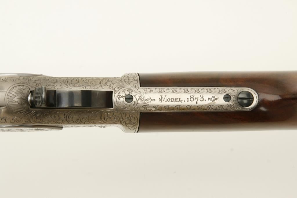 Winchester Model 1873 lever action rifle, .45LC caliber, 24” octagon barrel, beautifully engraved with two panel scenes of animals on receiver, deluxe grained straight stocks, S/N 78218, in excellent to like new condition. (Modern). Est.: $1,000-$2,000.