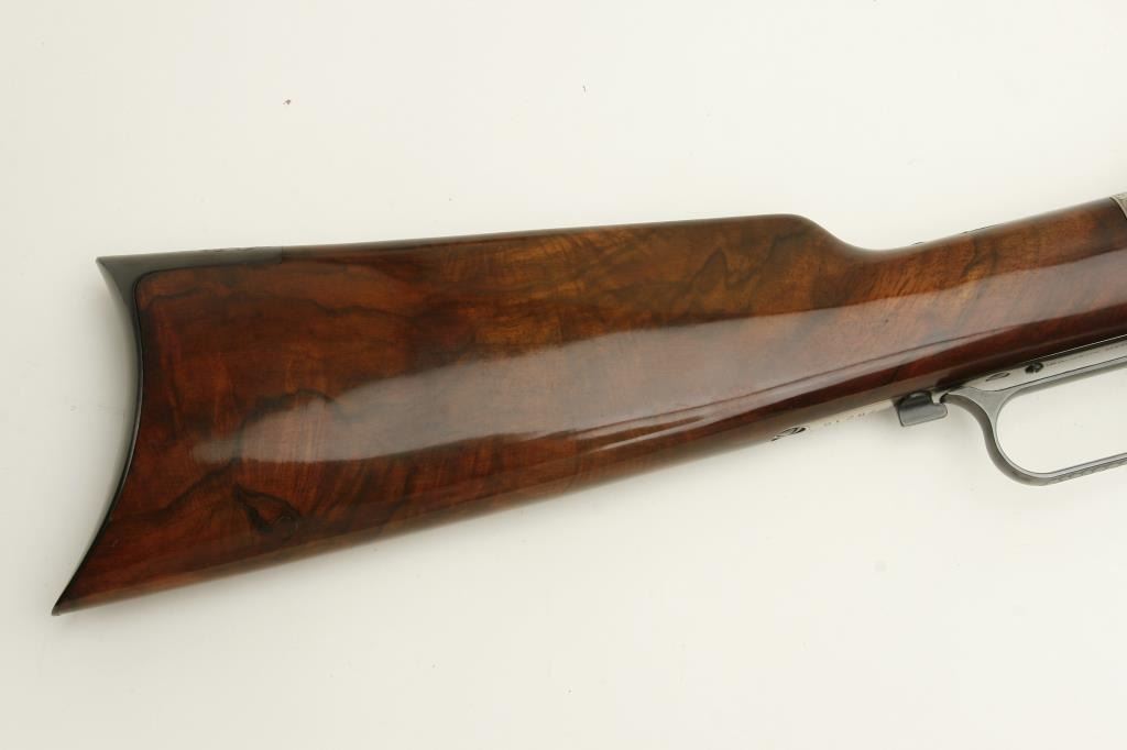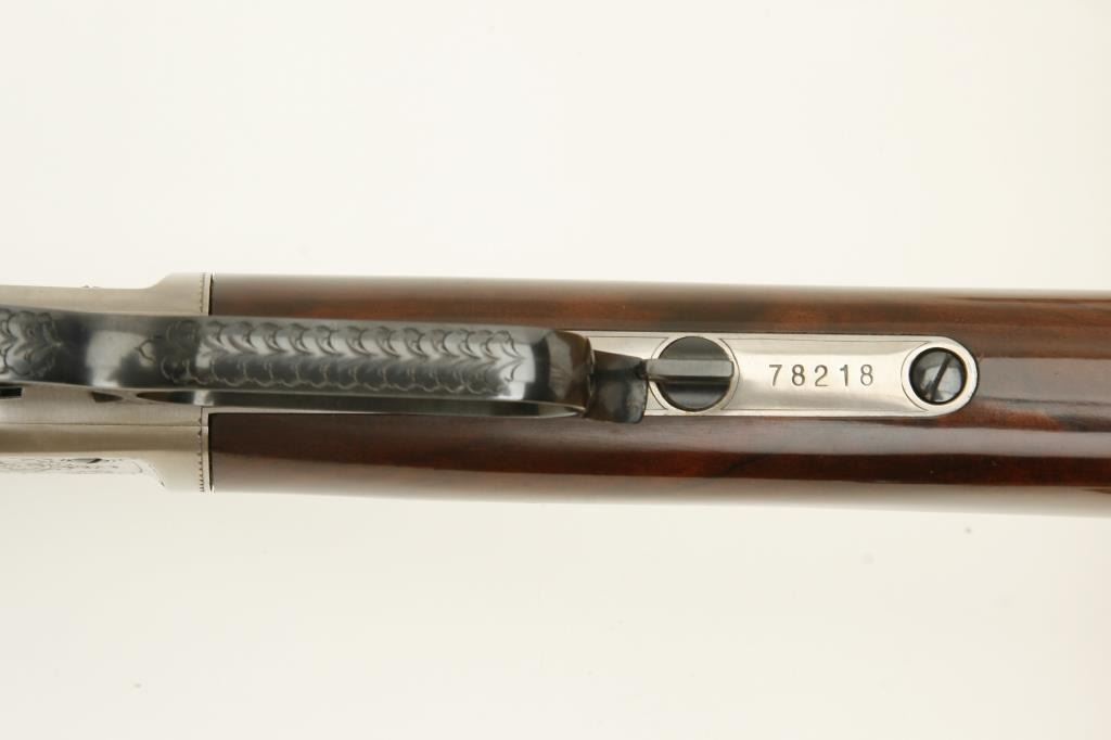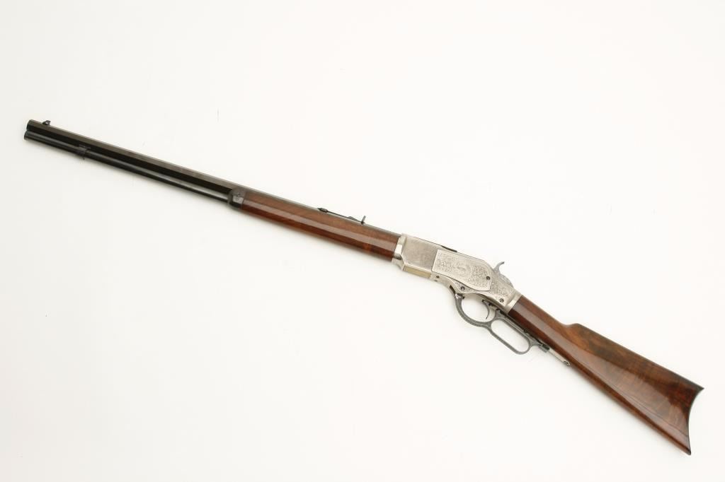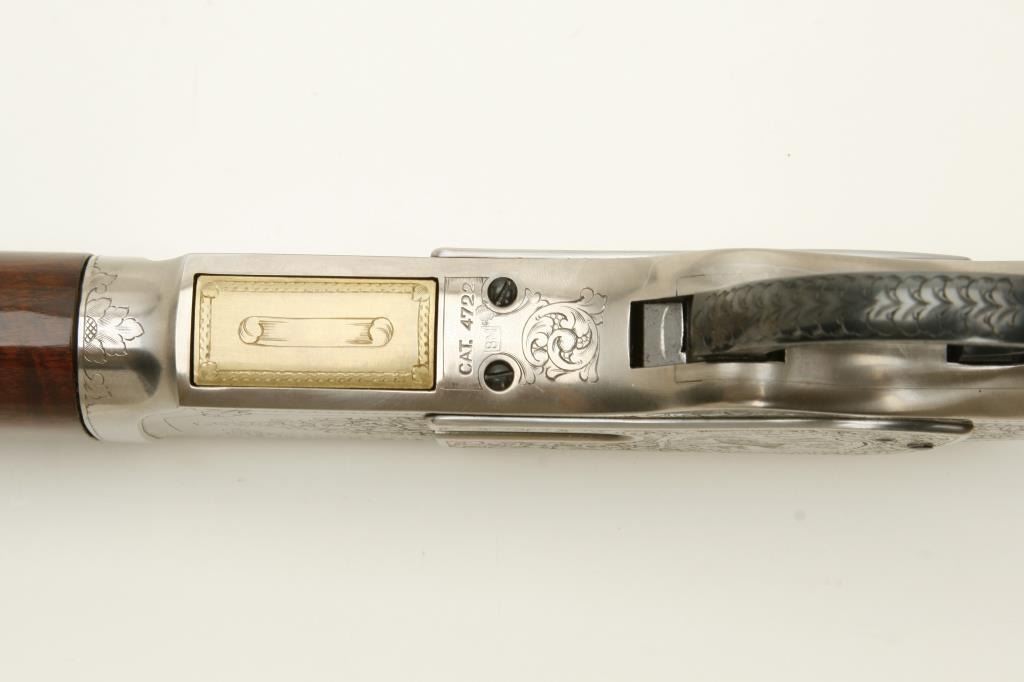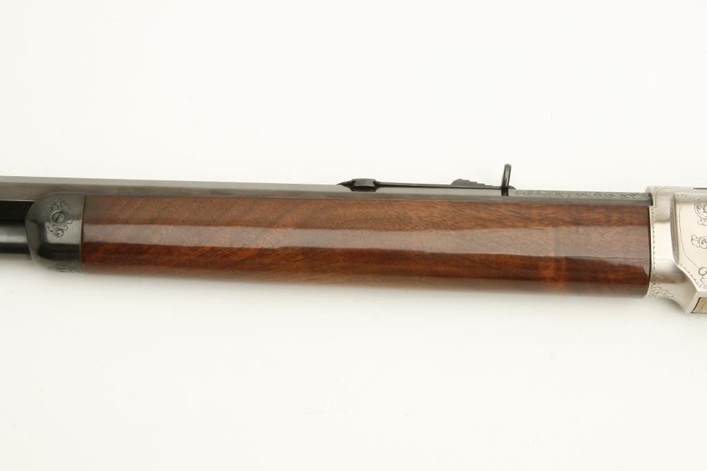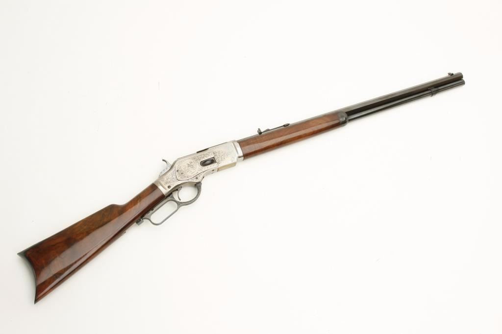 Winchester Model 1873 lever action rifle, .45LC caliber, 24” octagon barrel, beautifully engraved with two panel scenes of animals on receiver, deluxe grained straight stocks, S/N 78218, in excellent to like new condition. (Modern). Est.: $1,000-$2,000.