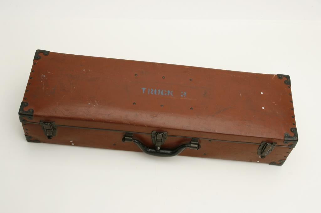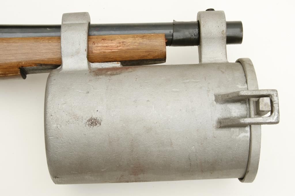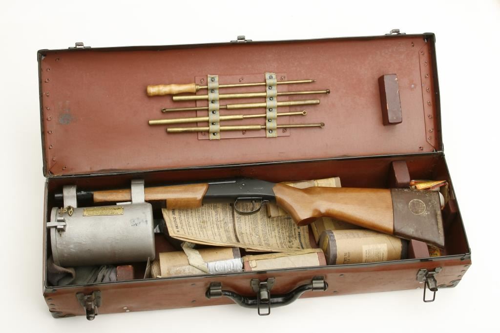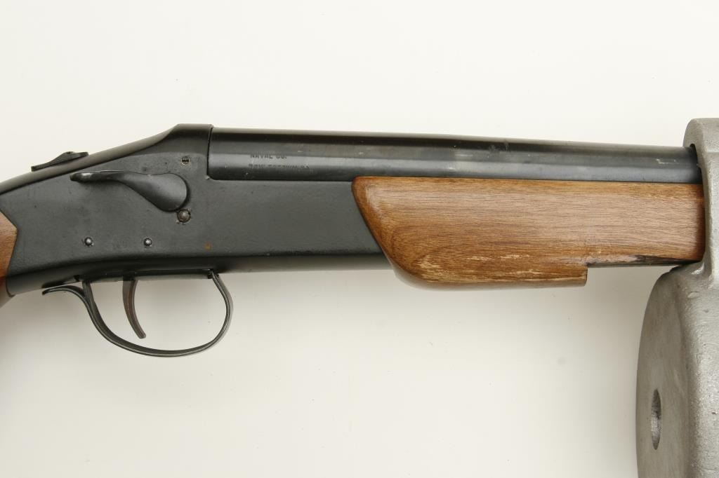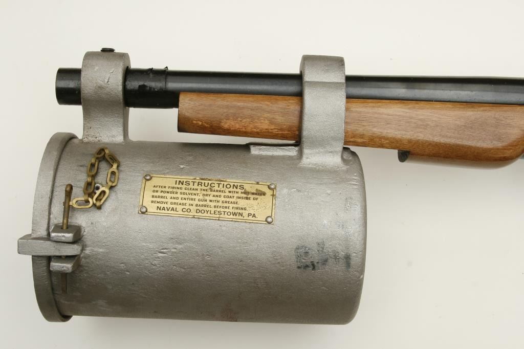 blank only in case with instructions and accessories with break open action, S/N P03293. “Naval Co., Doylestown, PA.” label on line drum with instruction sheets. 4 brass bolts, line, and various accessories are included. In very good to near fine condition with trunk case. Est.:$1000-$2000