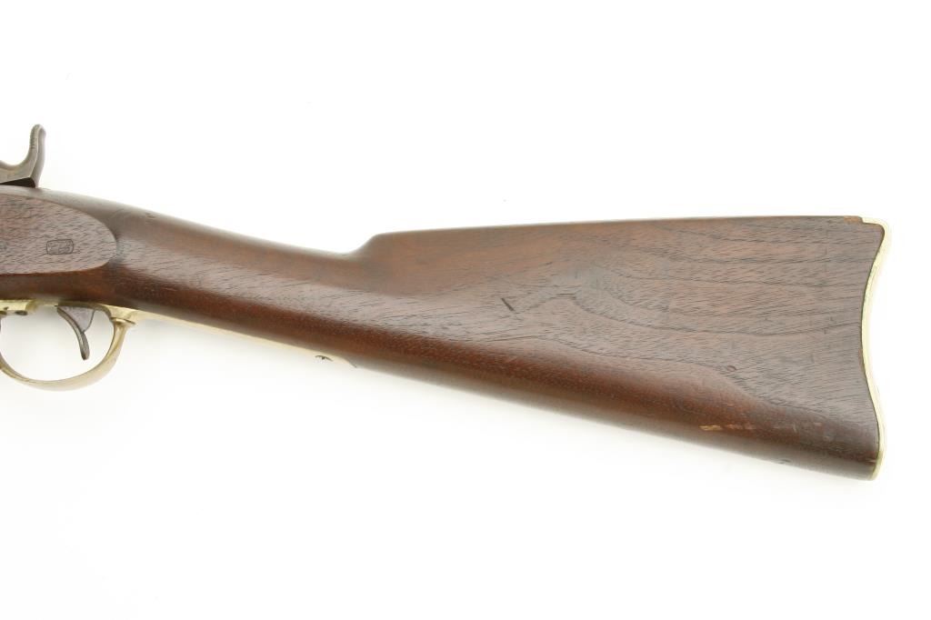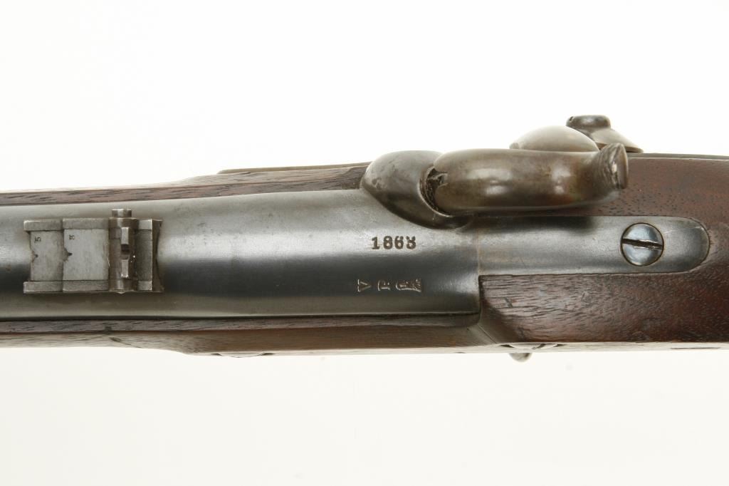 dated 1863 and in original fine to excellent condition. 98% original blue with 90%-95% bright and colorful case hardening. The stock is near fine with some minor dings, mars and scratches and also showing two razor sharp cartouches on the left side of the stock behind and below the lock screws. Original ramrod. Extra nipple in the patchbox. Shows no use. A strong 9-9.5 on a 1-10 scale. (Antique) Est.: $3000-$6000
