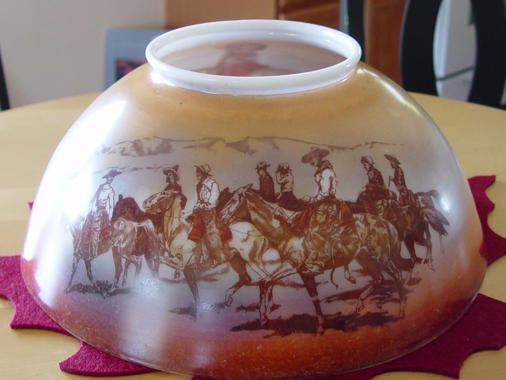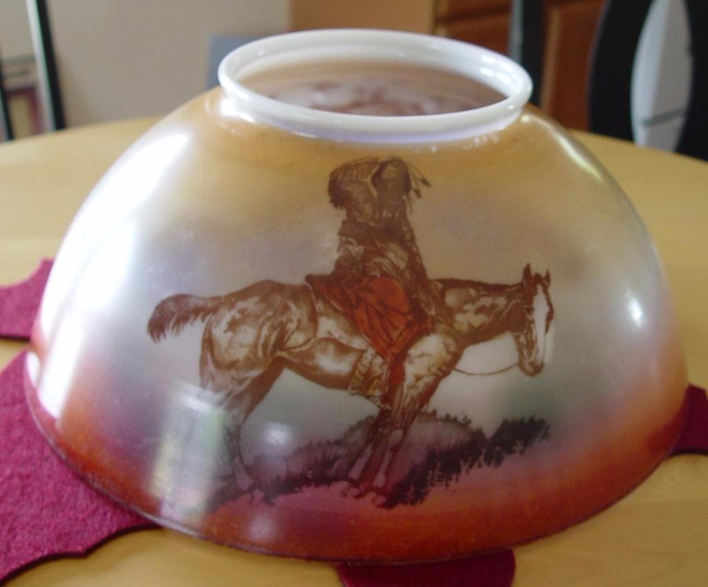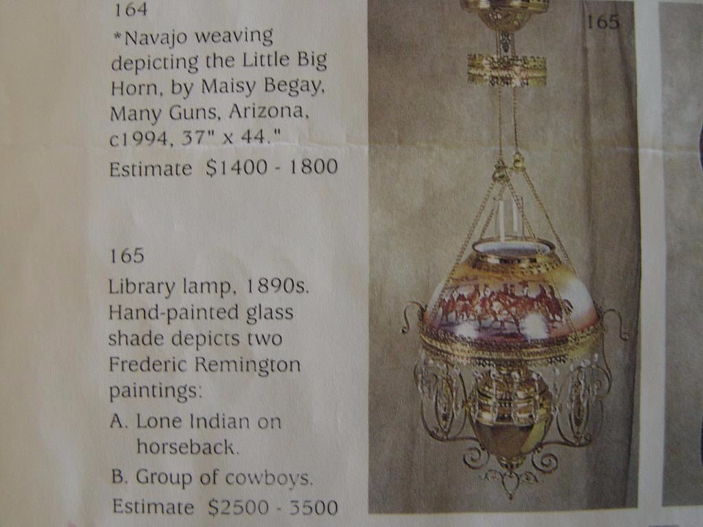 glass shade depicting what may be Remingtons art work in western scenes. One scene shows lone Indian on horseback and the other shows mounted cowboys. Near excellent and complete. Refer High Noon auction Lot #165 where it fetched over $3,000. Est.: $600-$1200
