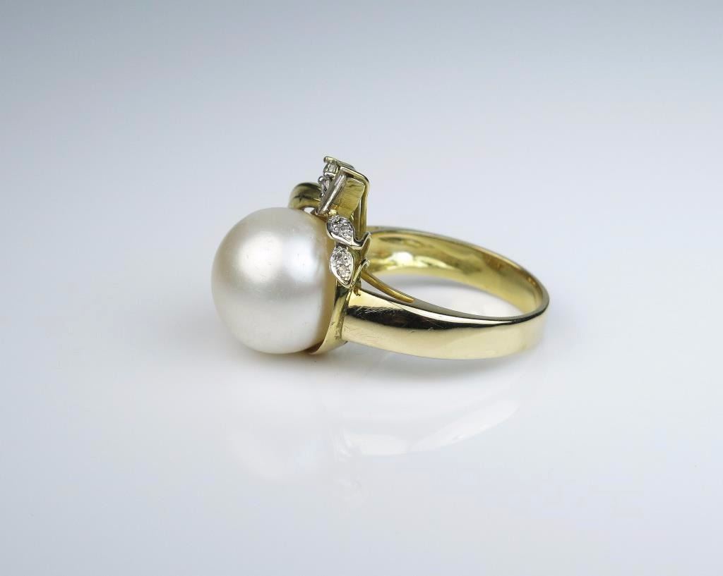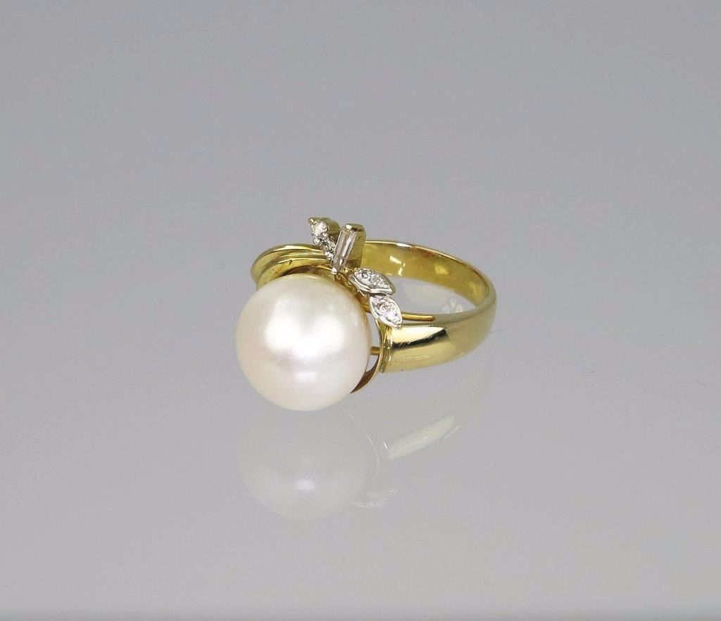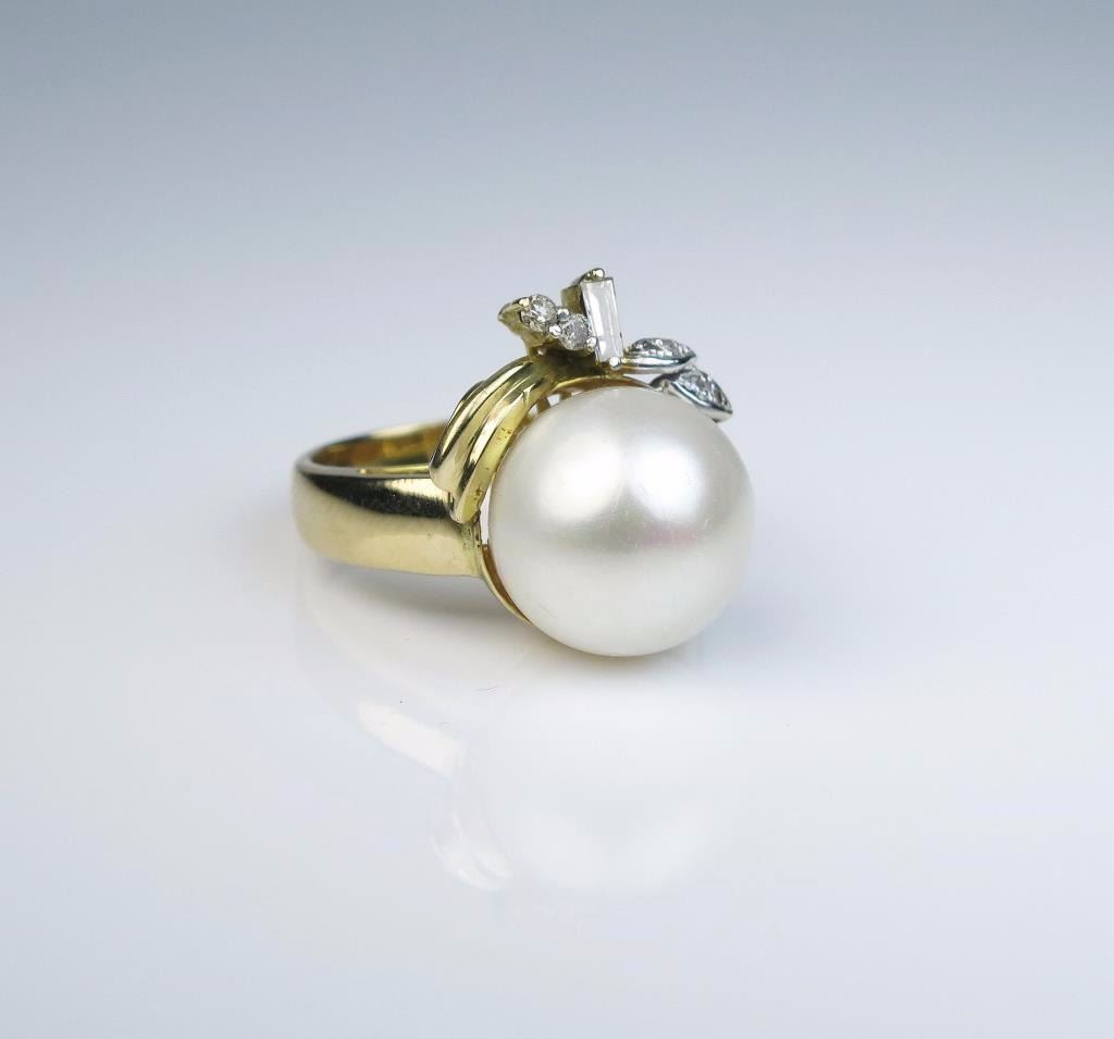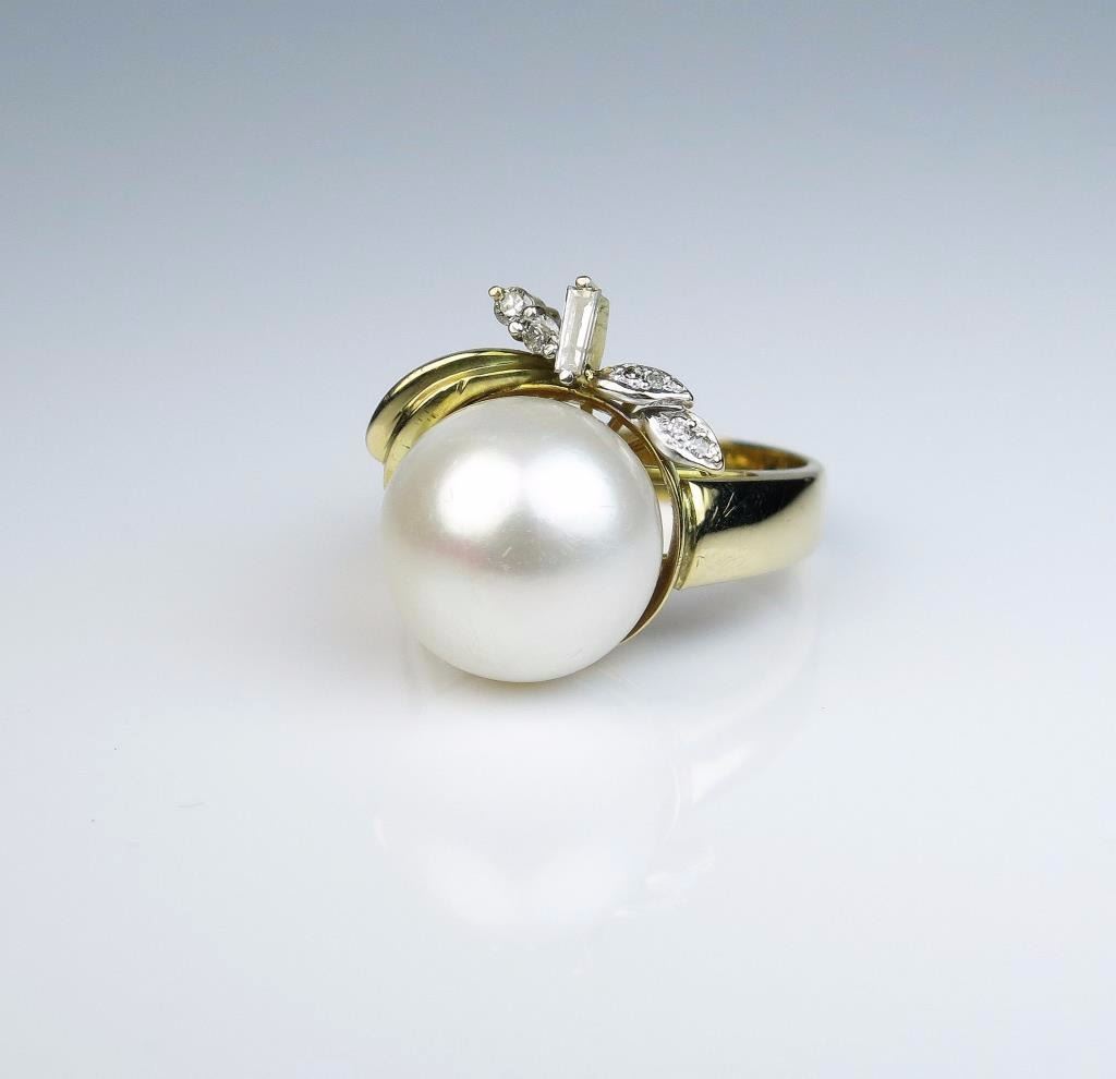 averaging 14.00 MM in diameter of fine luster and accented with seven diamonds of H-I colors and SI clarity. Estimates $800-$1,200