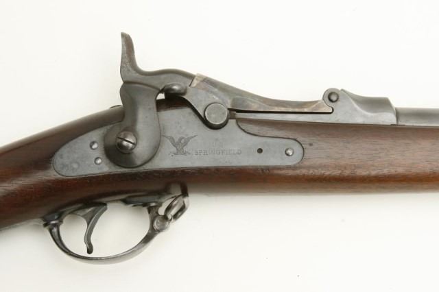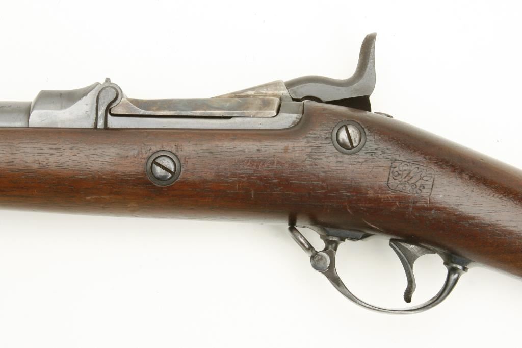 fine condition, S/N 298518. 90%-95% original finish on the barrel and lock plate with 90%-95% vibrant and colorful case hardening on the breech block. Just beginning normal aging with some slight erosion and miniscule pin prick pitting. The stock is also near fine with minor dings, scratches, and slight imperfections. Good and sharp S.V.W. cartouche and 1886 date with āPā proof. Excellent bore and mechanics. Cleaning rod is included. A good 8.5 to 9 on a 1-10 scale. (Antique) Est.: $900-$1800