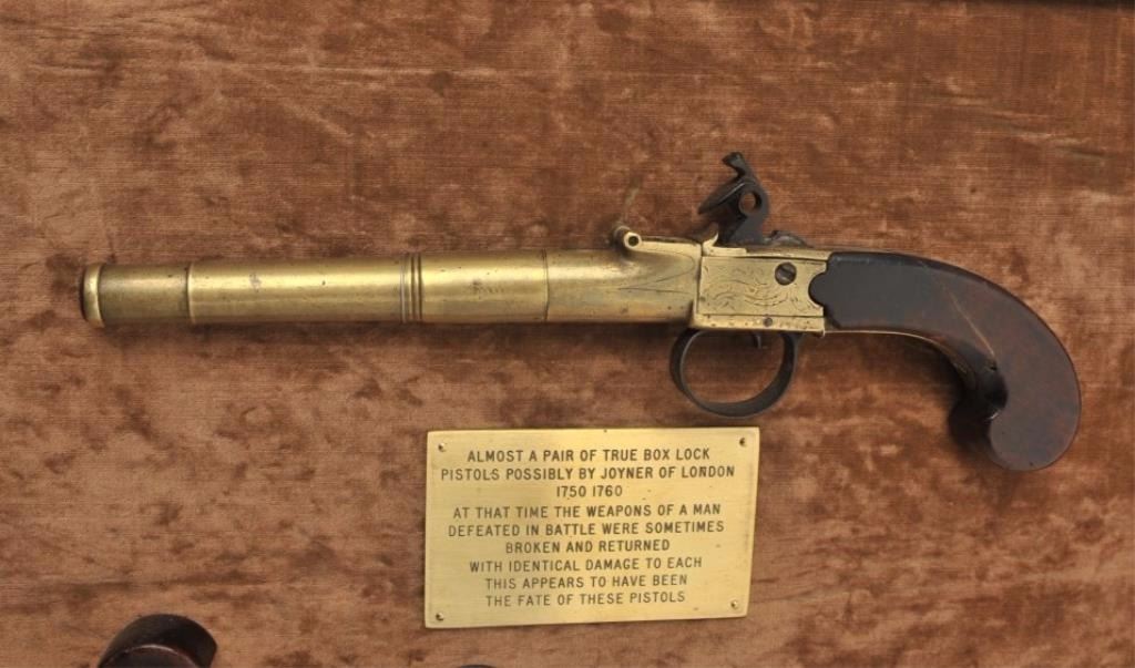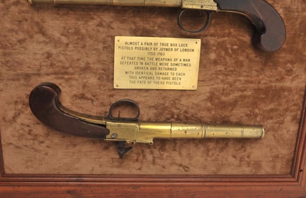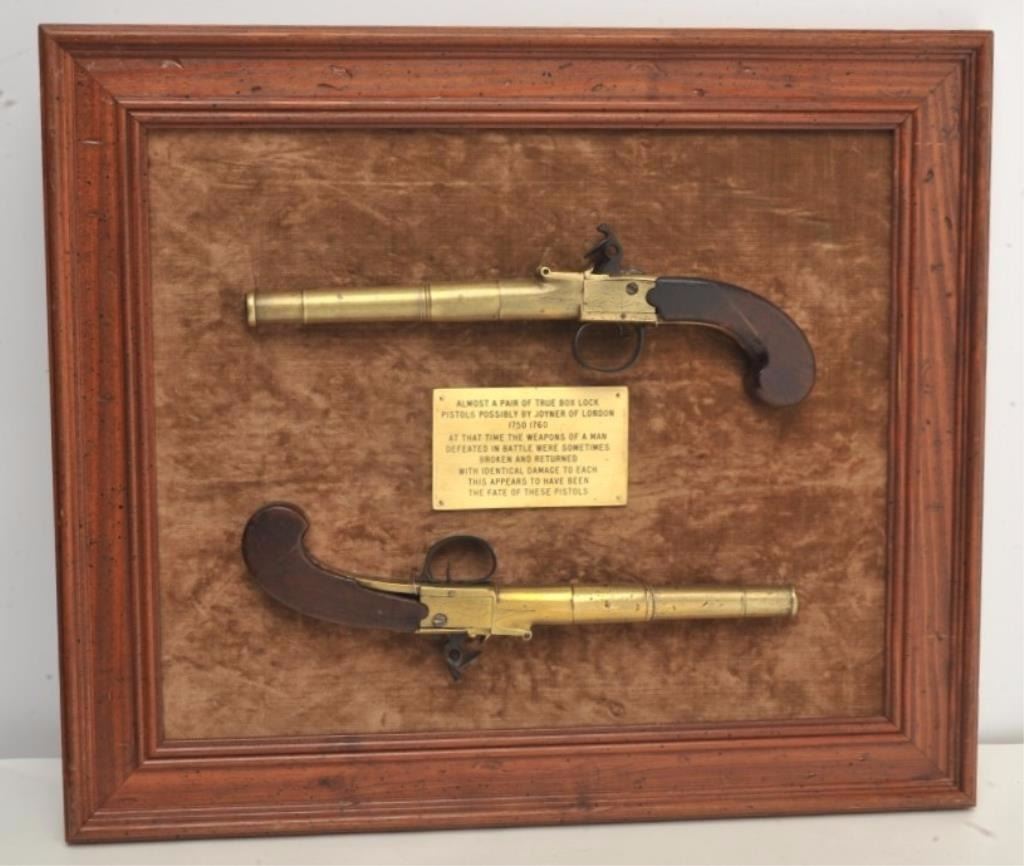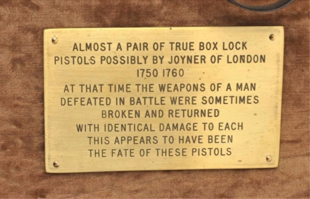 and mounted on plaque which reads “Almost a pair of true box lock possibly by Joyner of London, 1750-60. At that time the weapons of a man defeated in battle were sometimes broken and returned. With identical damage to each this appears to have been the fate of these pistols”. Measures 12 ½” overall with 5 ½” screw off cannon barrels of .56 caliber smoothbore. Broken parts and relics. If these could talk they might speak of the French and Indian War or Revolutionary war battles. As found. Est.: $600-$1200