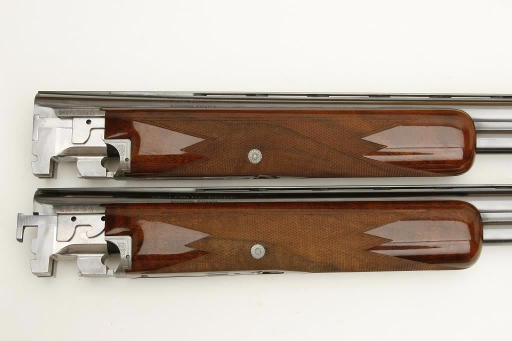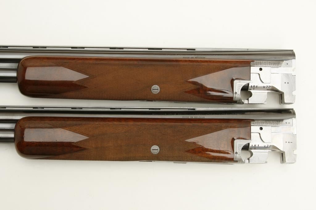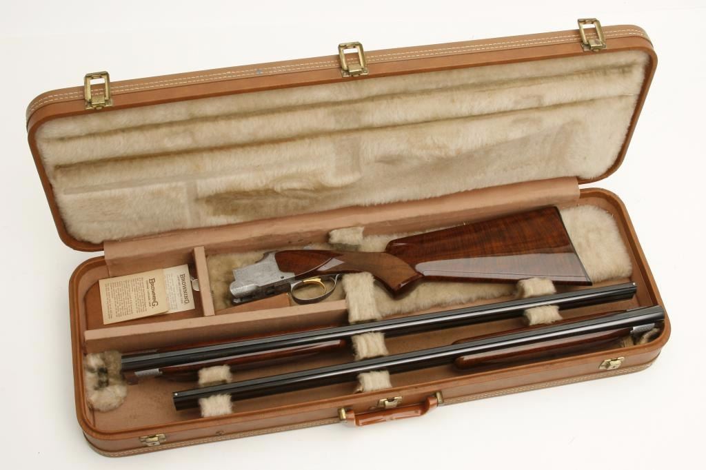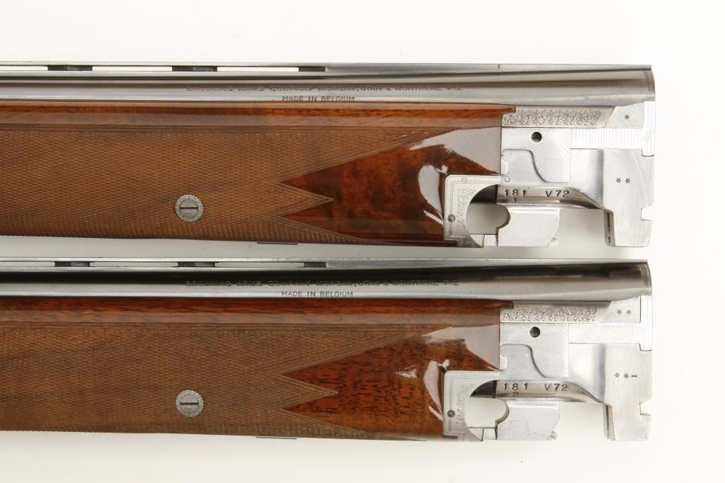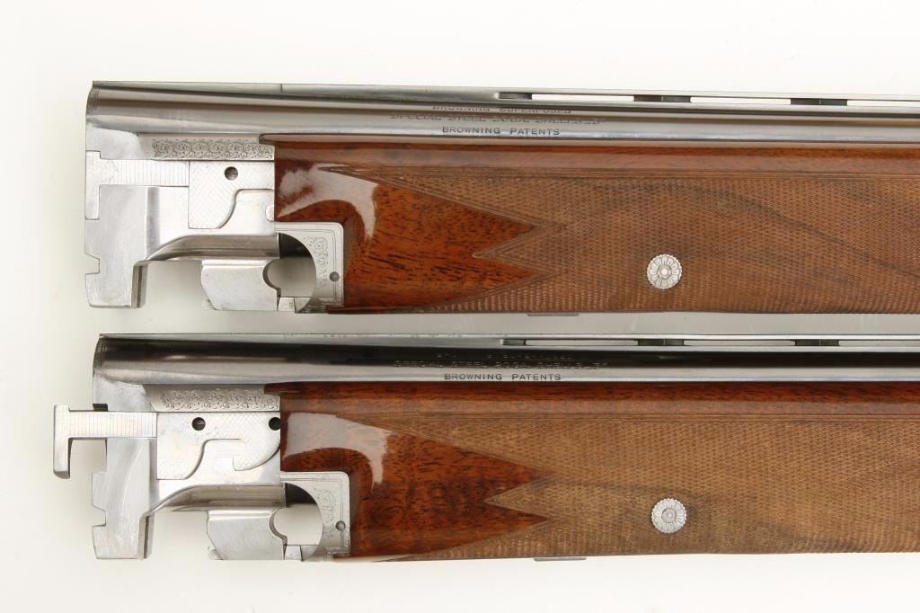 set, 20 gauge, 28” and 26.5” O/U ventilated rib barrels, Full-Modified and Modified-Improved Cylinder choked, single gold trigger, blue barrels, engraved bright receiver, deluxe checkered wood stocks, L.O.P. is 14.5” to end of Browning plastic butt plate, S/N 181V72, in overall excellent to like new condition; accompanied by a Browning lined leather suitcase style hard case. (Modern). Est.: $7,000-$14,000.