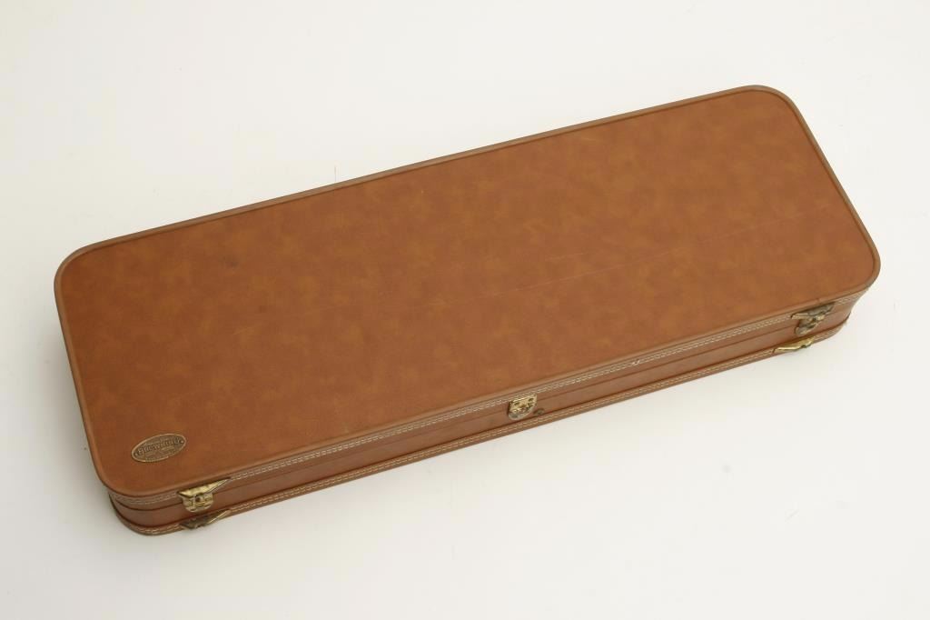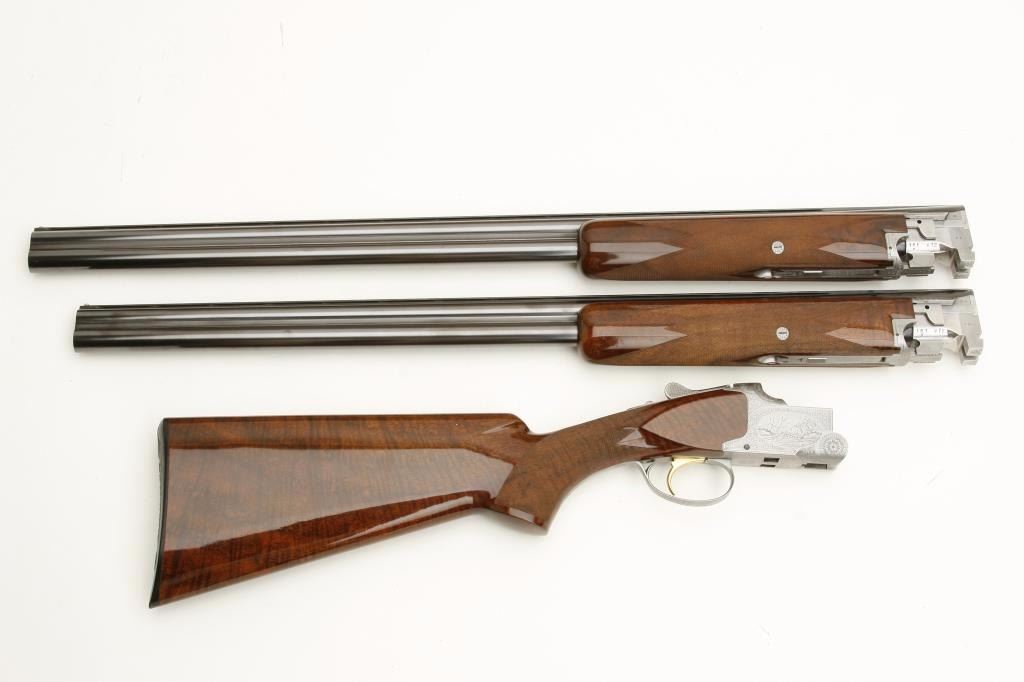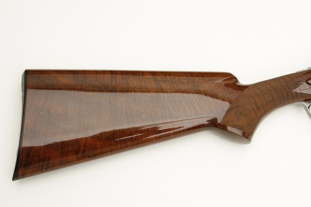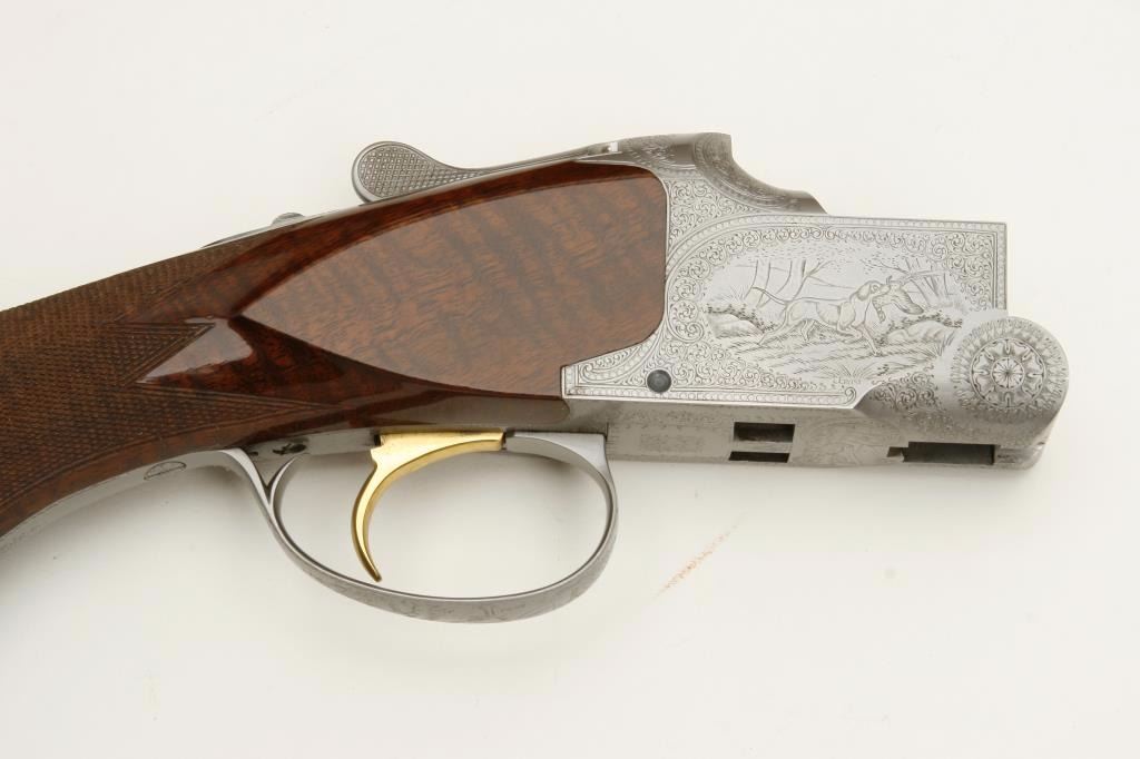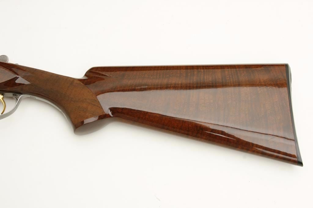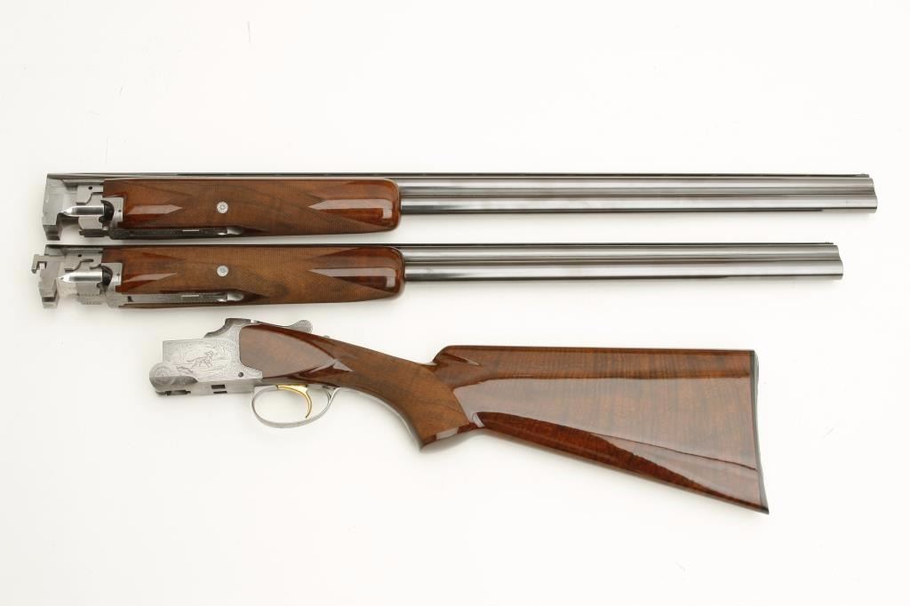 set, 20 gauge, 28” and 26.5” O/U ventilated rib barrels, Full-Modified and Modified-Improved Cylinder choked, single gold trigger, blue barrels, engraved bright receiver, deluxe checkered wood stocks, L.O.P. is 14.5” to end of Browning plastic butt plate, S/N 181V72, in overall excellent to like new condition; accompanied by a Browning lined leather suitcase style hard case. (Modern). Est.: $7,000-$14,000.