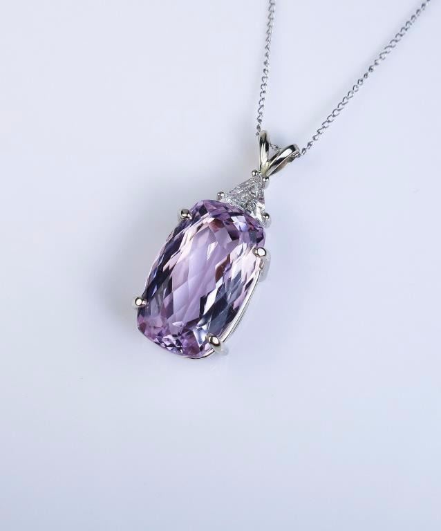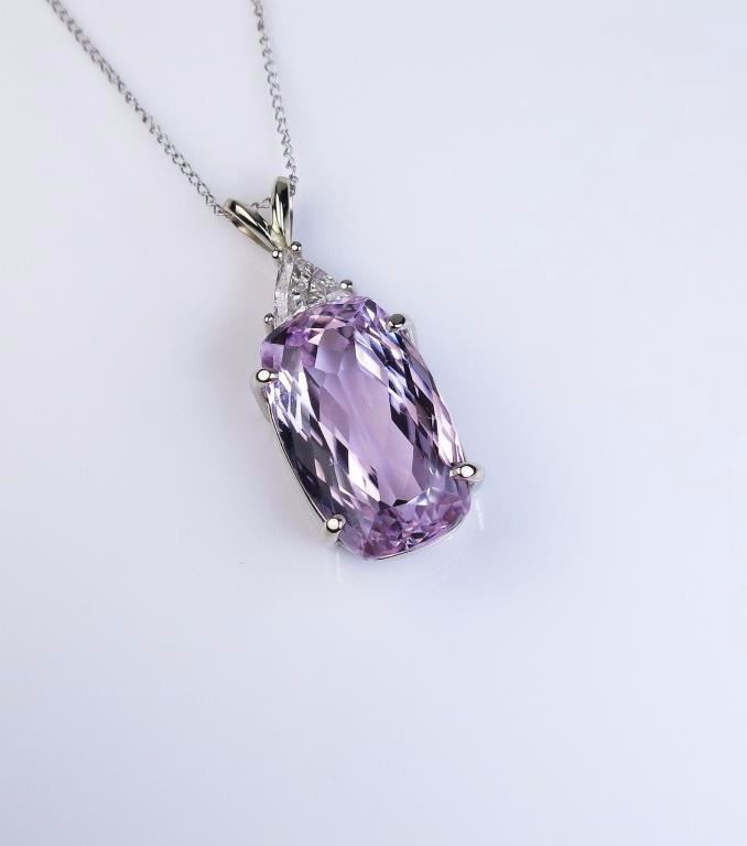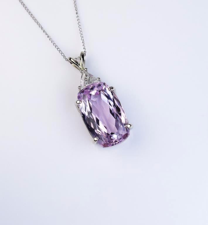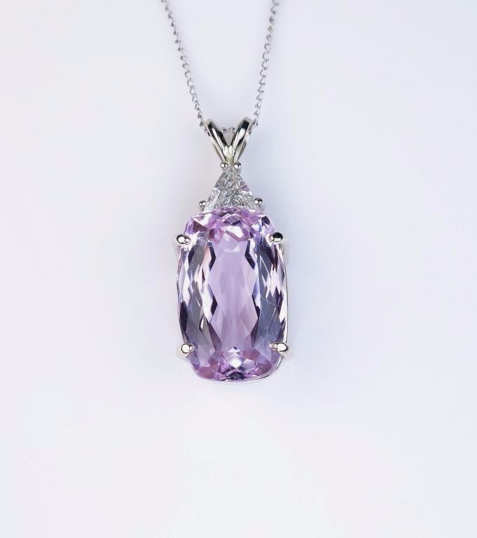 pink Kunzite weighing 14.75 carats and accented with a trilliant cut diamond weighing approx. 0.35 carats of E/F color and SI clarity set in a 14 karat white gold ladies custom made setting. Retail $6,000-$8,000 Estimates $4,000-$6,000