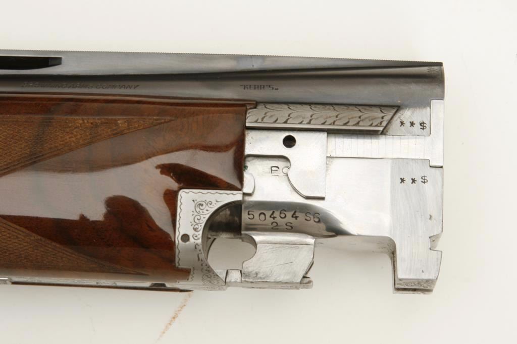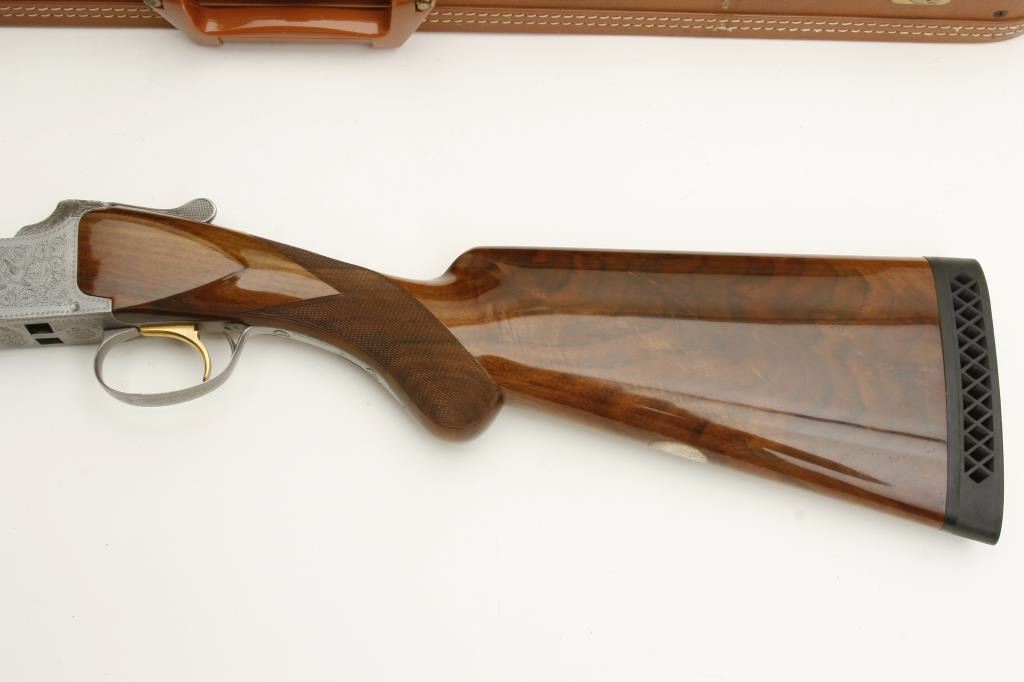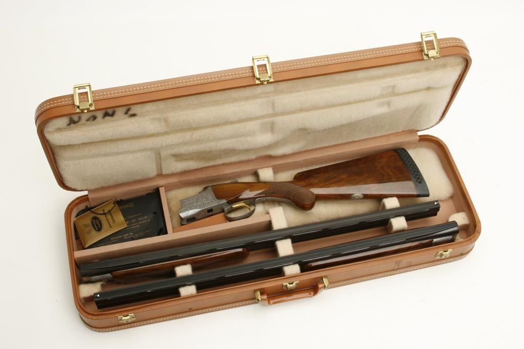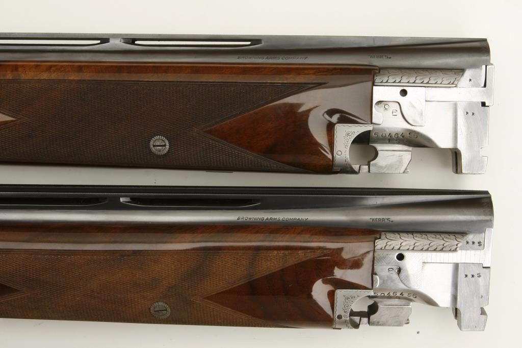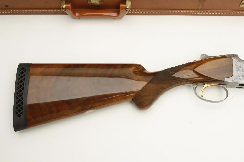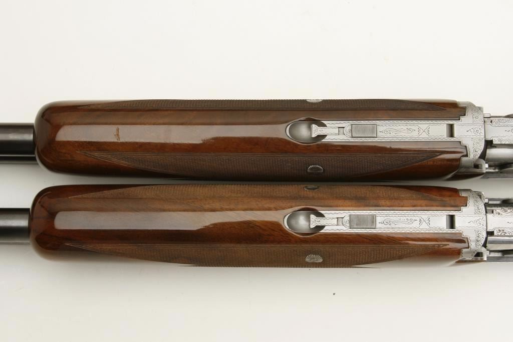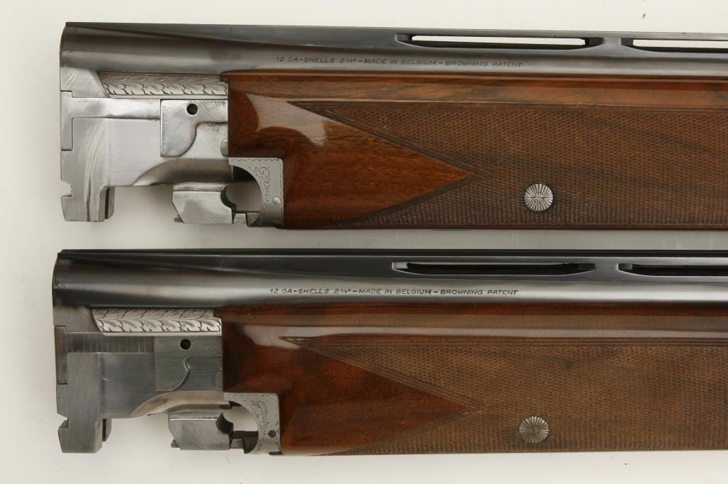 set, long tang, 12 gauge, 28” Broadway rib barrels, Full-Modified and Skeet-Skeet choked, single gold trigger, blued barrels, engraved bright receiver, deluxe checkered wood stocks with round knob pistol grip, L.O.P. is 13.25” to end of wood and 14” to end of hard rubber butt pad, S/N 50464S6, in overall excellent to like new condition with “LWK” engraved plaque on underside of butt stock. Accompanied by a Browning lined leather suitcase style hard case. (Modern). Est.: $4,000-$8,000.