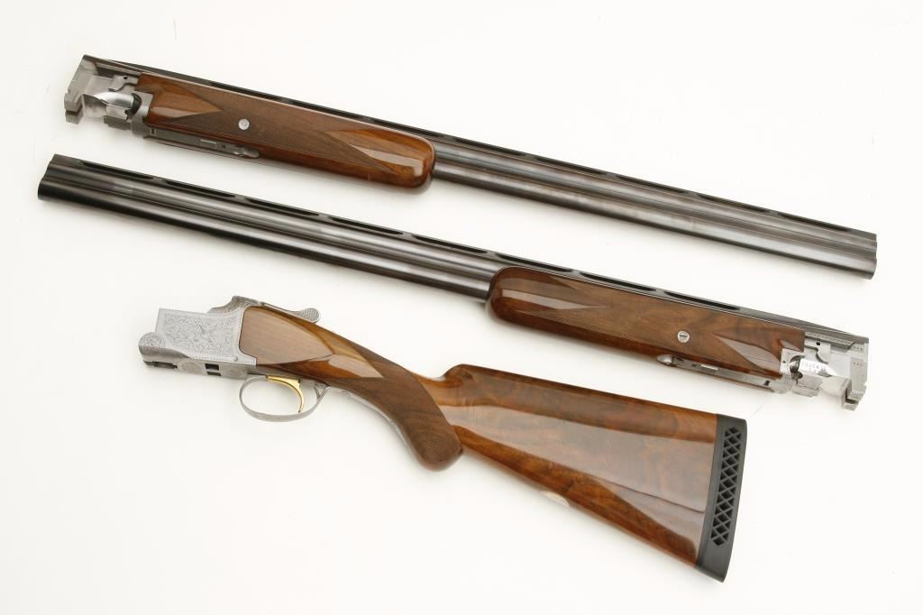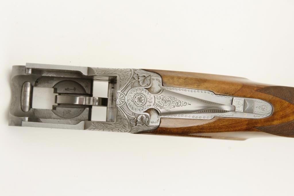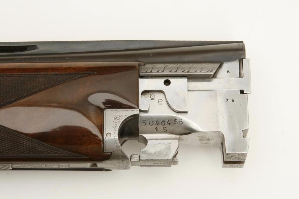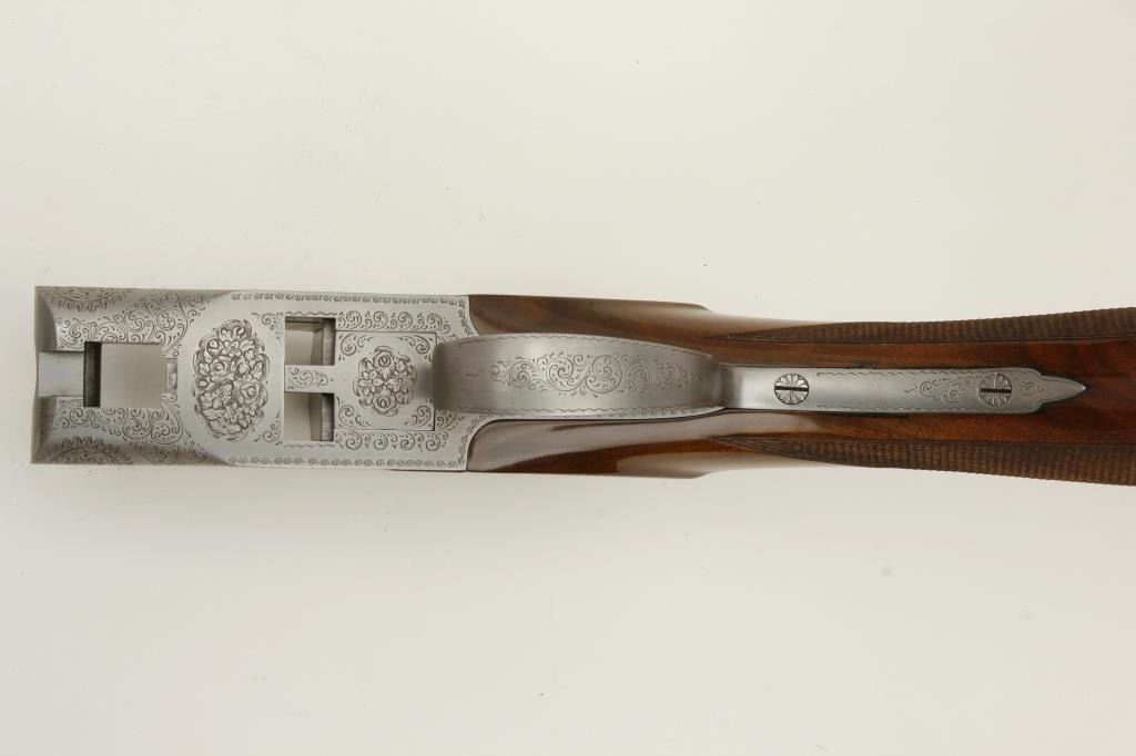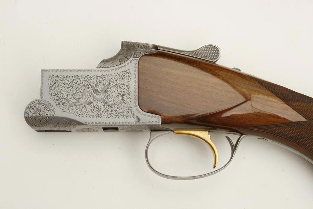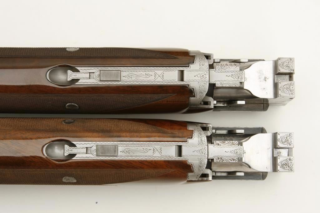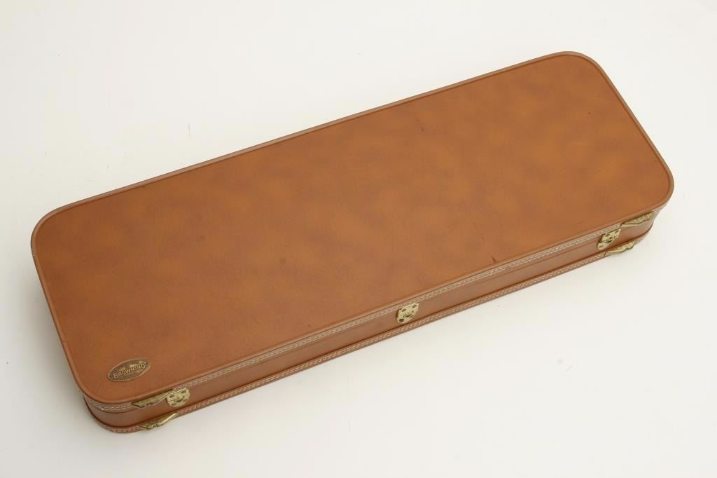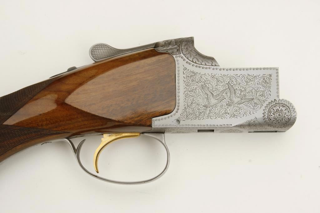 set, long tang, 12 gauge, 28” Broadway rib barrels, Full-Modified and Skeet-Skeet choked, single gold trigger, blued barrels, engraved bright receiver, deluxe checkered wood stocks with round knob pistol grip, L.O.P. is 13.25” to end of wood and 14” to end of hard rubber butt pad, S/N 50464S6, in overall excellent to like new condition with “LWK” engraved plaque on underside of butt stock. Accompanied by a Browning lined leather suitcase style hard case. (Modern). Est.: $4,000-$8,000.