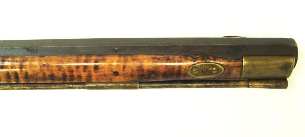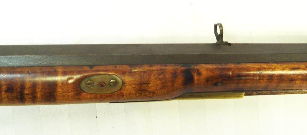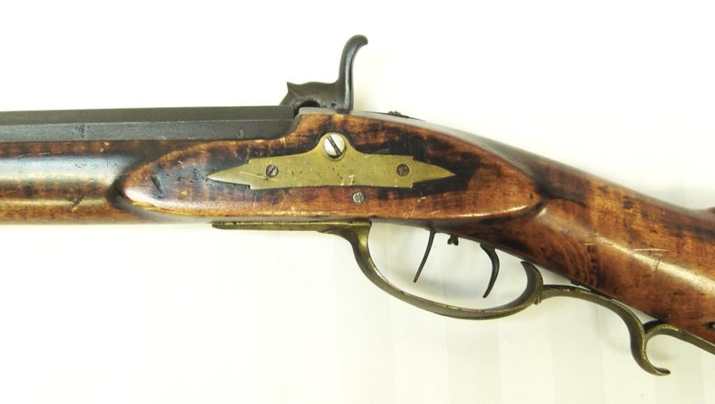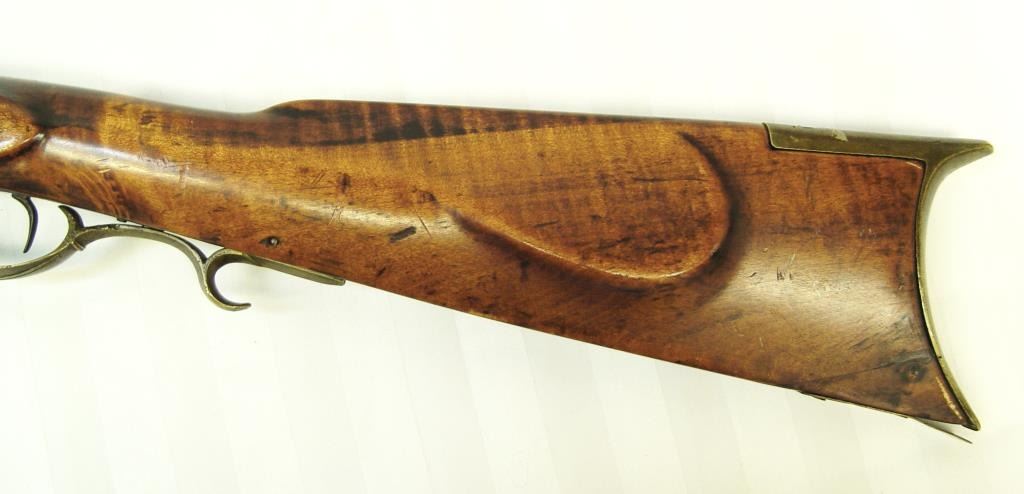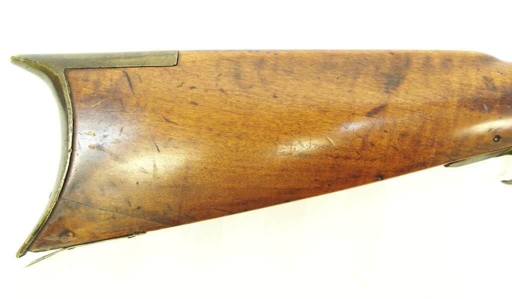 rifle made 1860s after the sale of the St. Louis shop and relocation. Measures 58” overall with a 42” barrel and .40 caliber of medium weight. Minor wood restorations and light refinishing to the wood with minor losses along the top edges of the stock near fore end cap at each side of the muzzle. In good to very good overall. (Antique) Est.: $6,000-$12,000