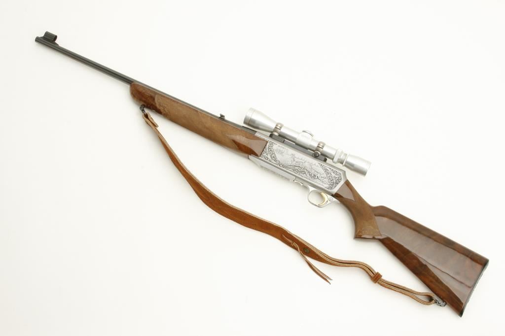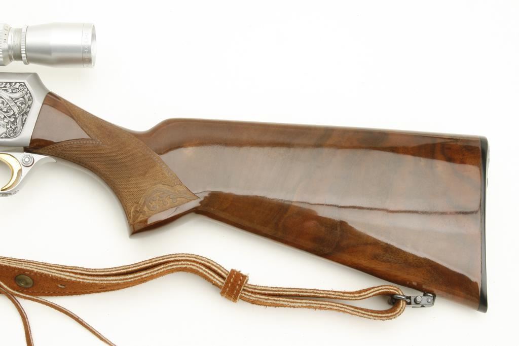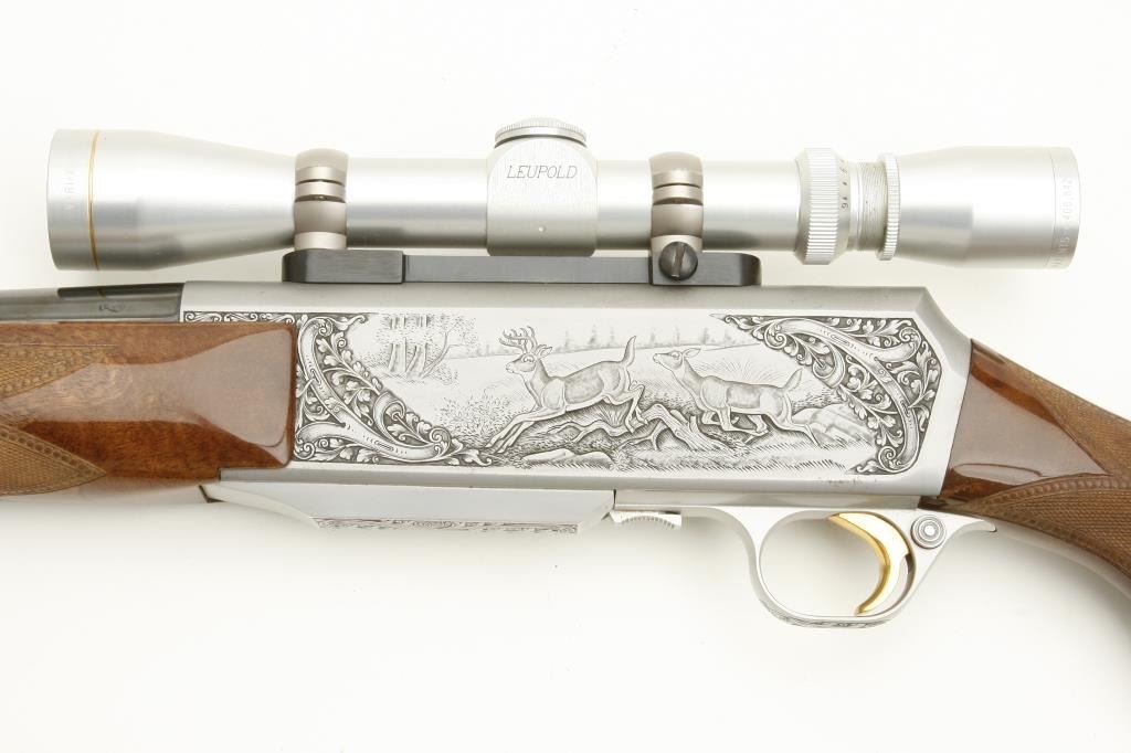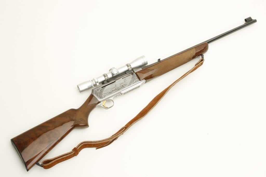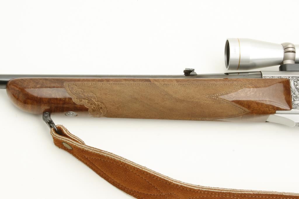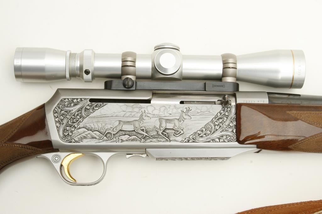 caliber, S/N 70325-M70 mounted with matching satin finish and Leupold scope (3x9) on Browning mount in original factory taps. In fine to excellent condition with very little use. Quick detachable sling mounts with deluxe suede sling. Original Browning butt plate. Beautiful carved deluxe wood with minimal handling and storage. 98% plus overall. Note: Stag and doe scene on the left side and male and female antelope on the right. Not Portuguese assembled-all Belgium. (Modern) Est.: $2500-$5000