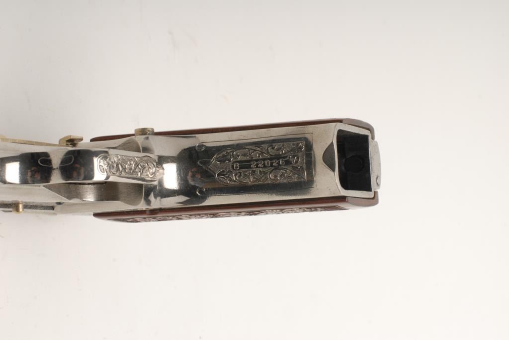 semi-automatic pistol, 9mm caliber, 4.75” barrel, S/N B 22026, nickel finish with gold small part accents, beautiful raised carved hardwood grips, no magazine, in overall fine condition with majority of its nickel and gold finish remaining, beautifully executed engraving, fine bore, crisp action and fine deluxe grips. (Modern). Est.: $2,000-$4,000.