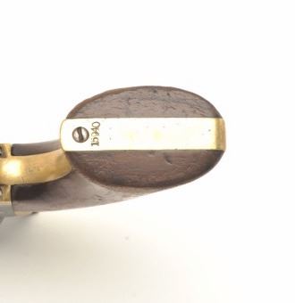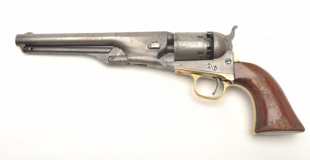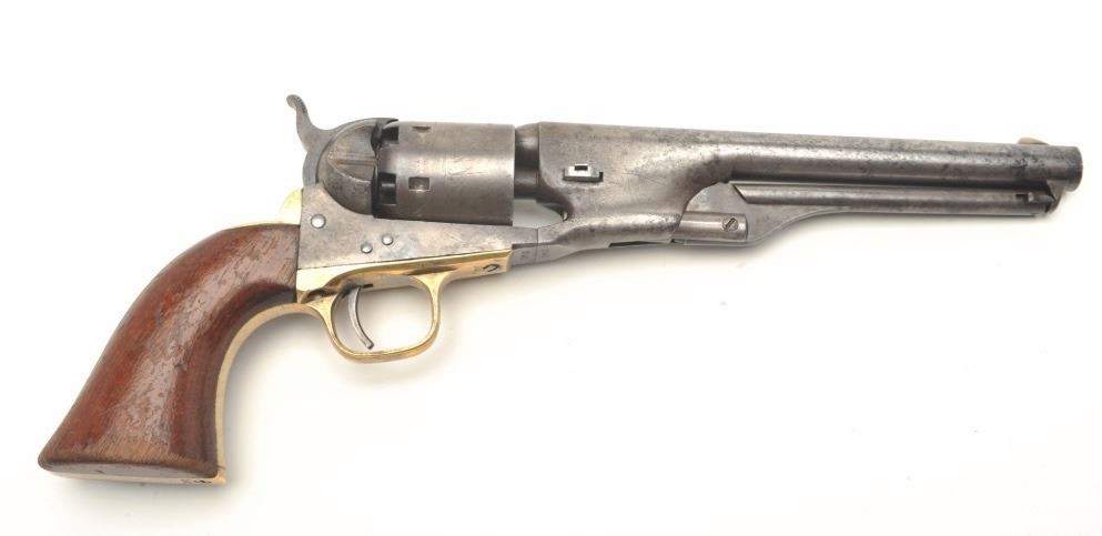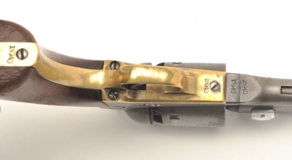 7.5” round barrel, brass straps and wood grips, S/N 15940, all visible numbers matching, majority of original cylinder scene remaining, crisp action, sharp markings, grey patina overall to metal surfaces with some hints of original case colors on the loading lever, hammer and frame in protected areas; scattered spots of erosion visible at firing areas on cylinder; grips are overall good with considerable finish remaining. (Antique). Est.: $1,800-$2,500.