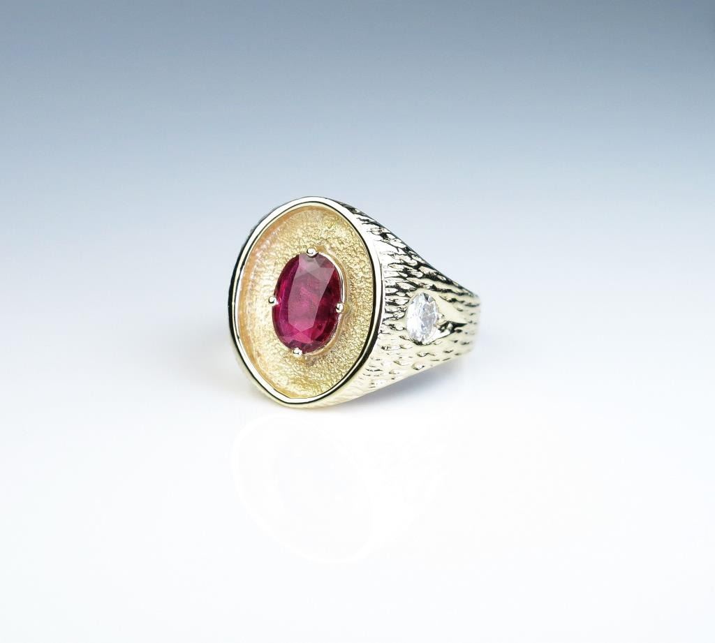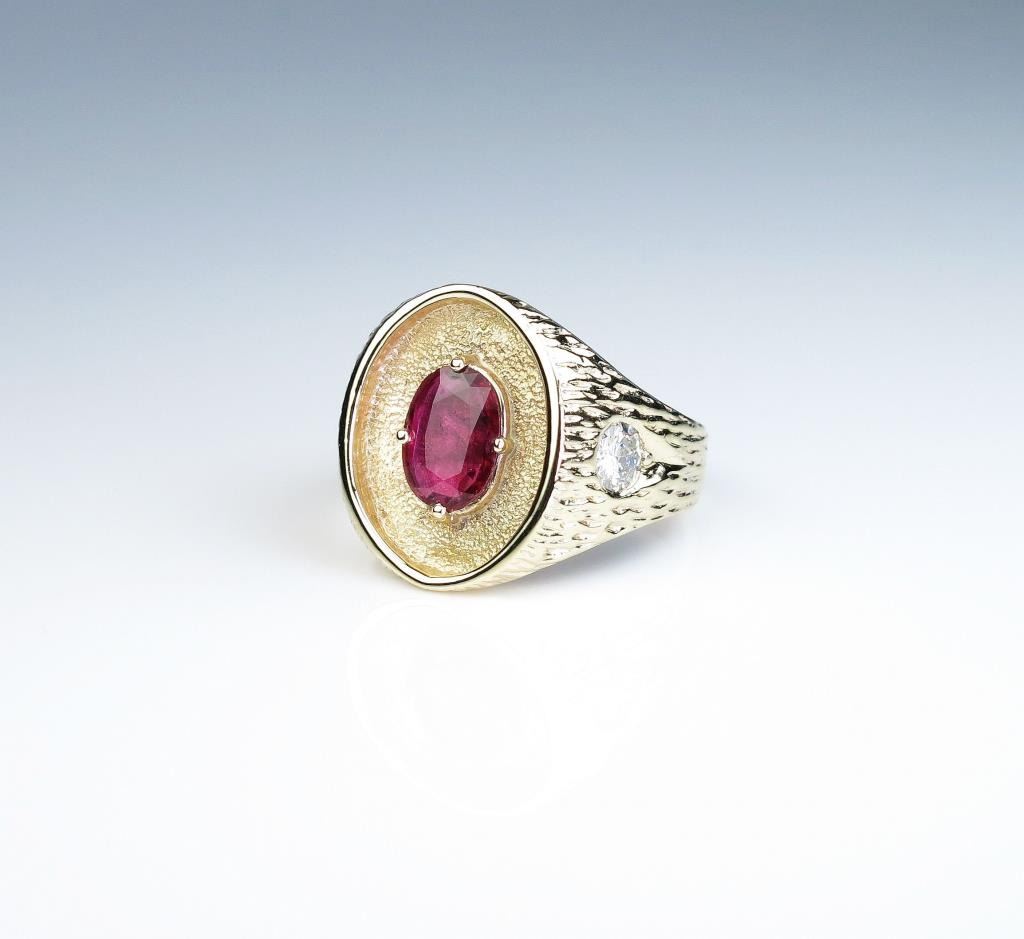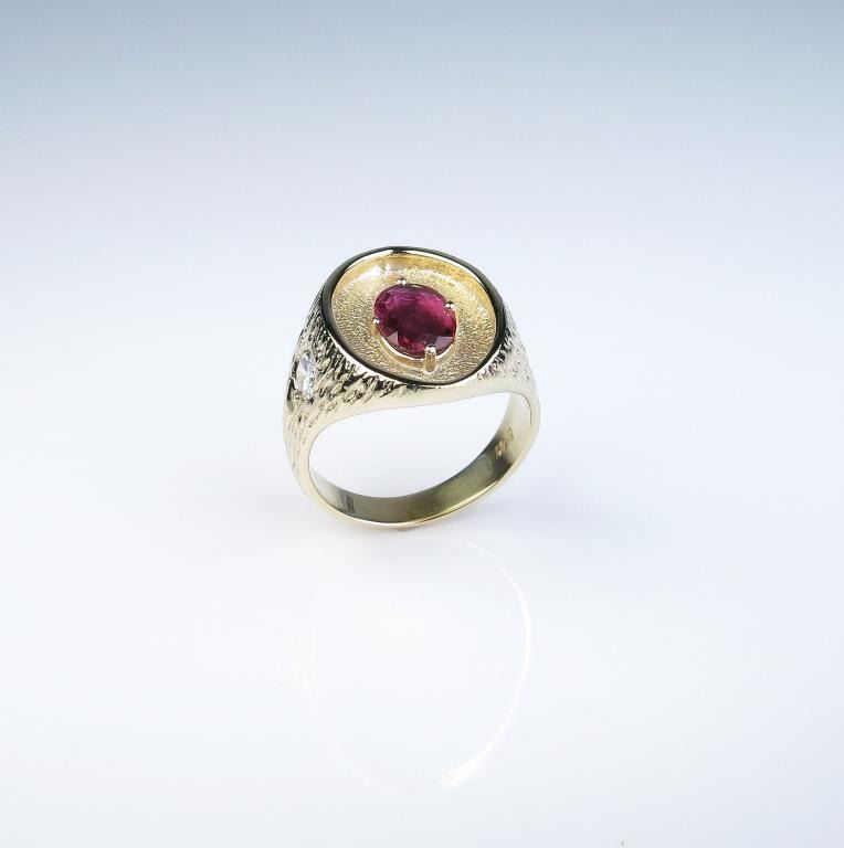 color Ruby weighing 1.30 carats and two side ‘IDEAL ‘cut diamonds weighing approx. 0.70 carats of F-G colors and VS clarity set in a heavy 14 karat yellow gold custom made setting. Retail $5,000-$7,000 Estimates $3,000-$4,000