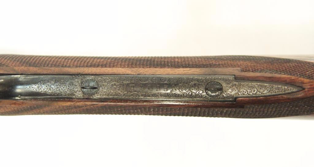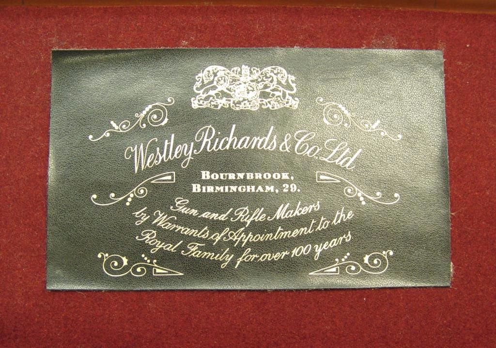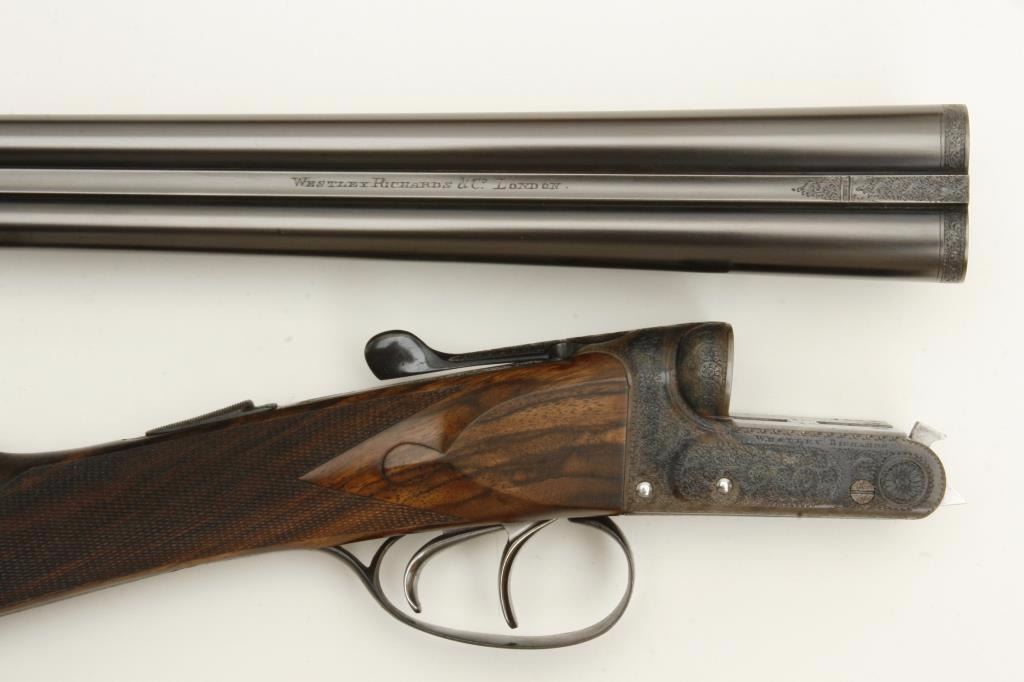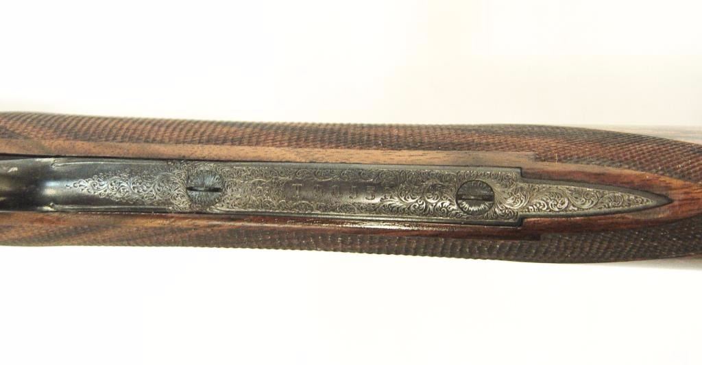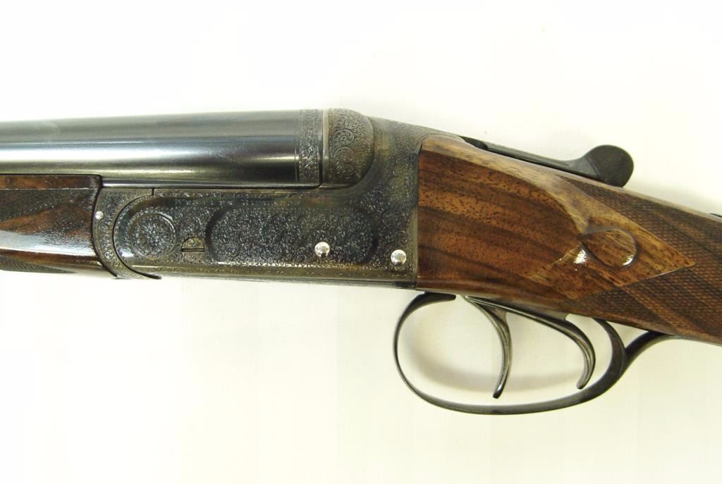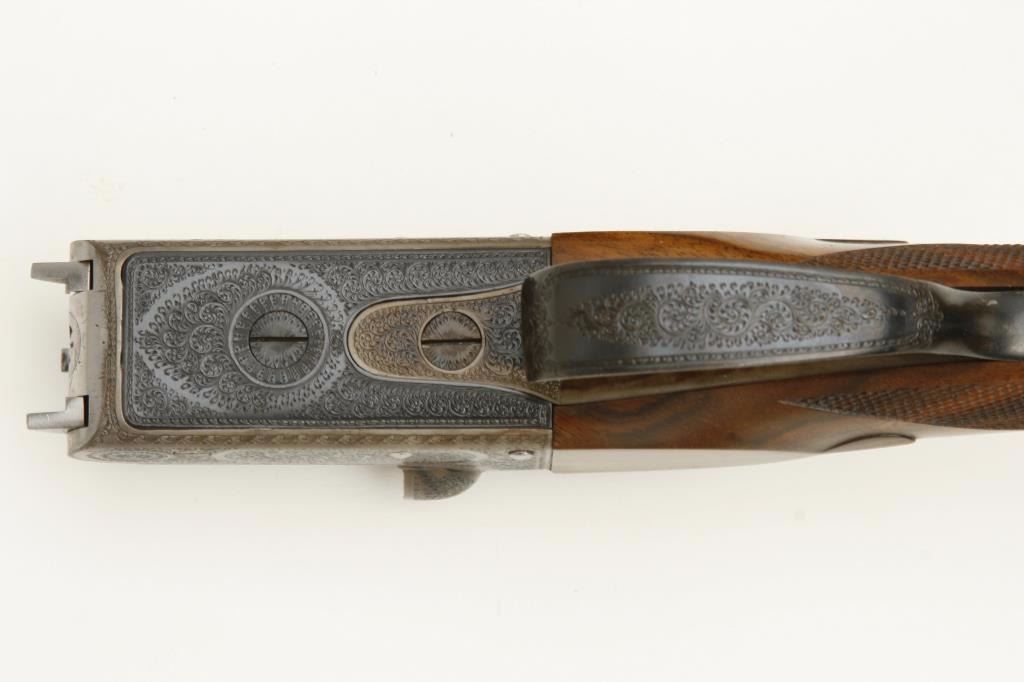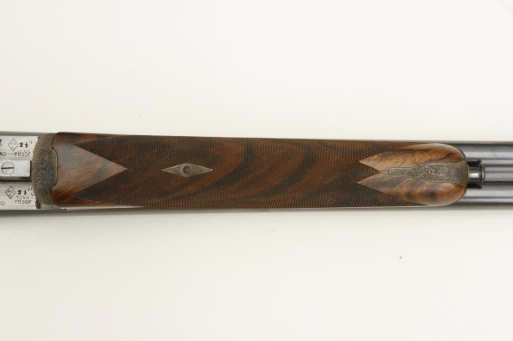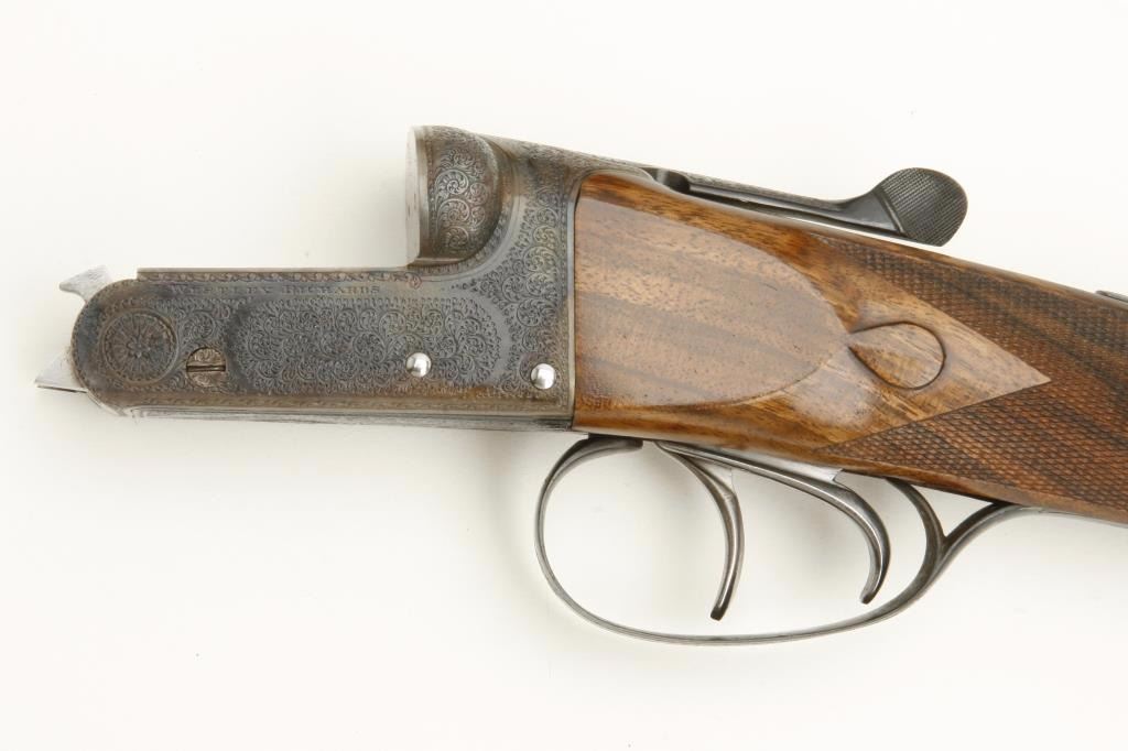 barrels, auto ejectors, double triggers in luggage case with trade label in the lid, S/N T9095. Copy of ledger with Westley Richard’s certification included indicating 1936 manufacture, 26” skeet and skeet, and 2 trigger. The gun shows an English quality refurbish to excellent condition with two sets of proofs (The original for 2 ½” and later English proofs for 3 ½”. The stock also of a later period and finely figured walnut with English straight stock, checkered butt, and splinter fore end. The stock measures 14 ½” from front trigger to the butt with no appreciable cast (normal). ¾” drop at the comb. The gun shows fine and tight banknote scroll engraving. The condition is fine to excellent with very little use since return to 97%-98%. The barrels are fine and within proper thickness range with bright bores. The case is very good plus with normal 70 years of use with label fully visible in the lid (possibly later when returned). Current retail 45000 pounds plus with a long wait (Approximately 60-70 thousand U.S. dollars)