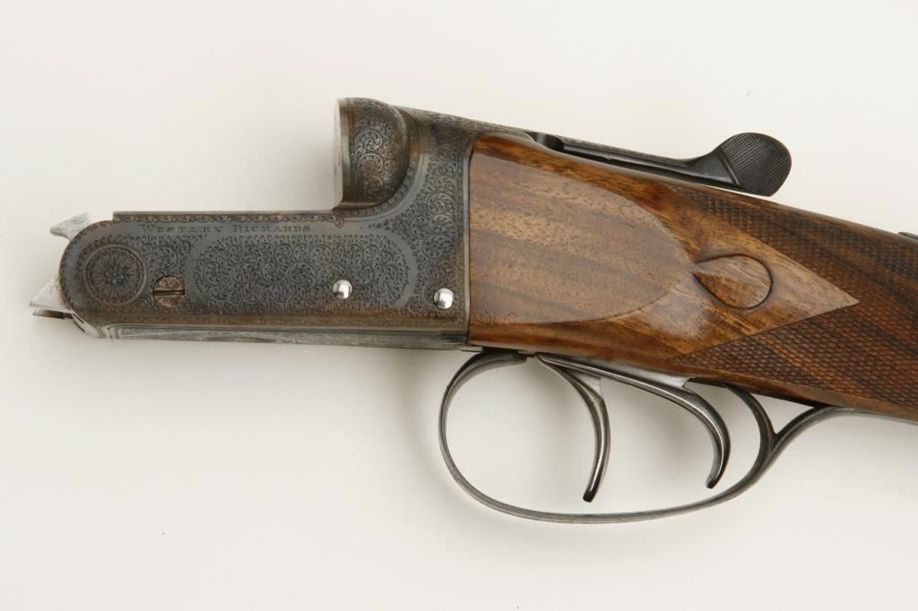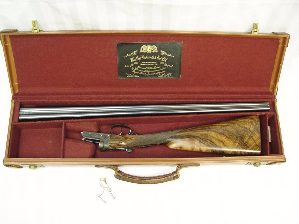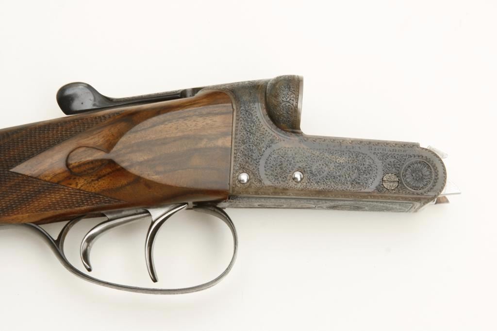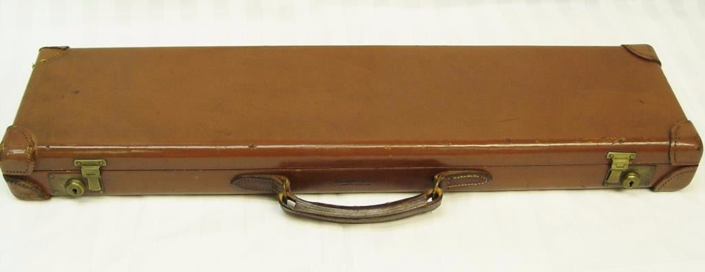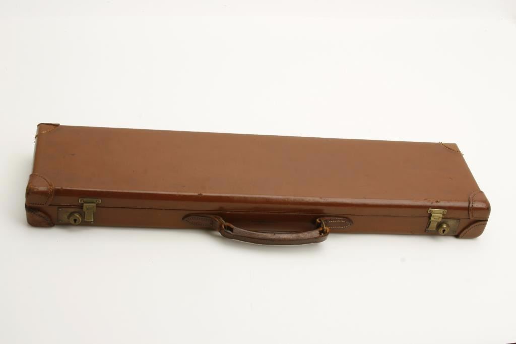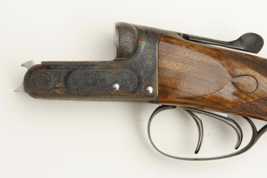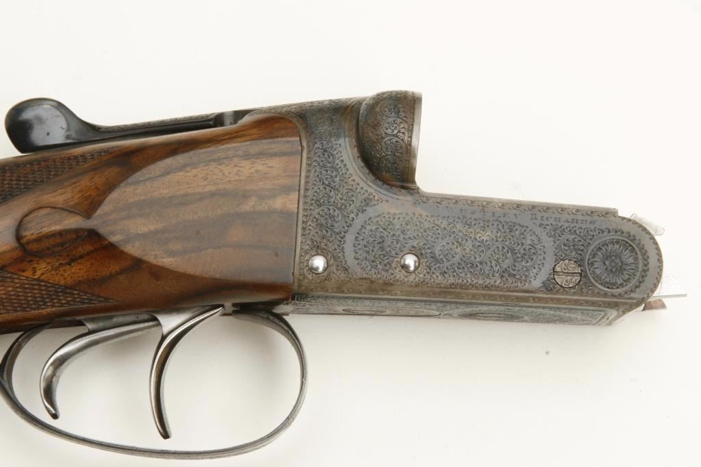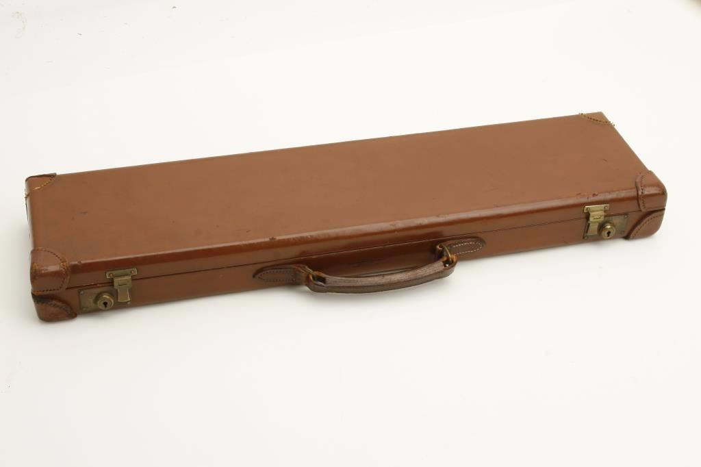 barrels, auto ejectors, double triggers in luggage case with trade label in the lid, S/N T9095. Copy of ledger with Westley Richard’s certification included indicating 1936 manufacture, 26” skeet and skeet, and 2 trigger. The gun shows an English quality refurbish to excellent condition with two sets of proofs (The original for 2 ½” and later English proofs for 3 ½”. The stock also of a later period and finely figured walnut with English straight stock, checkered butt, and splinter fore end. The stock measures 14 ½” from front trigger to the butt with no appreciable cast (normal). ¾” drop at the comb. The gun shows fine and tight banknote scroll engraving. The condition is fine to excellent with very little use since return to 97%-98%. The barrels are fine and within proper thickness range with bright bores. The case is very good plus with normal 70 years of use with label fully visible in the lid (possibly later when returned). Current retail 45000 pounds plus with a long wait (Approximately 60-70 thousand U.S. dollars)