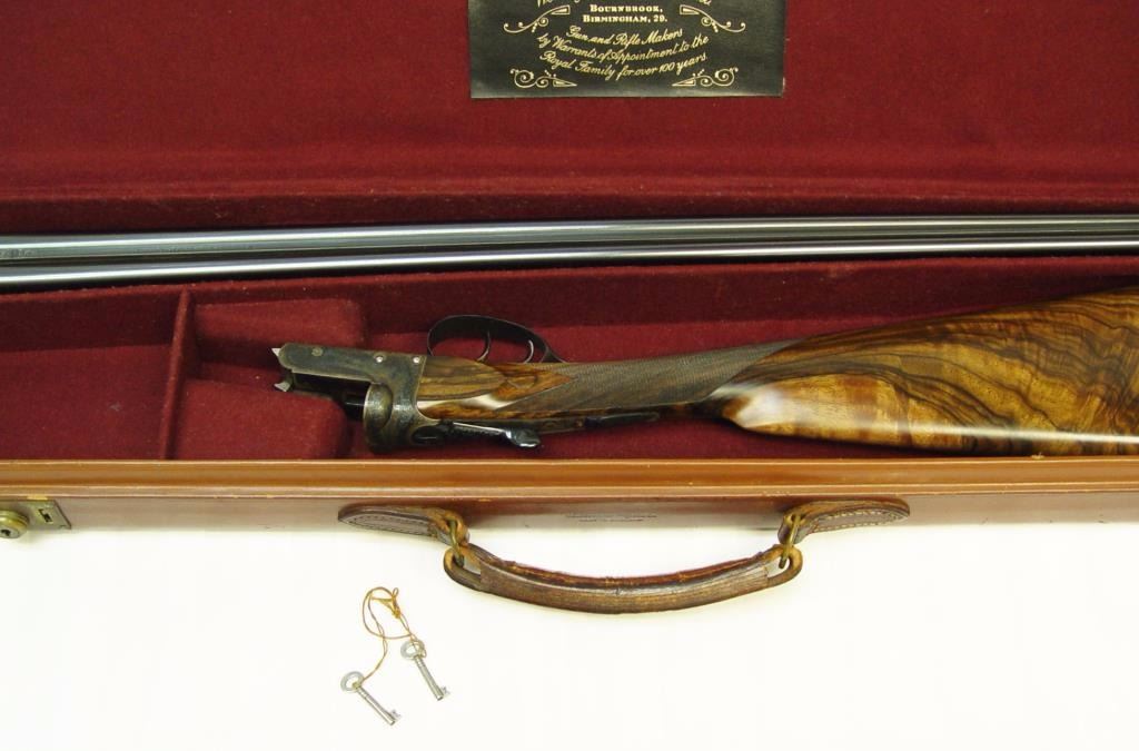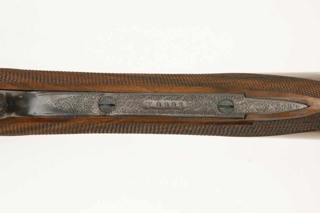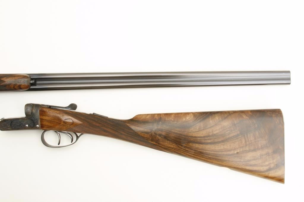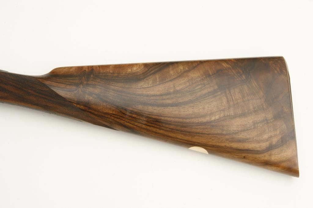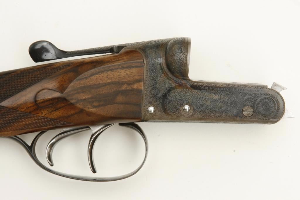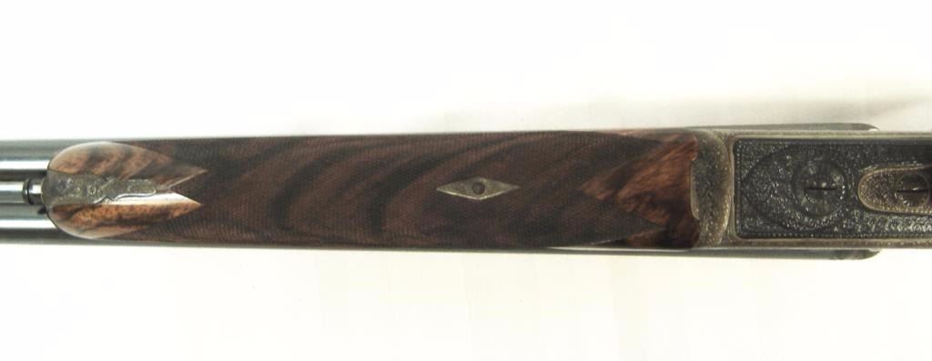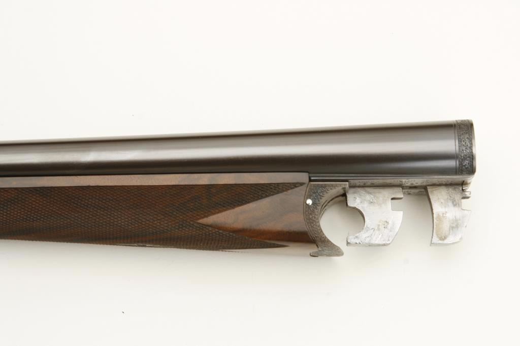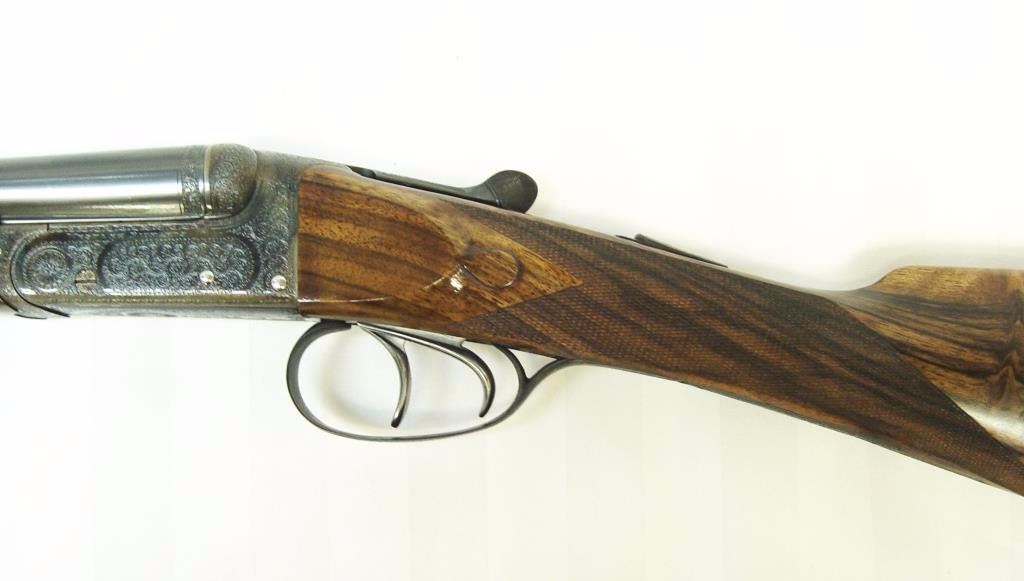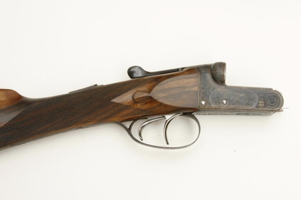 barrels, auto ejectors, double triggers in luggage case with trade label in the lid, S/N T9095. Copy of ledger with Westley Richard’s certification included indicating 1936 manufacture, 26” skeet and skeet, and 2 trigger. The gun shows an English quality refurbish to excellent condition with two sets of proofs (The original for 2 ½” and later English proofs for 3 ½”. The stock also of a later period and finely figured walnut with English straight stock, checkered butt, and splinter fore end. The stock measures 14 ½” from front trigger to the butt with no appreciable cast (normal). ¾” drop at the comb. The gun shows fine and tight banknote scroll engraving. The condition is fine to excellent with very little use since return to 97%-98%. The barrels are fine and within proper thickness range with bright bores. The case is very good plus with normal 70 years of use with label fully visible in the lid (possibly later when returned). Current retail 45000 pounds plus with a long wait (Approximately 60-70 thousand U.S. dollars)