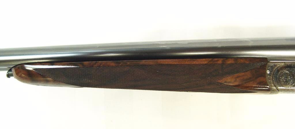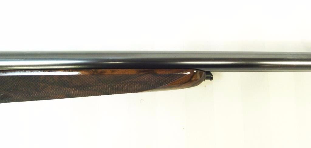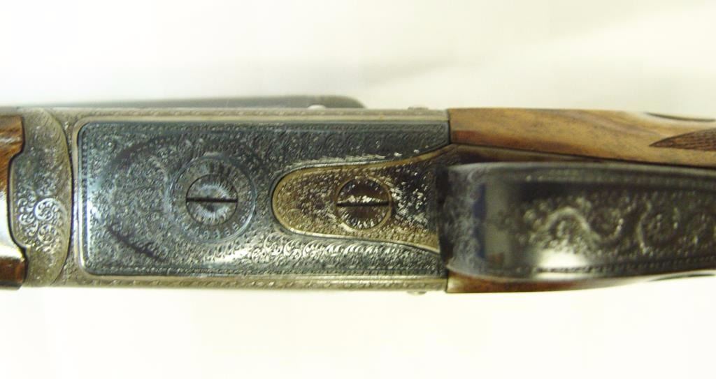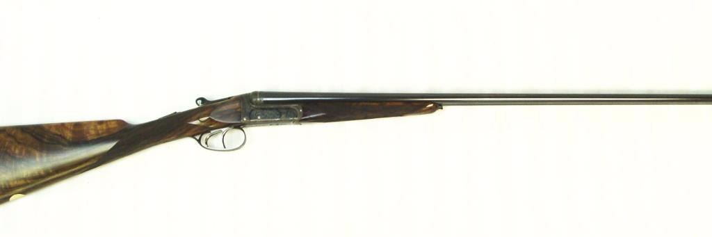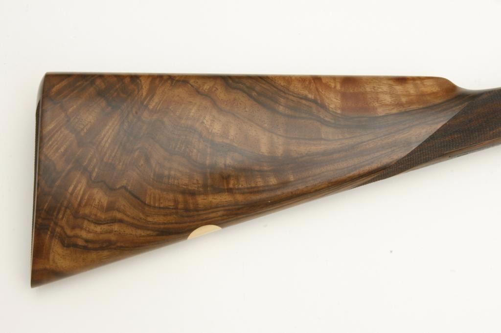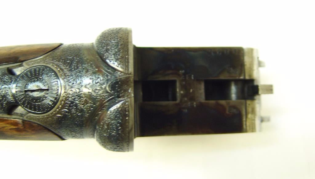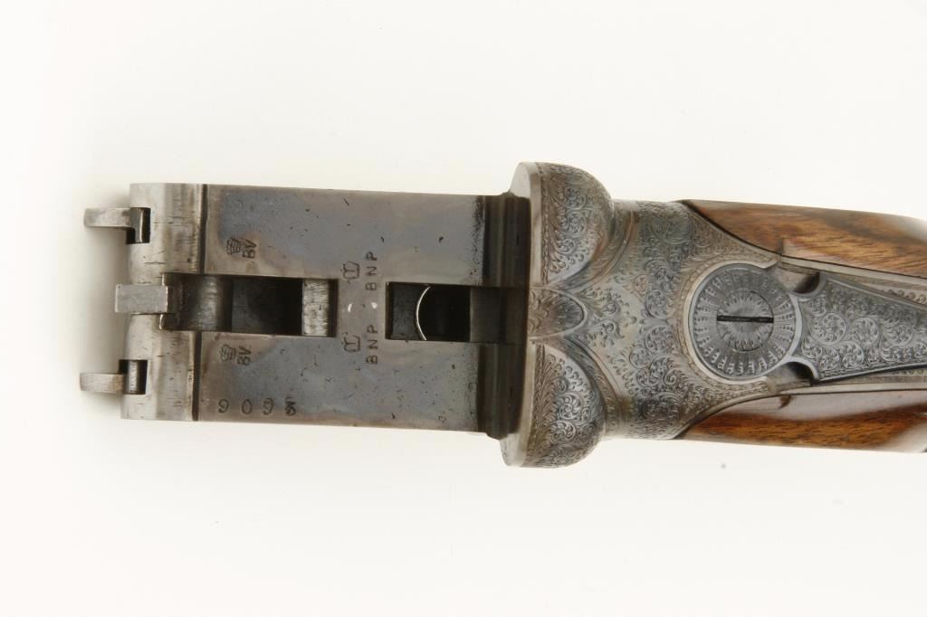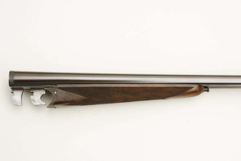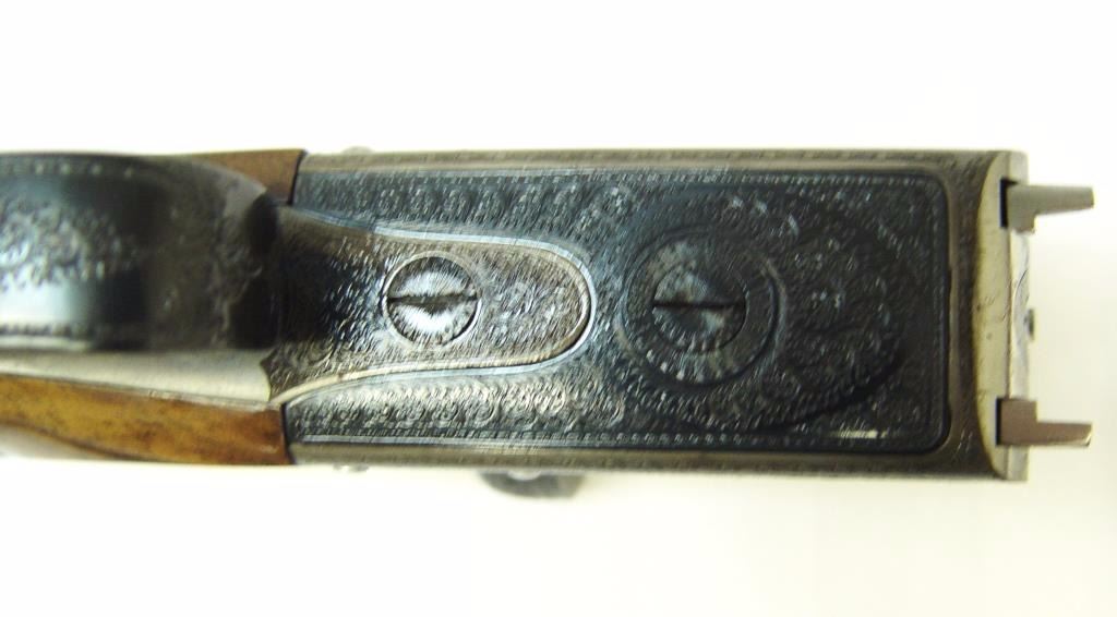 barrels, auto ejectors, double triggers in luggage case with trade label in the lid, S/N T9095. Copy of ledger with Westley Richard’s certification included indicating 1936 manufacture, 26” skeet and skeet, and 2 trigger. The gun shows an English quality refurbish to excellent condition with two sets of proofs (The original for 2 ½” and later English proofs for 3 ½”. The stock also of a later period and finely figured walnut with English straight stock, checkered butt, and splinter fore end. The stock measures 14 ½” from front trigger to the butt with no appreciable cast (normal). ¾” drop at the comb. The gun shows fine and tight banknote scroll engraving. The condition is fine to excellent with very little use since return to 97%-98%. The barrels are fine and within proper thickness range with bright bores. The case is very good plus with normal 70 years of use with label fully visible in the lid (possibly later when returned). Current retail 45000 pounds plus with a long wait (Approximately 60-70 thousand U.S. dollars)