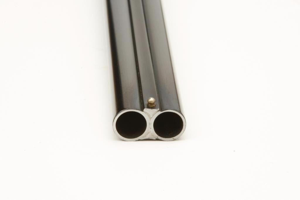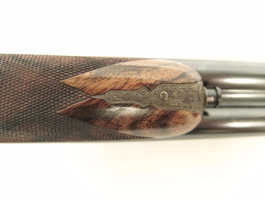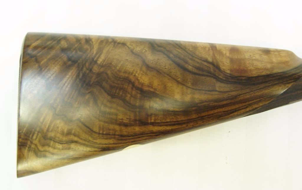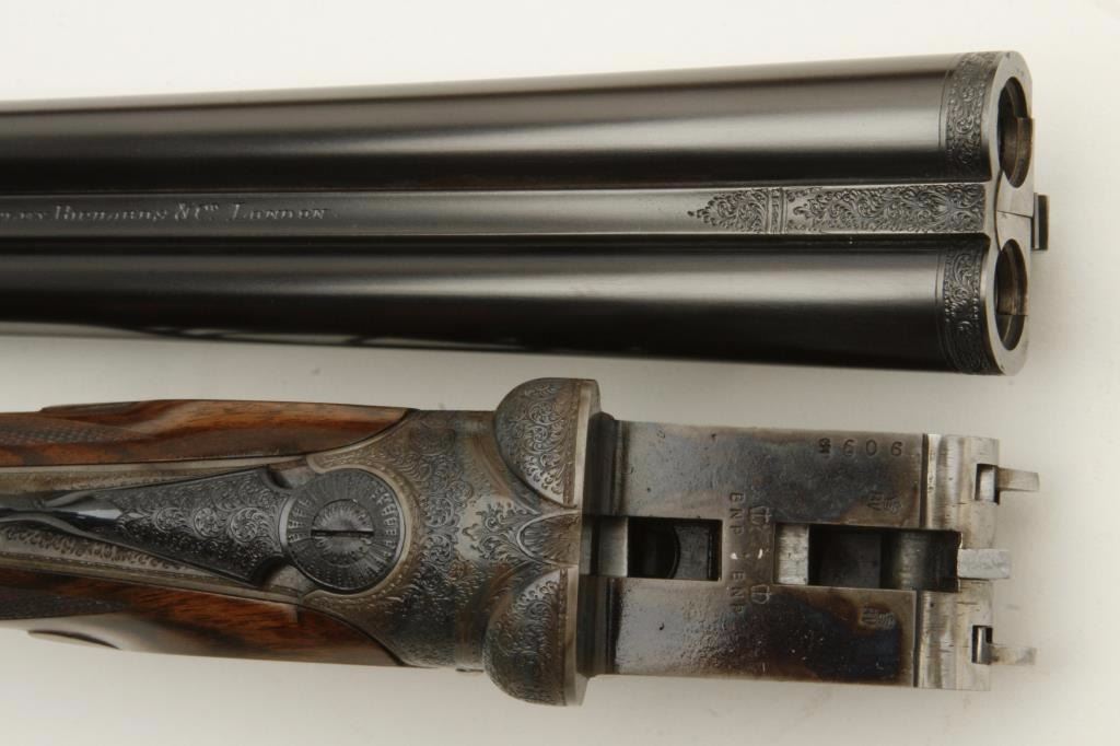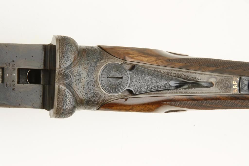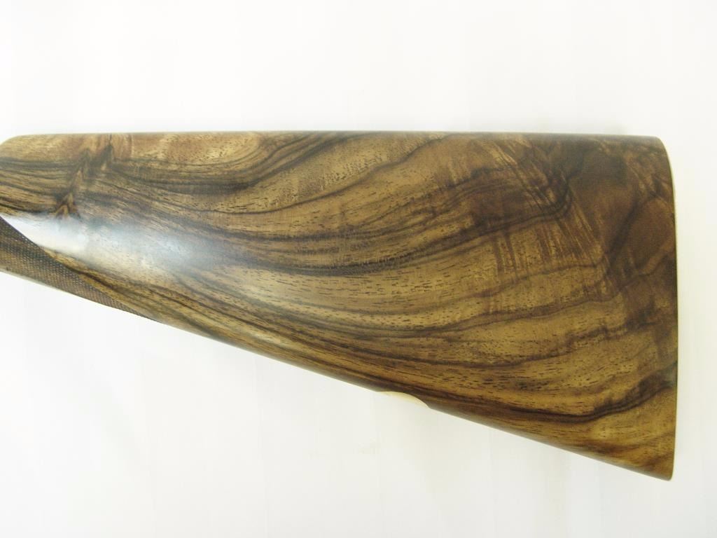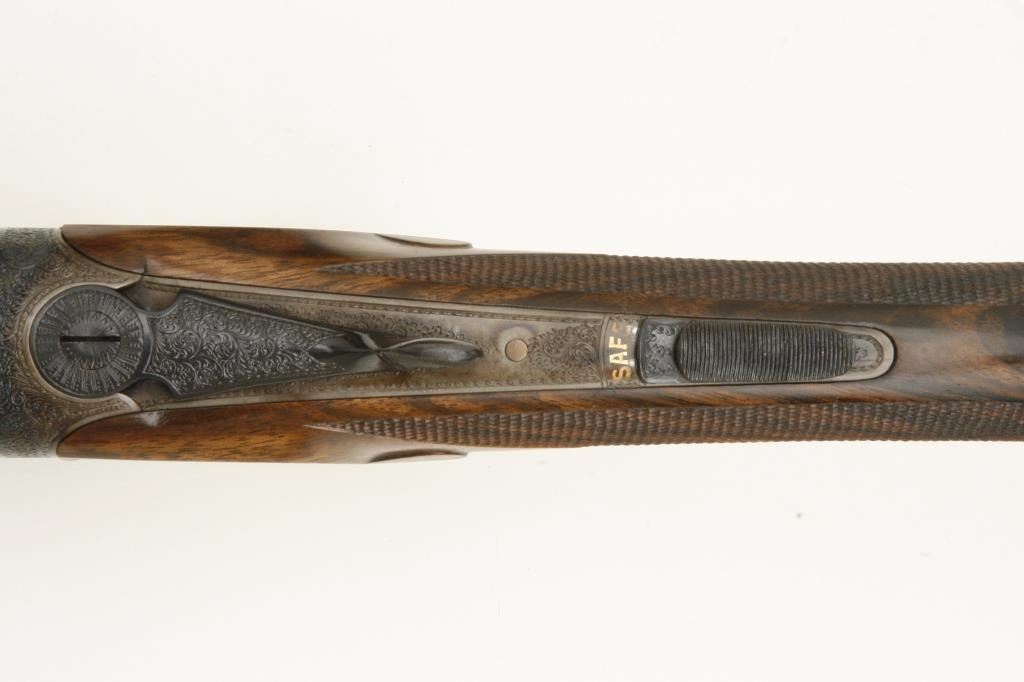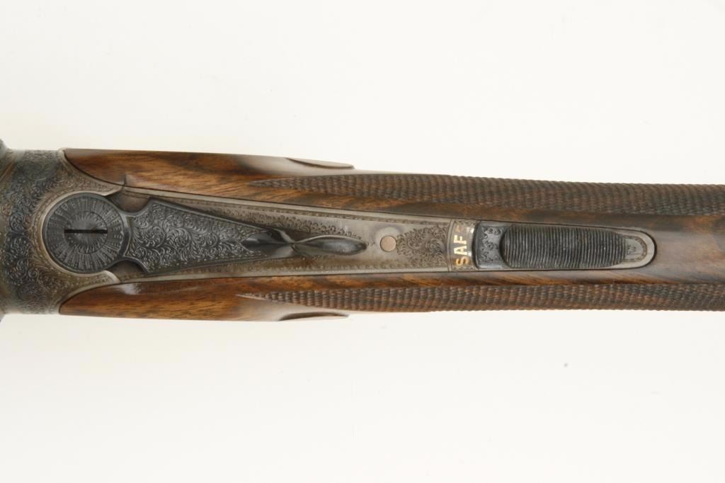 barrels, auto ejectors, double triggers in luggage case with trade label in the lid, S/N T9095. Copy of ledger with Westley Richard’s certification included indicating 1936 manufacture, 26” skeet and skeet, and 2 trigger. The gun shows an English quality refurbish to excellent condition with two sets of proofs (The original for 2 ½” and later English proofs for 3 ½”. The stock also of a later period and finely figured walnut with English straight stock, checkered butt, and splinter fore end. The stock measures 14 ½” from front trigger to the butt with no appreciable cast (normal). ¾” drop at the comb. The gun shows fine and tight banknote scroll engraving. The condition is fine to excellent with very little use since return to 97%-98%. The barrels are fine and within proper thickness range with bright bores. The case is very good plus with normal 70 years of use with label fully visible in the lid (possibly later when returned). Current retail 45000 pounds plus with a long wait (Approximately 60-70 thousand U.S. dollars)