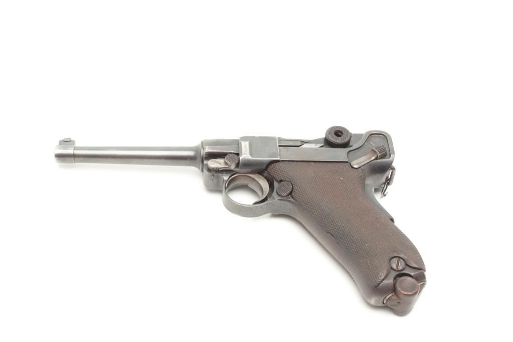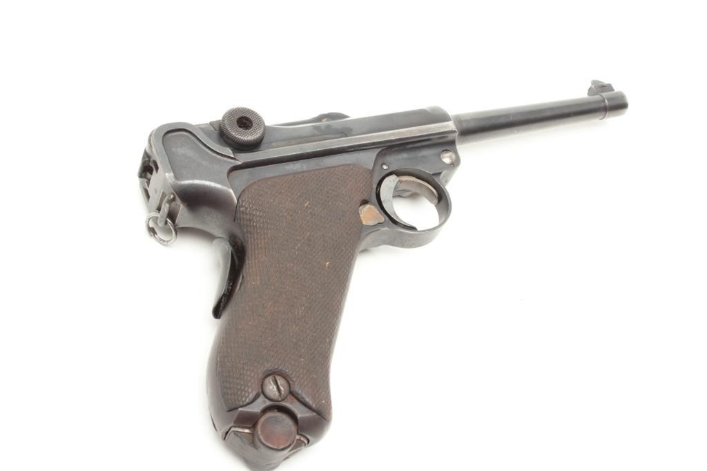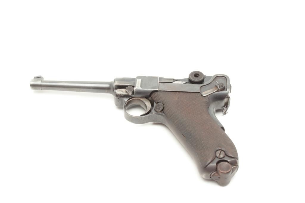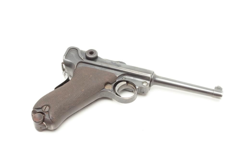 Manel 2nd on breech, S/N 1604. 75%-85% original thinning and toning blue finish showing some losses at high points, muzzle and edges. Sharp overall. Matching visible numbers and good grips with slight wear to the checkering. Correct proofs and wood bottom unmarked clip. Very bright interior with good plus bore. A collector’s Luger for the guy who likes them real rather than mint (Not real). (C&R/PPT) Est.: $1250-$2500