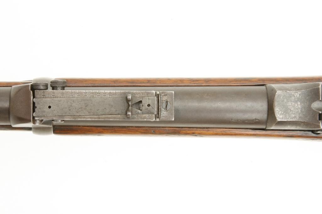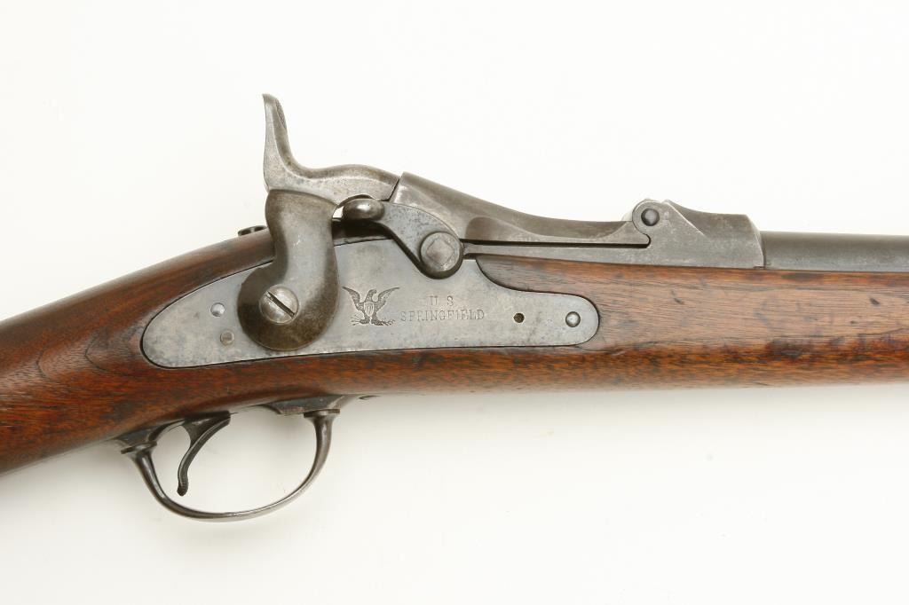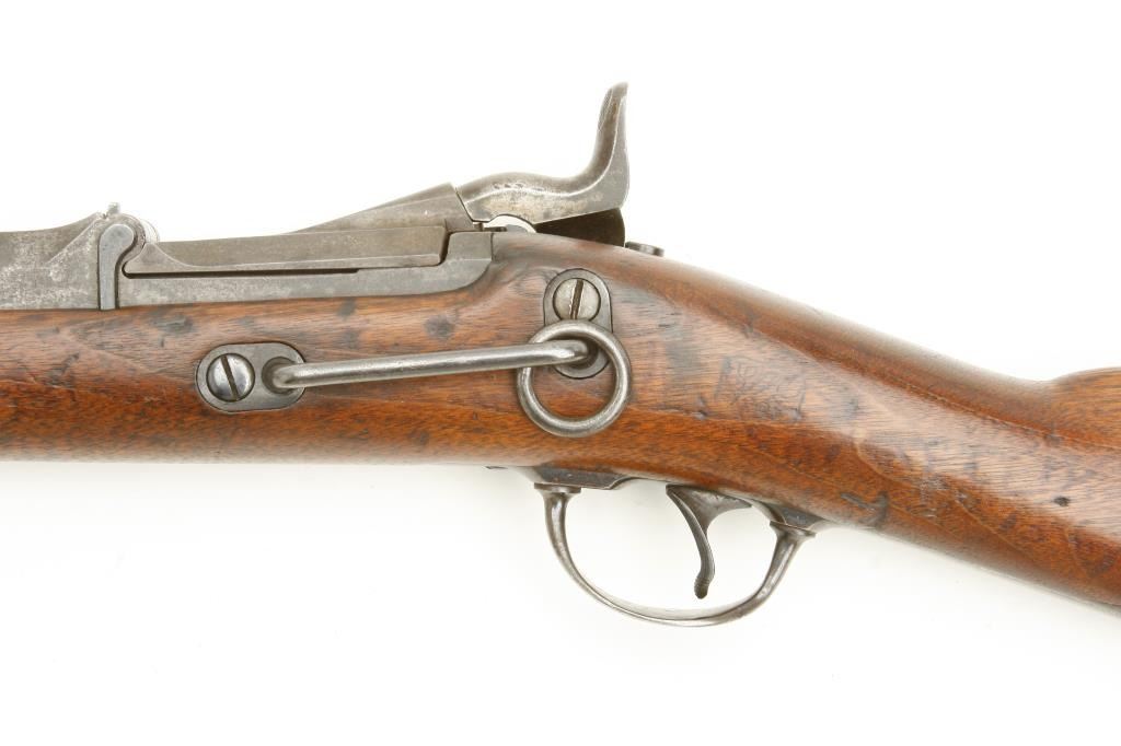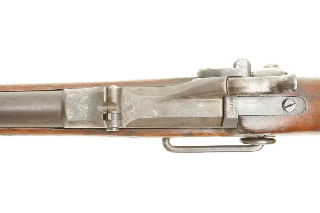 S/N 380096. In good to very good original as issued condition with 1887 cartouche mostly visible. Refer Flayderman 9A-389. 50%-60% original blue overall with good sharp eagle and markings on the lock plate. Also the wood is very good with minor dents, mars and dings consistent with military use and storage. The bore is good with normal wear to the rifling. The rod and extractor in the butt trap is included. (Antique) Est.: $1400-$2800
