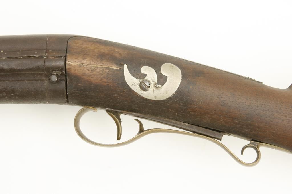 1860s to 70s. Measures 47” overall with a 29 ½” heavy barrel in .45 caliber rifle over 16GA shotgun. An early book on Buffalo Bill mentions this type of O/U being used in Missouri by Pioneers. In fair as found condition with heavy rust and some pitting. Fair to good wood. Uncleaned. Markings on the barrel not legible. Est.: $400-$800
