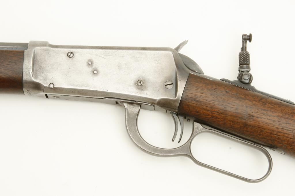 W.S. caliber with double set triggers and Lyman tang sight, S/N 216030. 30%-50% blue on the barrel, action and tube with some light cleaning. Good edges and markings. The stock is good to very good with minor imperfections. Good action and good to very good bore. Double triggers are scarce to rare. (C&R) Est.: $1500-$3000