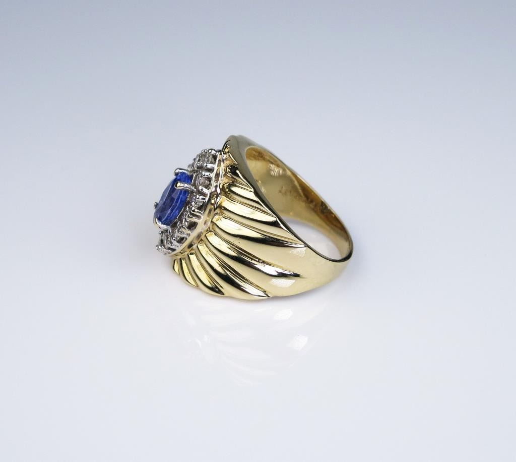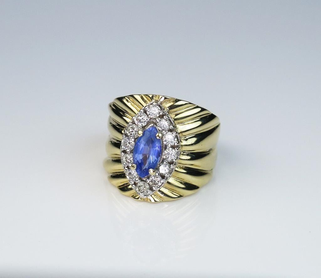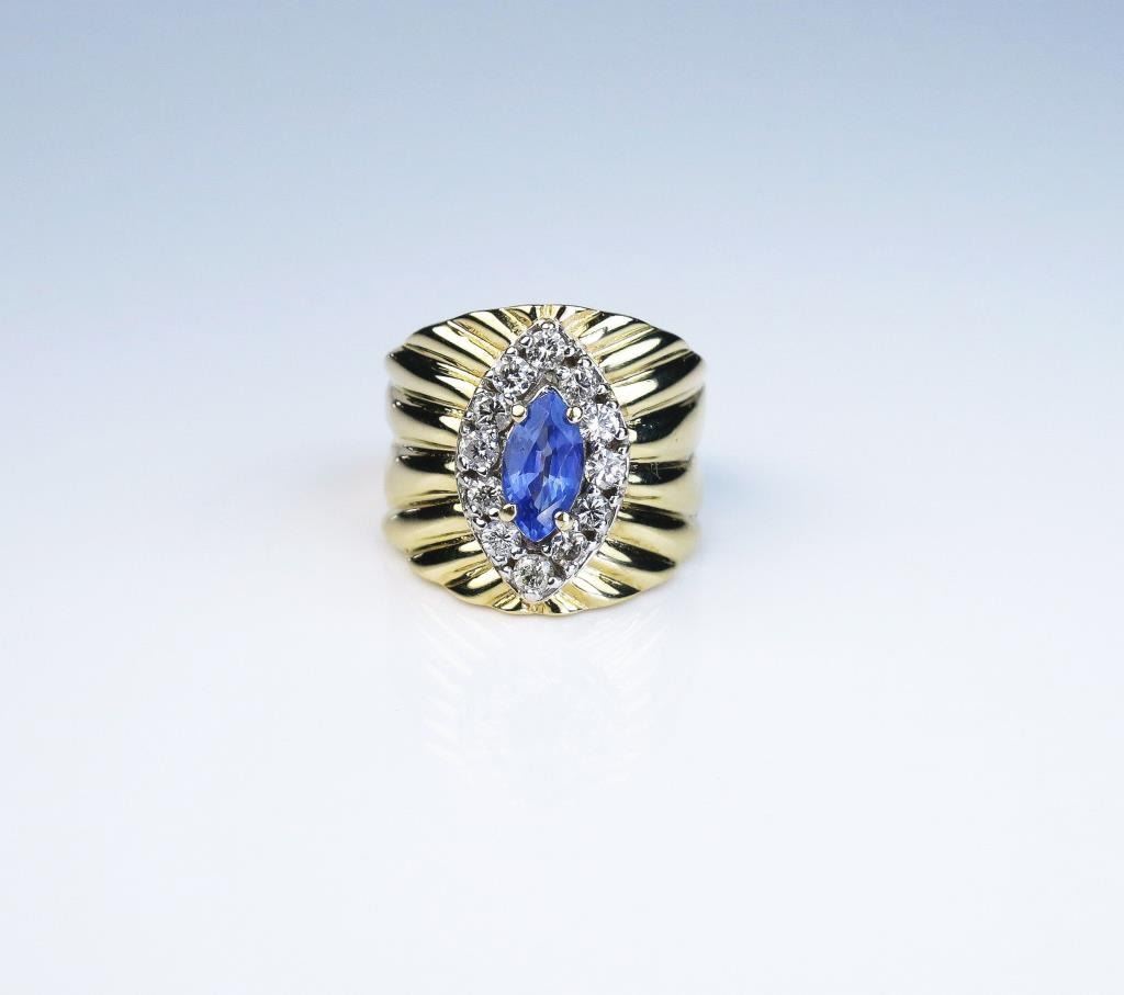 MQ cut Ceylon sapphire weighing approx. 1.00 carat and surrounded by 12 round diamonds weighing approx.. 0.60 carats of G-H colors and SI clarity set in a 14 karat yellow gold custom made setting. Retail $5,950.00 Estimates $3,000-$4,000