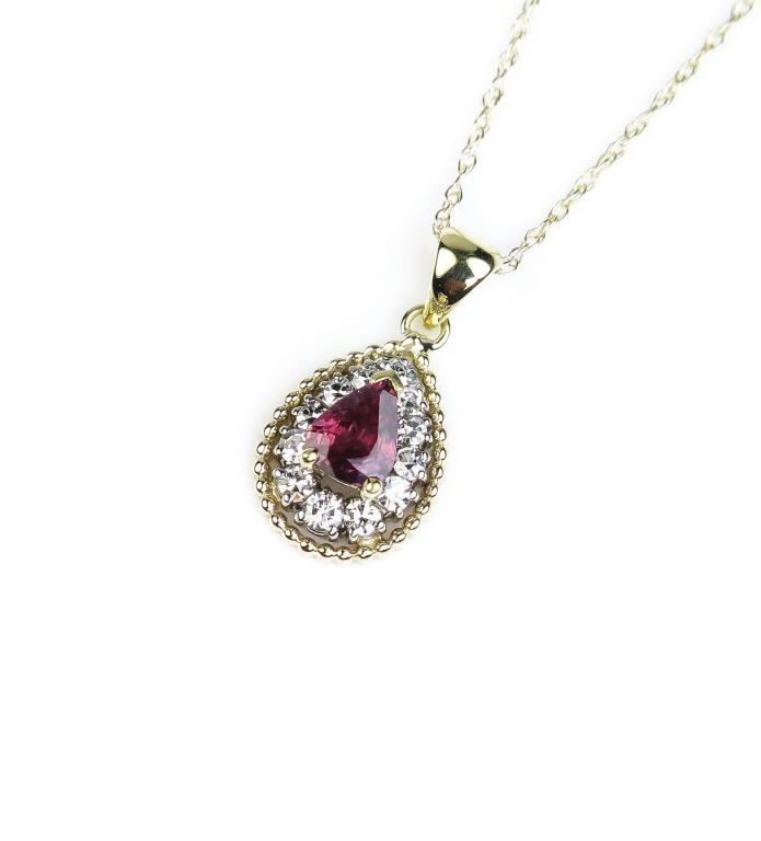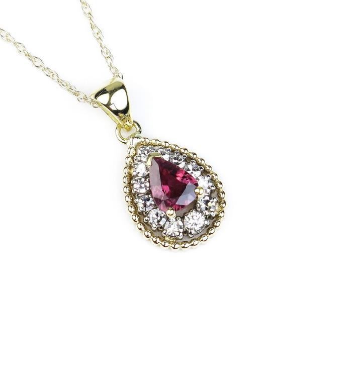 pear shape Ruby weighing approx. 1.00 carat encircled by 12 round diamonds weighing approx. 0.50 carats of F-G colors and VVS/VS clarity set in an 18 karat yellow gold custom made ‘JABEL’ setting. Retail $3,000-$4,000 Estimates $2,000-$3,000