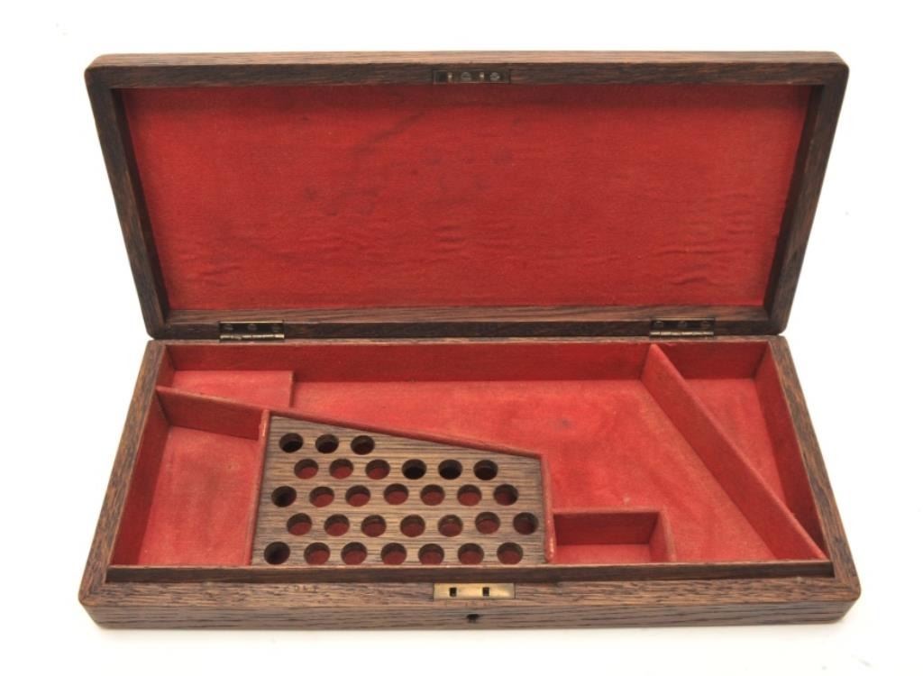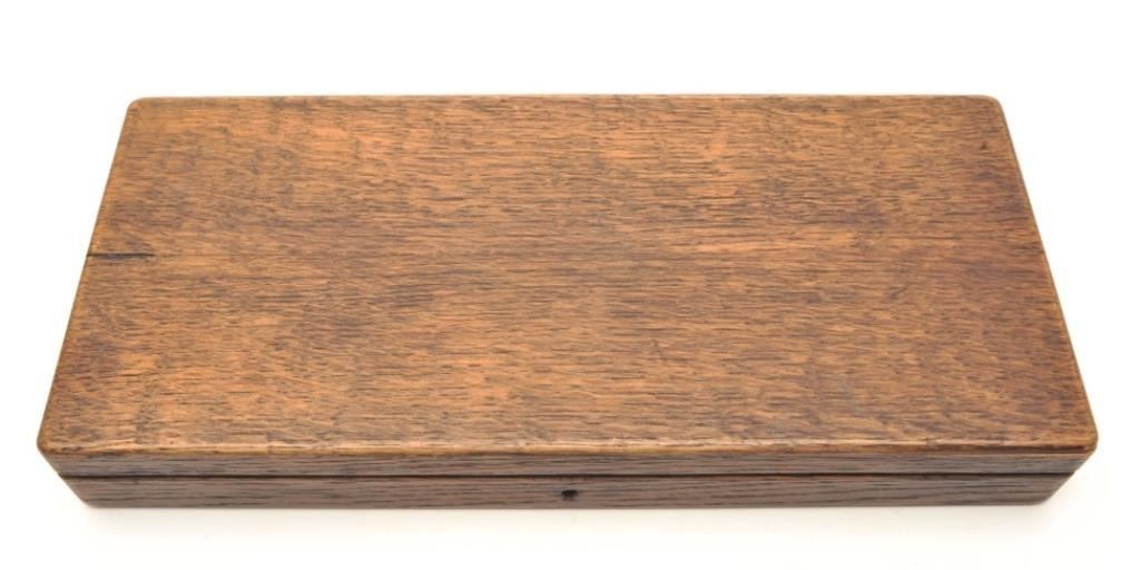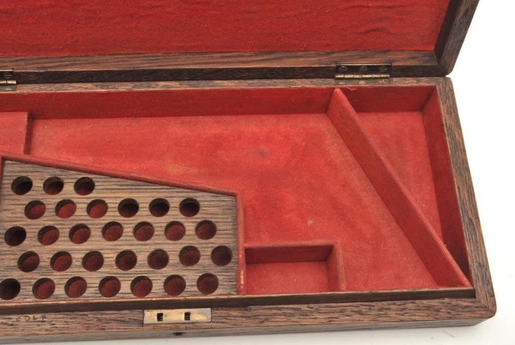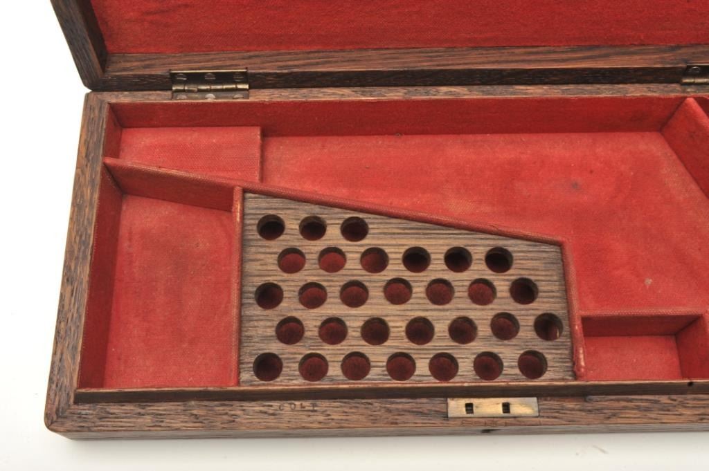 in partition style for 7 ½” Colt single action in .44-40 caliber with cartridge block. Red cotton lining showing some age. The box is good with some wear. We cannot say this is a 19th century Colt case. Box has age of more than 50 years in our opinion. Est.: $250-$500