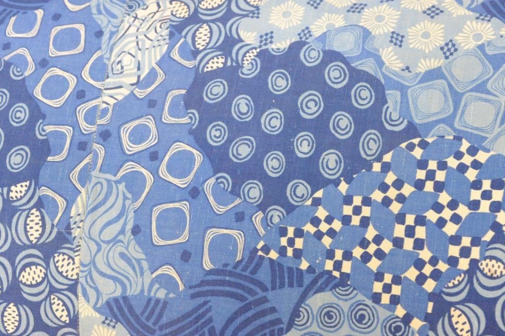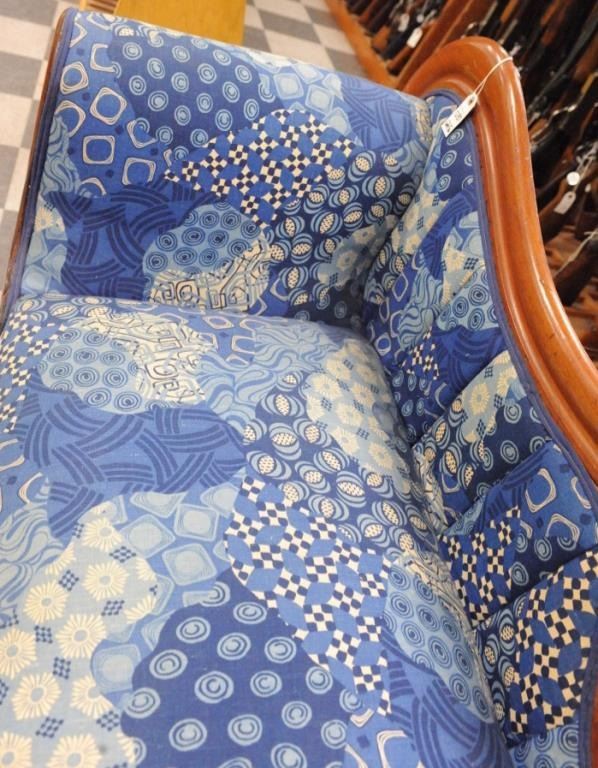 2’ wide and 29” tall at headrest. Overall good condition with multi-color blues and white fabric. Est.: $100-$150.