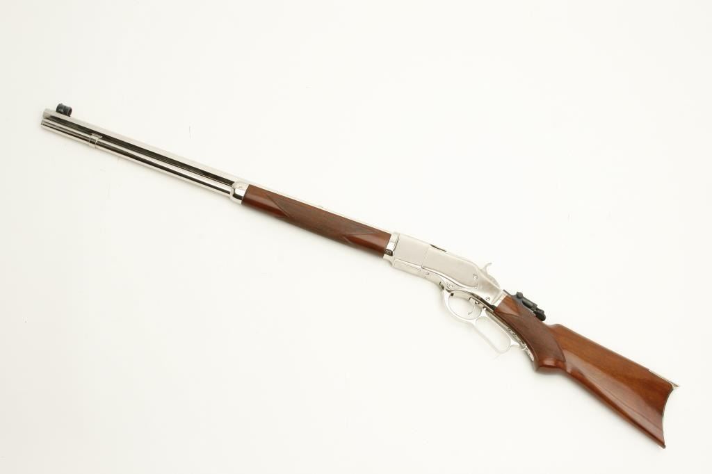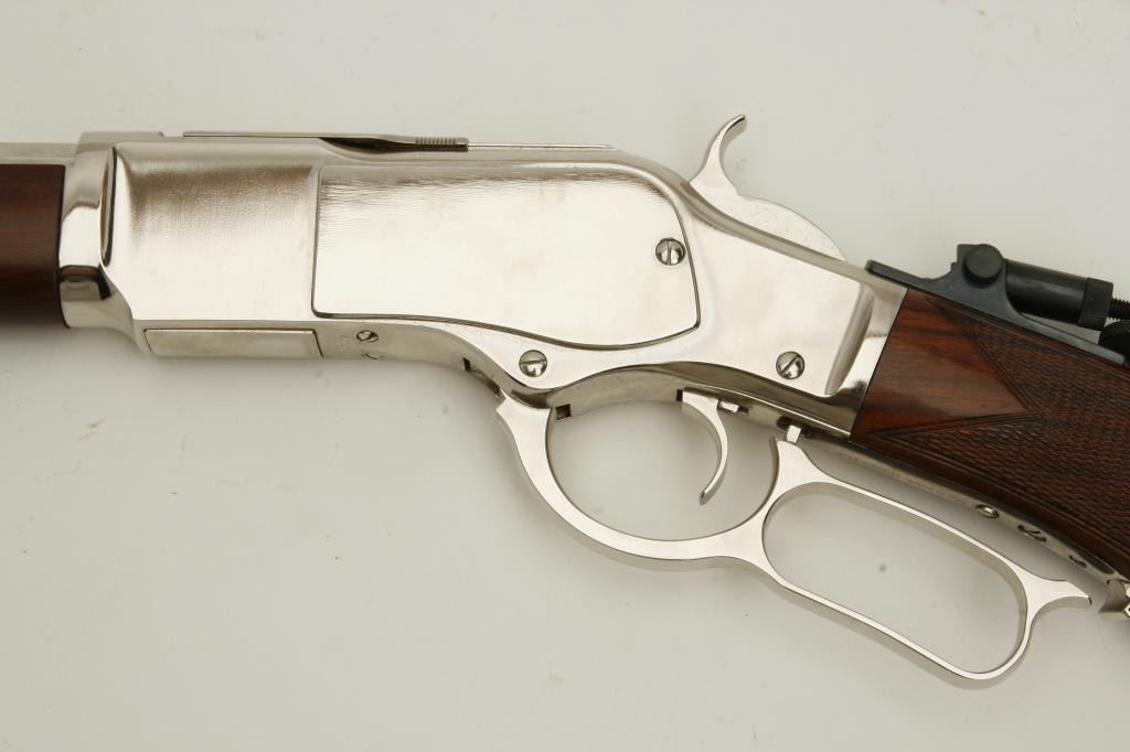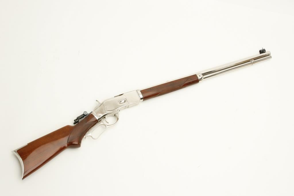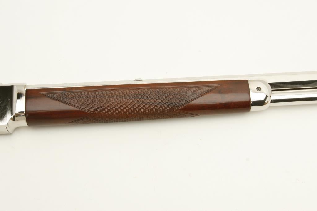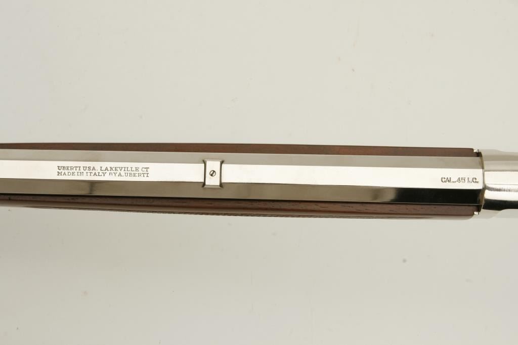 Model 1873 lever action rifle, .45LC caliber, 24” octagon barrel, nickel finish, checkered deluxe wood stocks, S/N 81123, in excellent to like new condition with adjustable Vernier tang sight and hooded front sight that is slightly loose and in need of adjustment. (Modern). Est.: $600-$1,200.