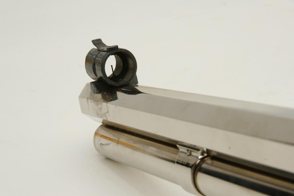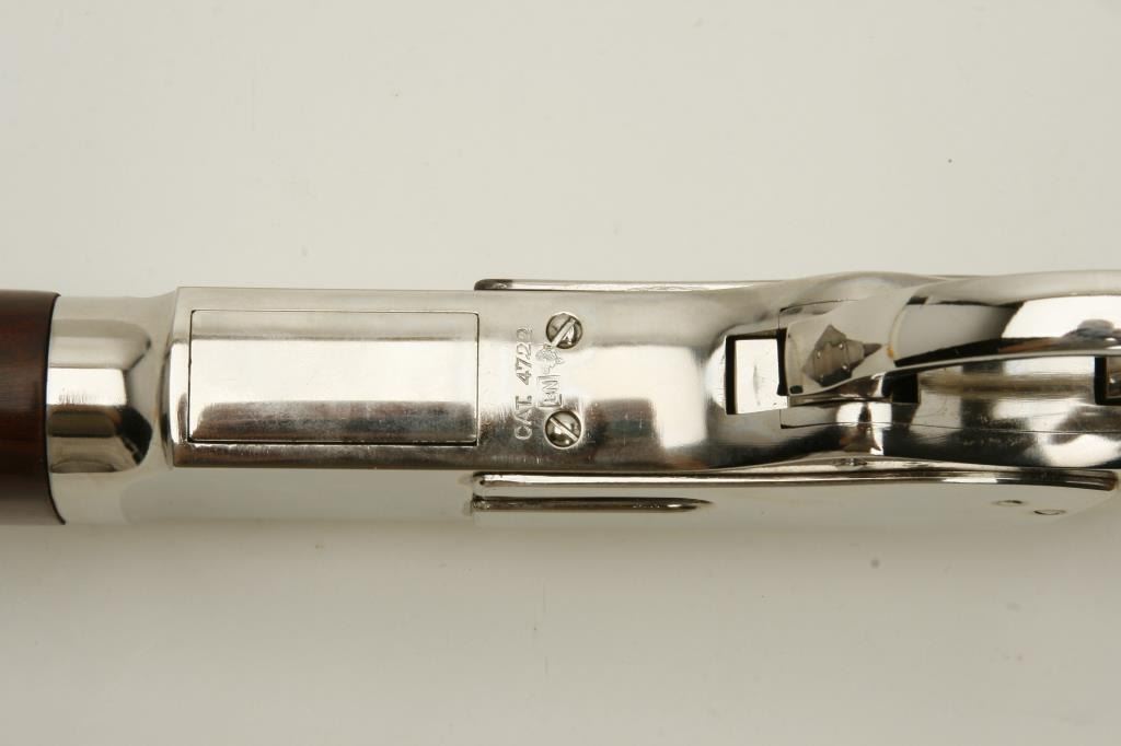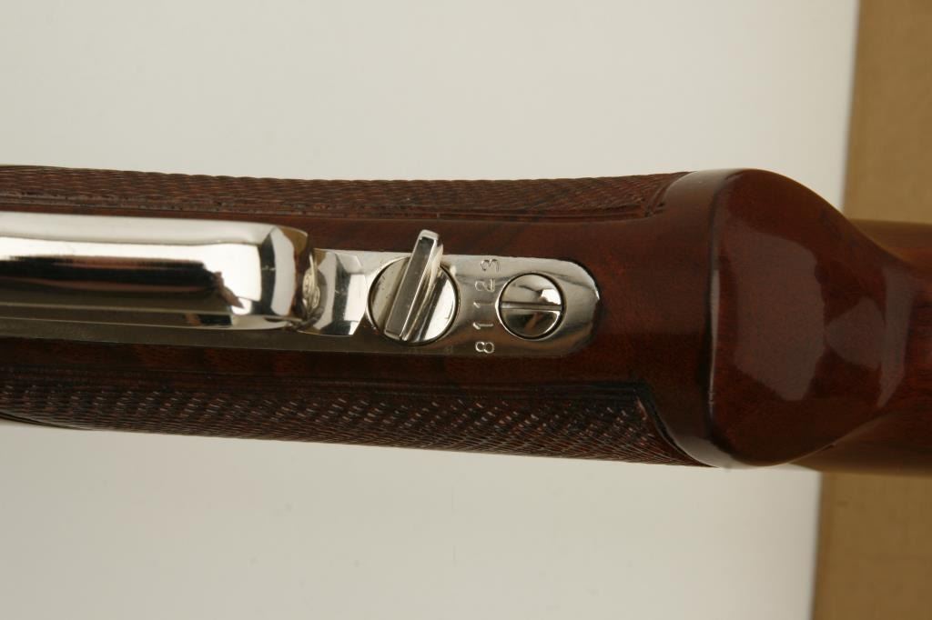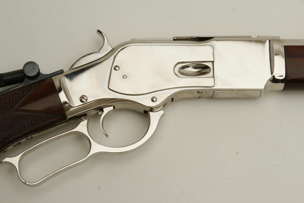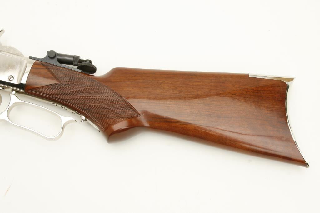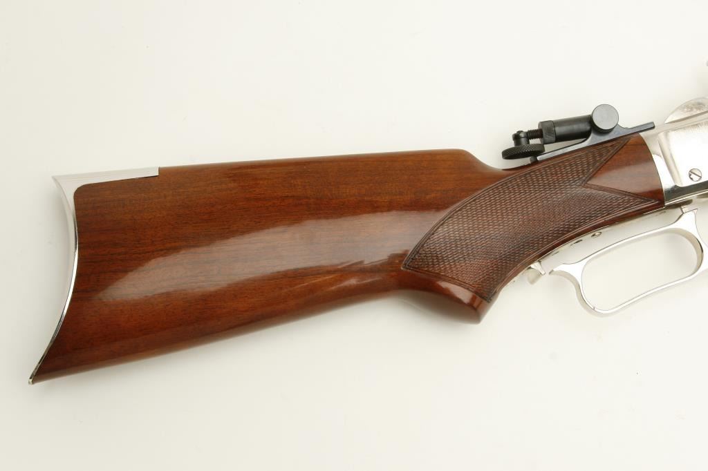 Model 1873 lever action rifle, .45LC caliber, 24” octagon barrel, nickel finish, checkered deluxe wood stocks, S/N 81123, in excellent to like new condition with adjustable Vernier tang sight and hooded front sight that is slightly loose and in need of adjustment. (Modern). Est.: $600-$1,200.