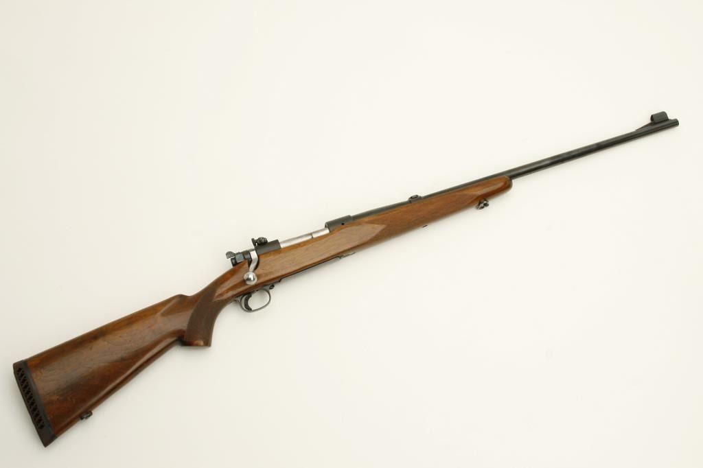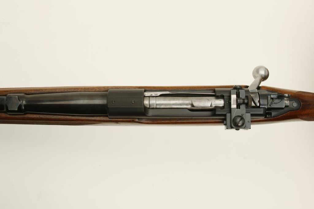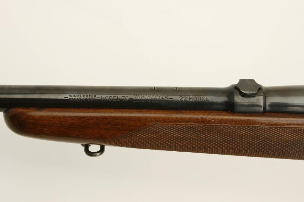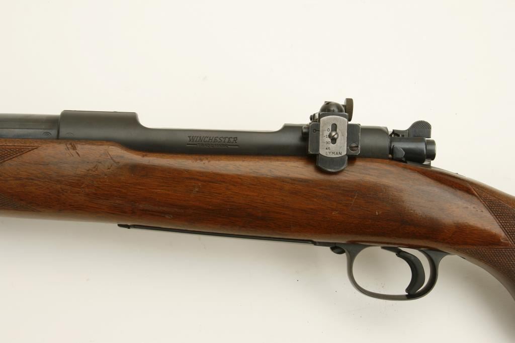 Hornet caliber, 24” barrel, blued finish, checkered wood stock with Livermore and Meyers hard rubber butt pad, S/N 48651, in overall very good to fine condition, receiver and barrel tapped for scope mount, Lyman adjustable receiver mounted sight with hooded front sight, fine bore, crisp action, sharp markings and overall very good wood showing handling and scattered old mars and scratches from carry and storage. (C&R). Est.: $1,250-$2,500.